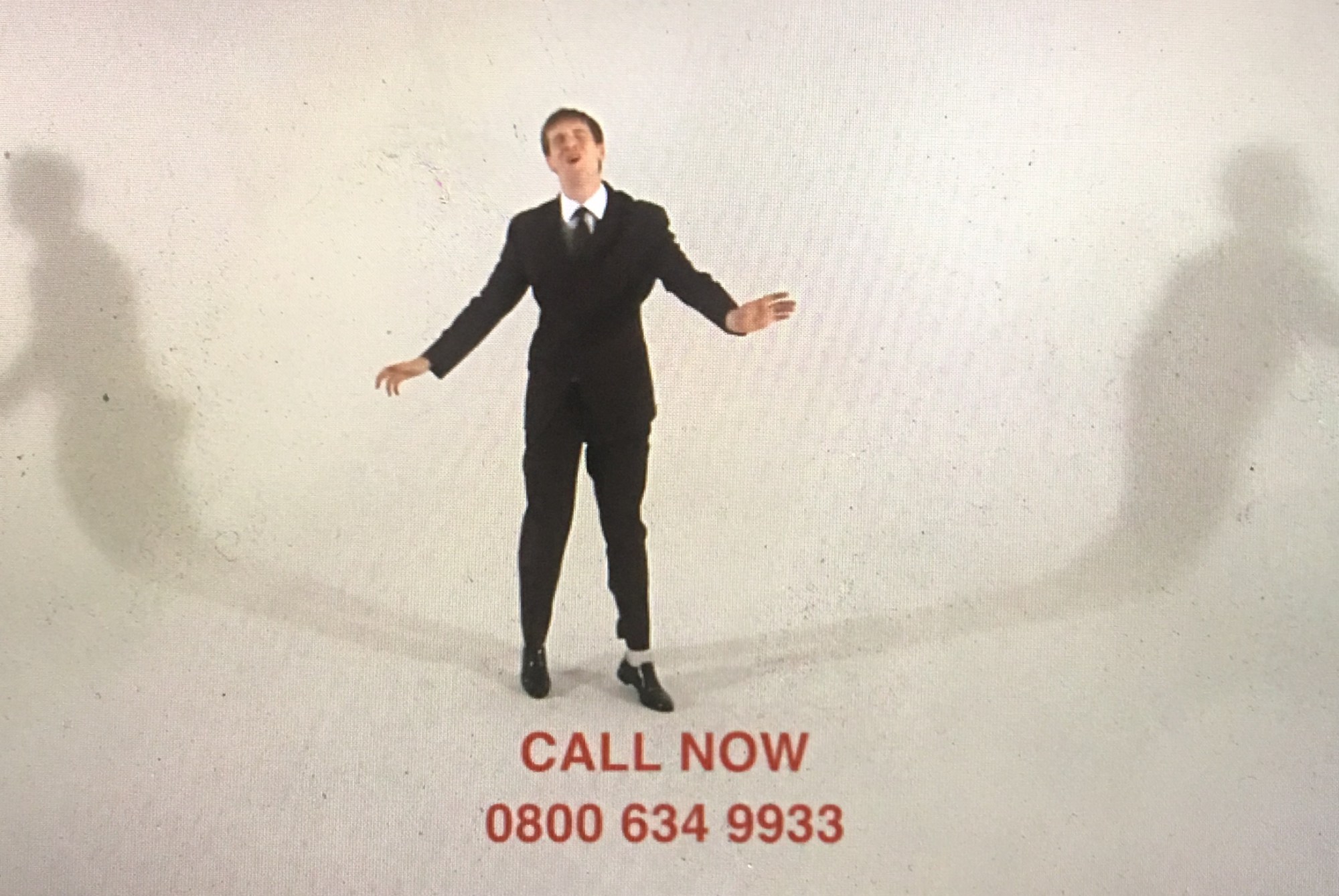 Elsewhere in the space, Matt will be showcasing Singing in the Rain (Hear Me), a video installation featuring the artist dancing, as he comes to terms with his own body dysmorphia and the fraught relationship with his own image. The video also functions as a moving image advert for the 0800 number.