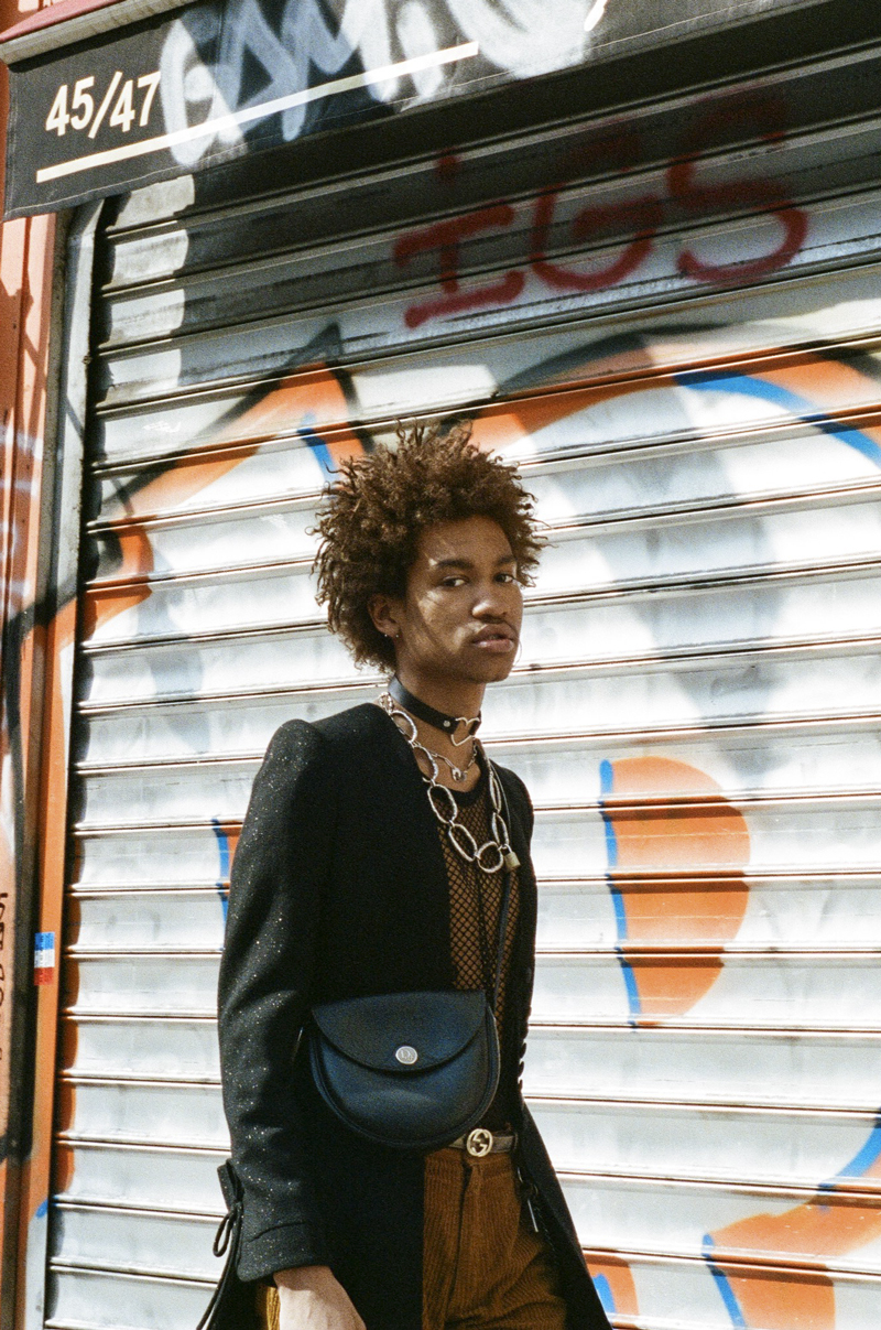 A designer coat, trousers from my own brand Cartel, jewelry, a Gucci belt, a Xuly Bet fishnet T-shirt, a Dior bag, chains, and Buffalo shoes.