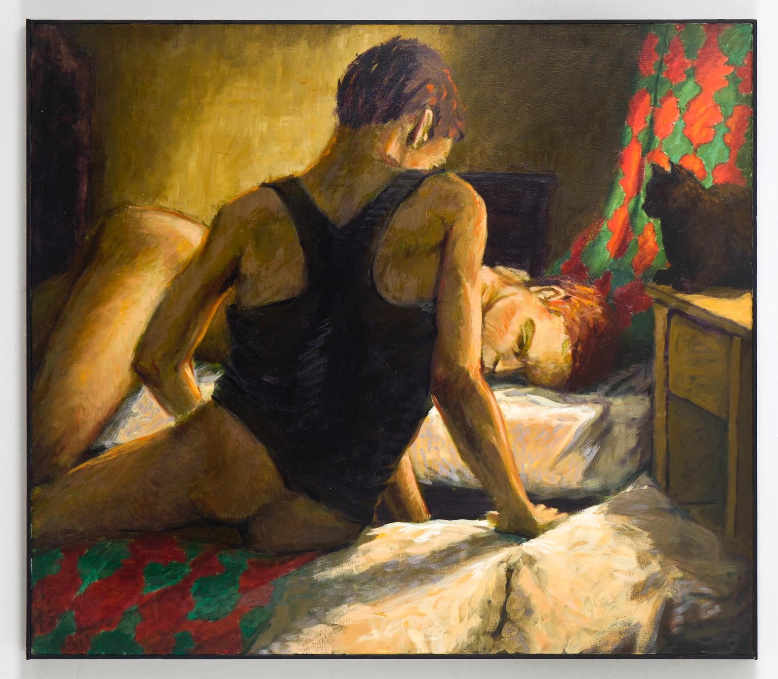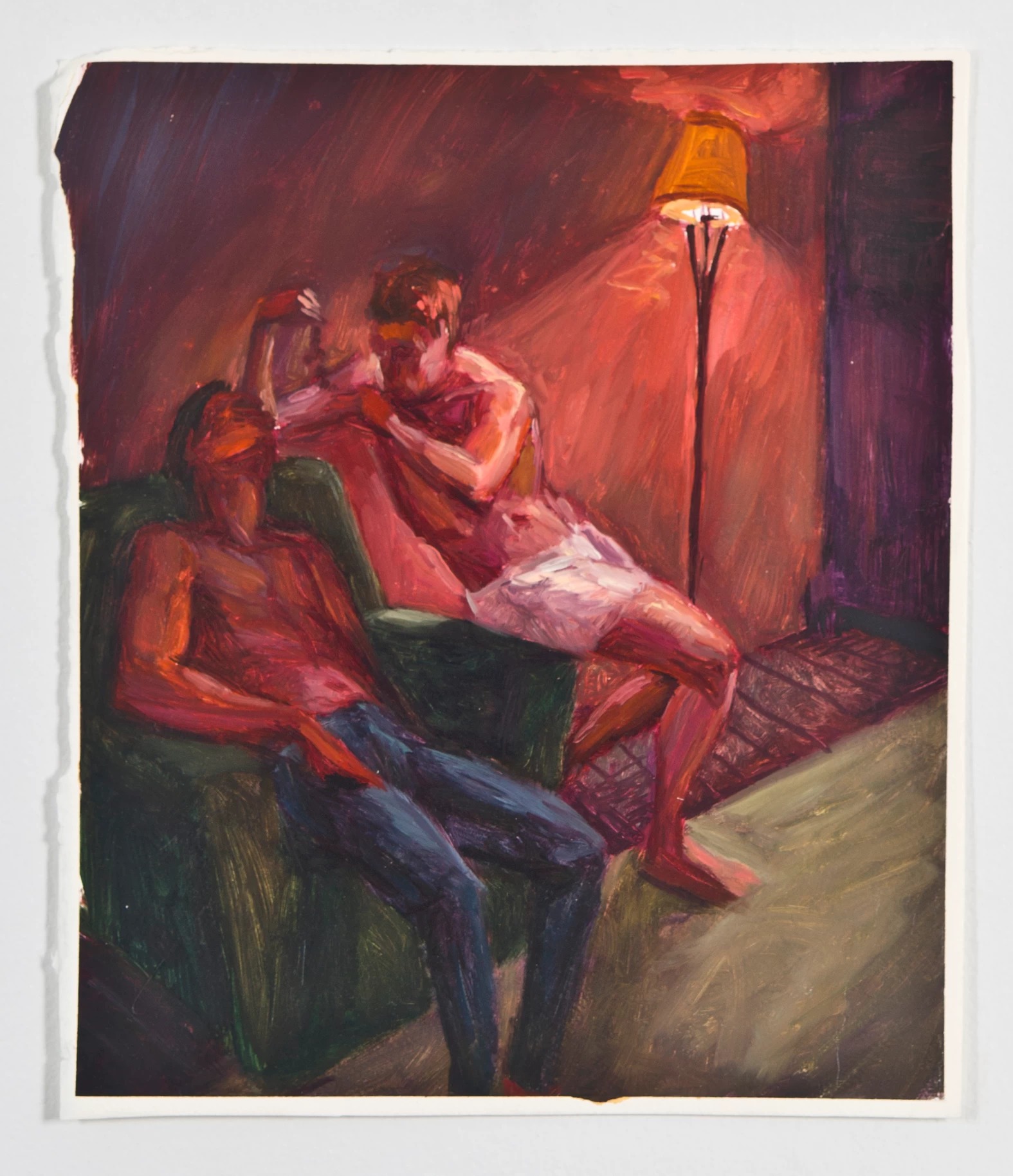 The late Hugh Steers painted queer men living with HIV/AIDs during the 80s and 90s through a humanist prism. In his hushed oil paintings, suffering intermingles with passion. A man wearing an adult diaper holds his partner near and dear. A patient makes room on his deathbed so he can cuddle with his lover. The scenes all take place in small city apartments, the domestic settings subtly touching on how HIV and queerness, both laden with stigma during Steers’s lifetime, were forced into private spaces. For example, in the 80s, numerous doctors flat-out refused to treat people with HIV/AIDs. (“I’ve got to think about myself; I’ve got to think about my family,” a Milwaukee doctor once told the New York Times.)