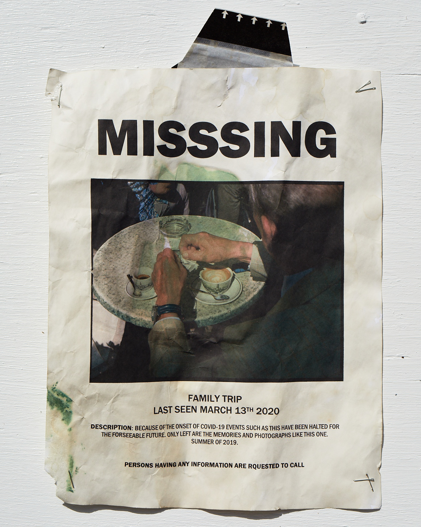 Stylist Gabrielle Marceca and photographer Jon Ervin wanted to make a project to commemorate quarantine when it seemed like it would never end — which now, in New York, seems like a reality, as we read about surges in the rest of the country (and world). They placed posters around the area featuring things they missed, not all of them tangible, and photographed them in situ. “With this time of self-isolation seemingly never ending, and the future of the normalcy we once knew beginning to dissipate, we wanted to create an ode to all of the intangible things we are missing,” they say of the work, which they photographed in Port Jefferson, Long Island.