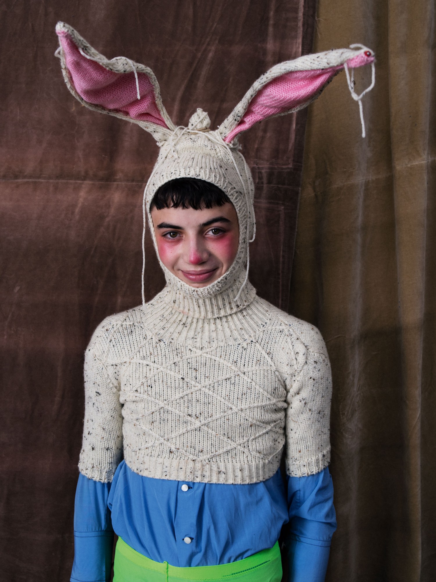 Hal wears jumper Gareth Wrighton. Shirt Wales Bonner. Tights Marks and Spencer.