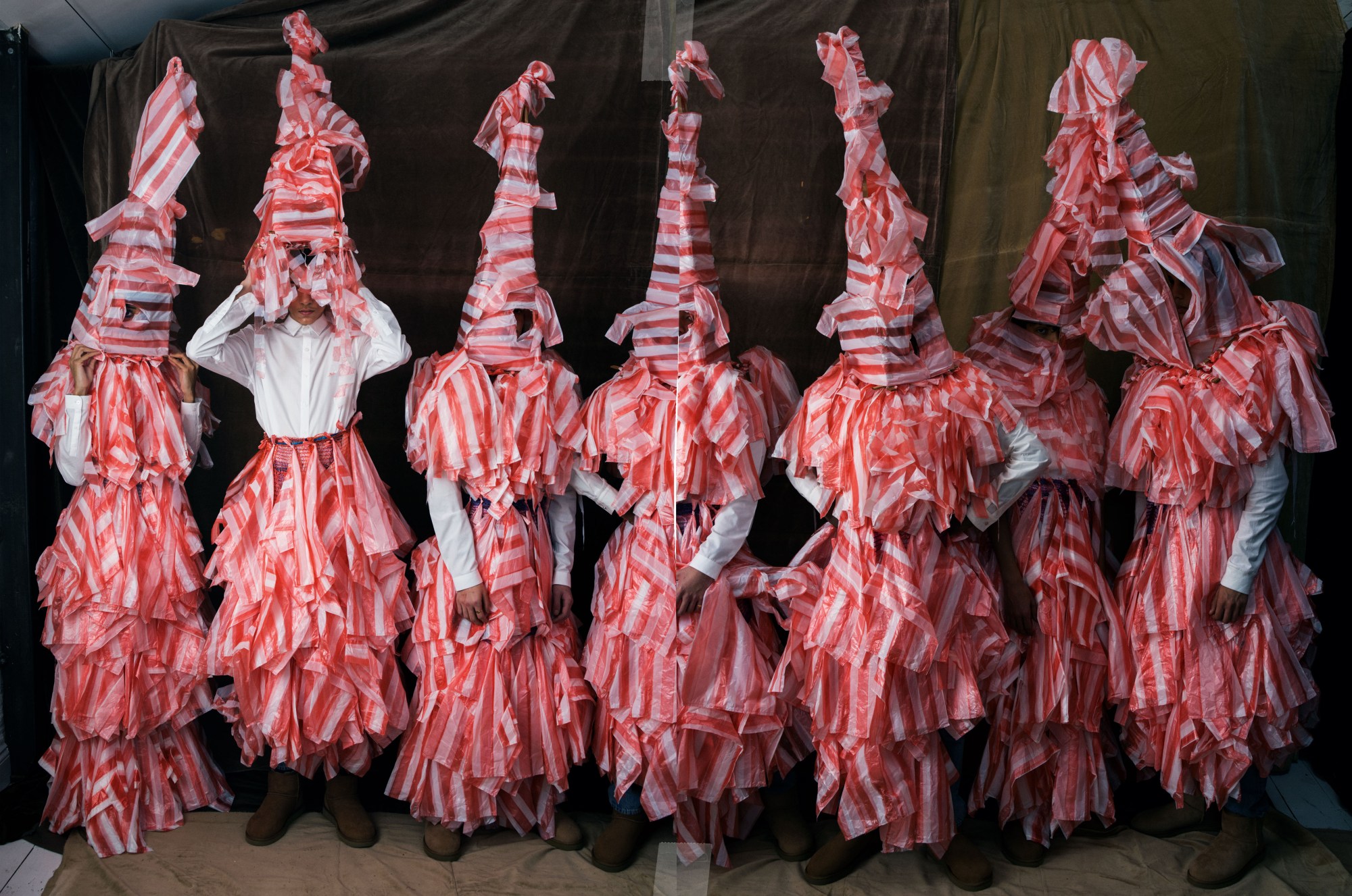 Jess wears jacket and skirt Edwin Mohney. Hat Nasir Mazhar. Glasses ibkamarastudios. Tights Marks and Spencer. Trainers Giuseppe Zanotti. Quinn wears top stylist's own. Jacket and trousers Wales Bonner. Hat ibkamarastudios. Bag Topshop. Trainers Rucoline. Alexander wears jumper, briefs and bag Versus. Hat and mask ibkamarastudios. Shoes around shoulder Giuseppe Zanotti. Trainers Giuseppe Zanotti. Antonie wears ears and shorts Gareth Wrighton. Shirt Carhartt WIP. Tights Marks and Spencer. Sandals Balenciaga. Hal wears jumper and trousers Gareth Wrighton. Shirt Wales Bonner. Bag Topshop. SOSU wears t-shirt Marc Jacobs. Ears and trousers Gareth Wrighton. Shorts River Island. Trainers Giuseppe Zanotti.