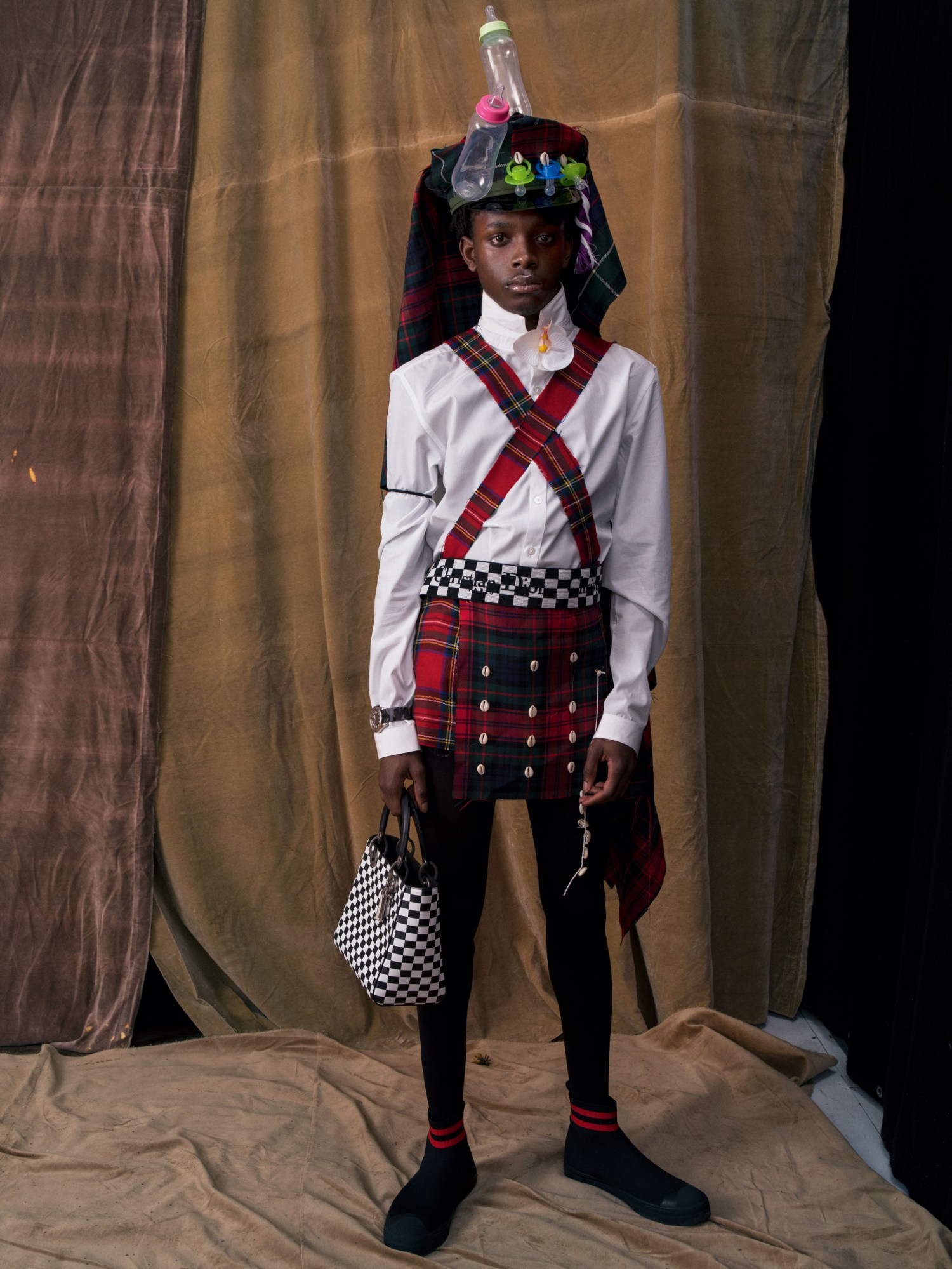 Sammuel wears shirt Fendi. Skirt and hat Burberry at ibkamarastudios. Bag and belt Dior. Watch Tudor. Trainers Neil Barrett.