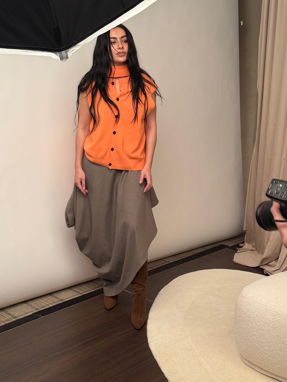 Tish Weinstock: The great thing about The Moment is that it blends fiction with reality, and you’re not really sure where those lines blur. Charli plays a fictionalized version of herself, so everything’s rooted in something familiar. We shot in a studio where I’ve actually done fashion shoots before, so that felt quite meta and weird… The scene riffs on a “Vogue, Charli, what’s in my bag?” video, so even though there was something off about it, it could have just been my life!