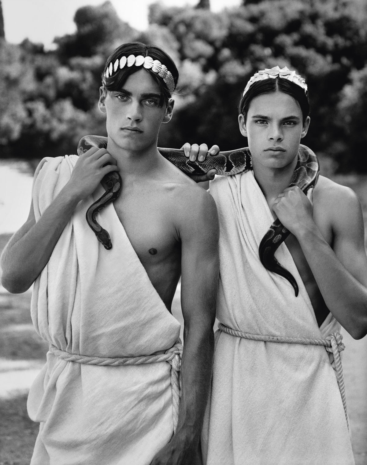 Saskia wears toga Yohji Yamamoto. Crown Costume Studio. Cuff Herv Van Der Straeten. Henry wears skirt Costume Studio. Crown Rosantica. Jack wears skirt Costume Studio. Crown Lady Evelyn.