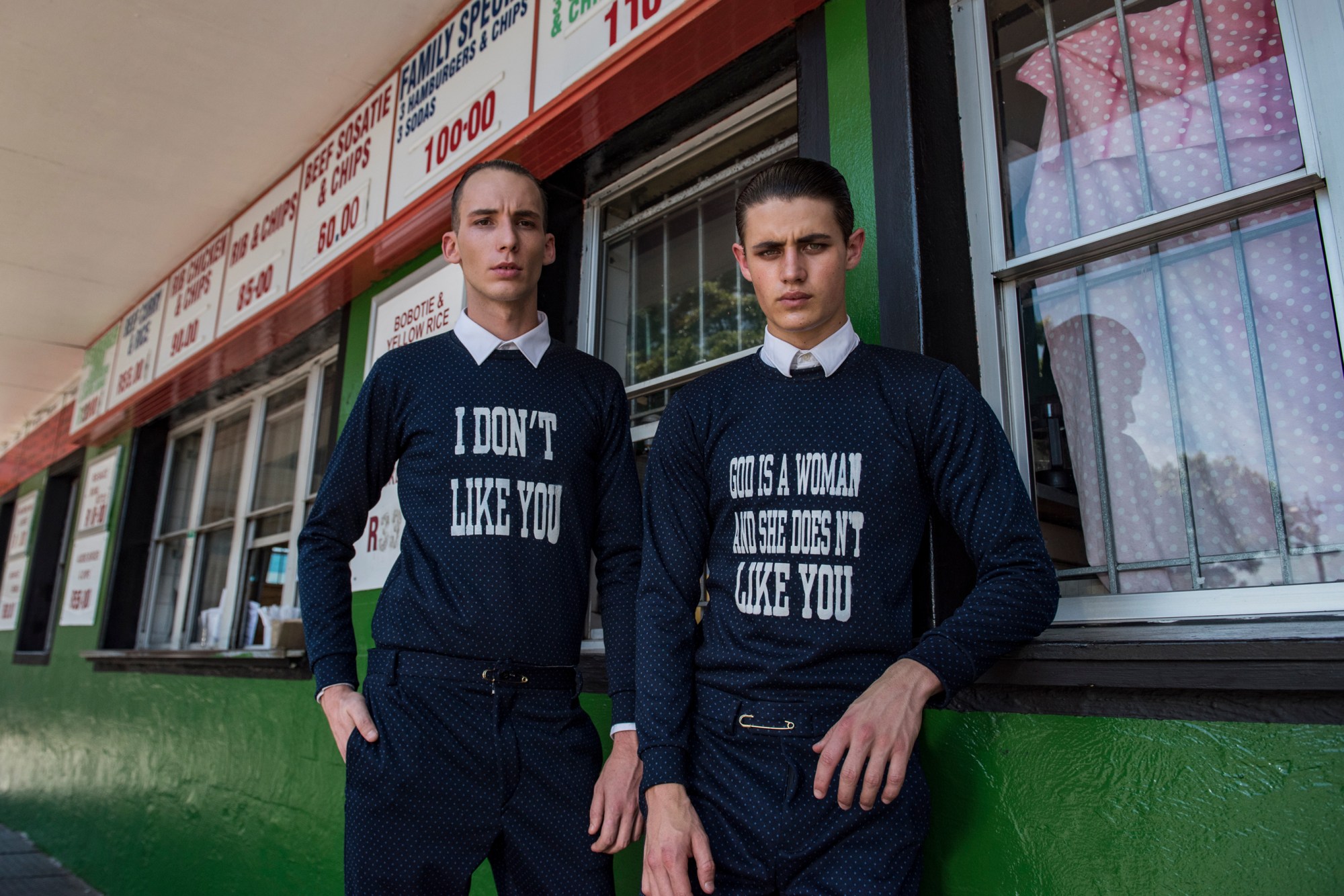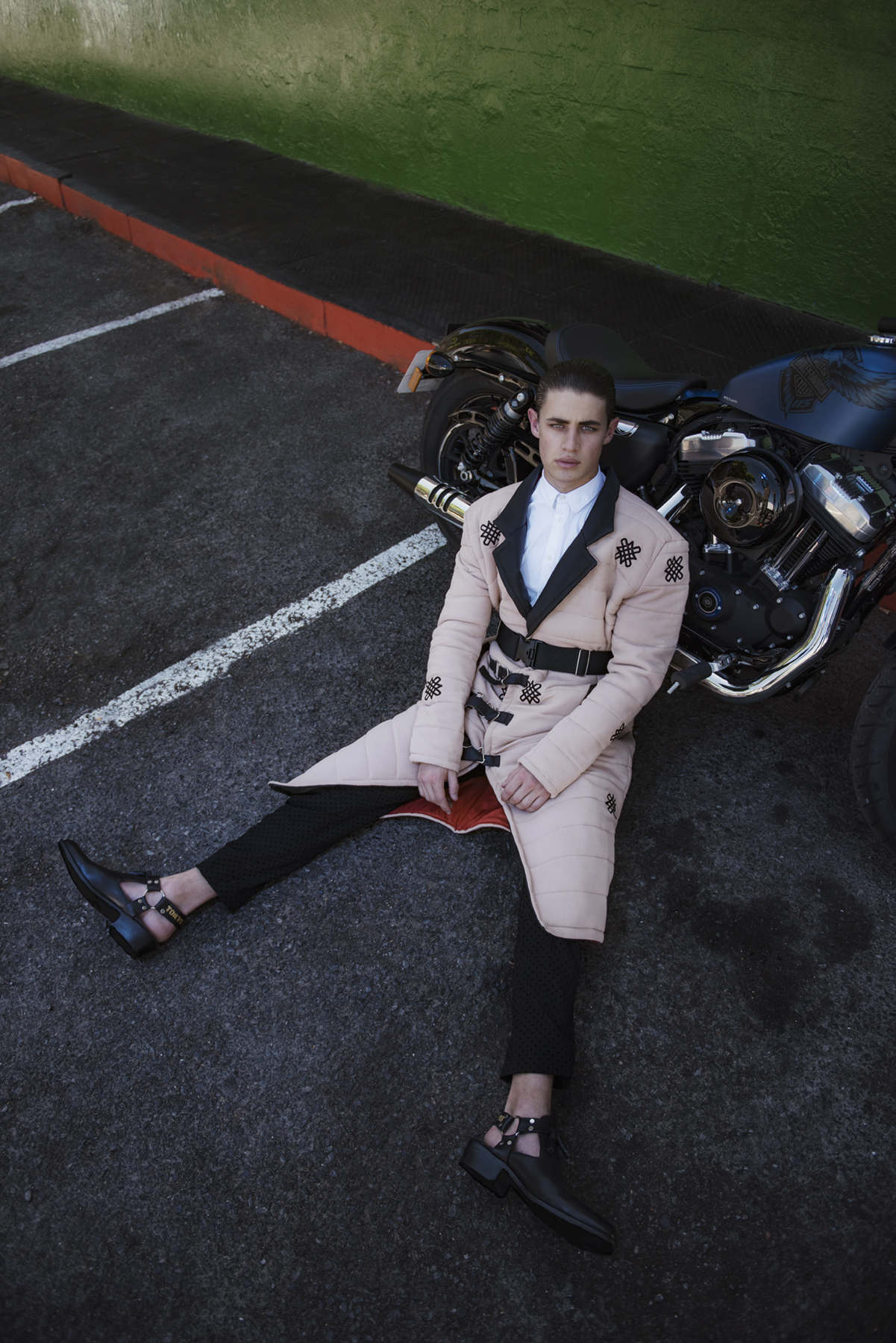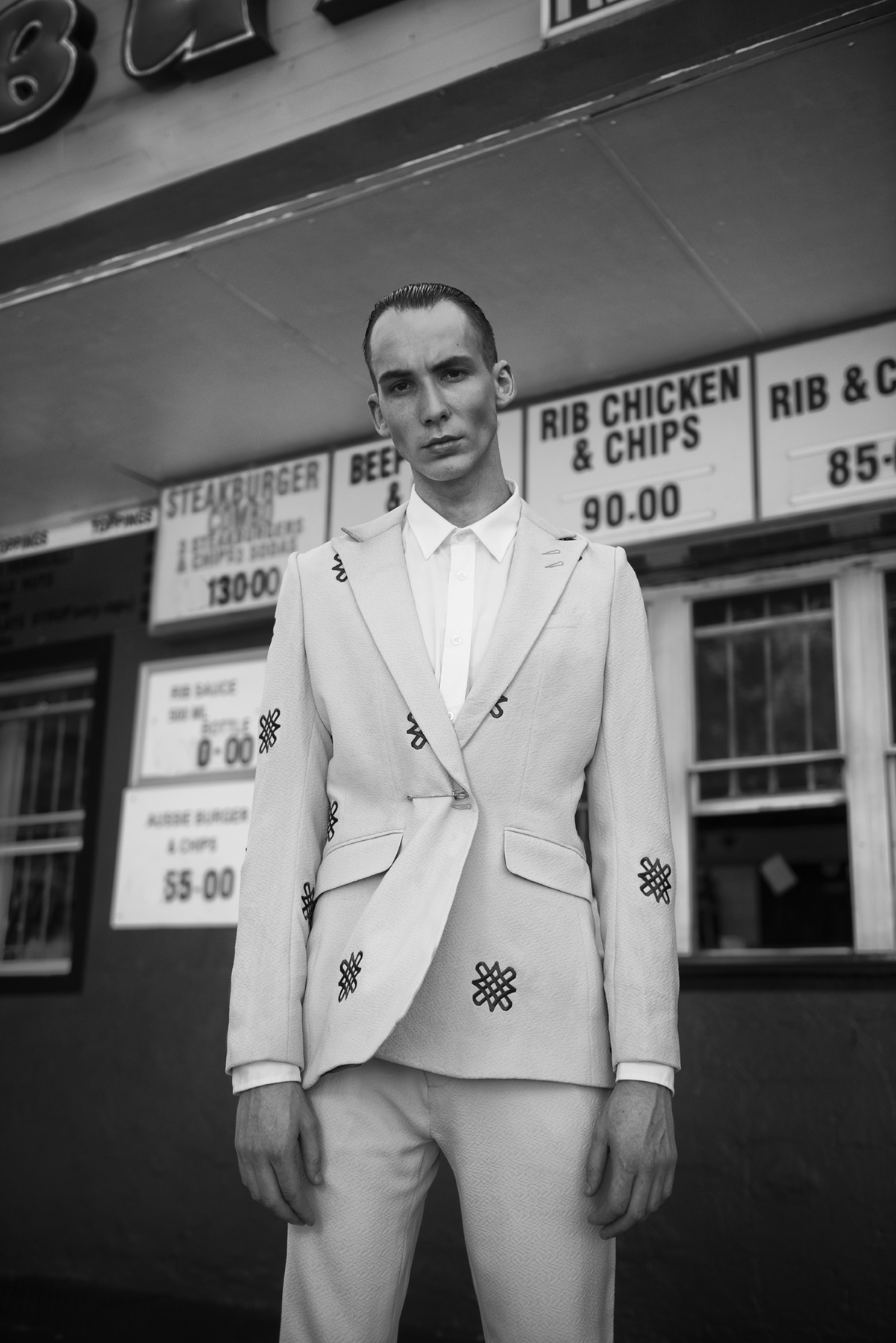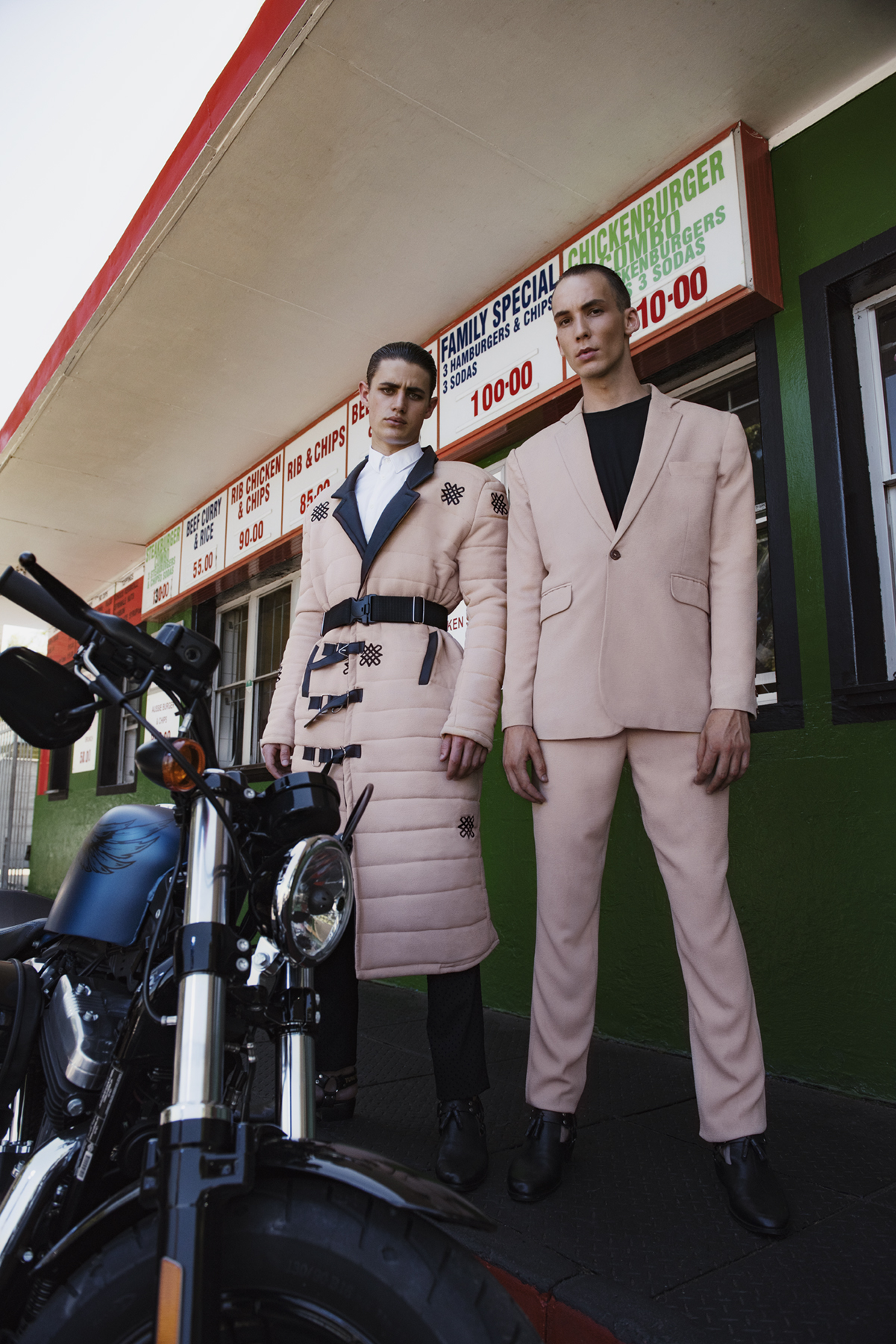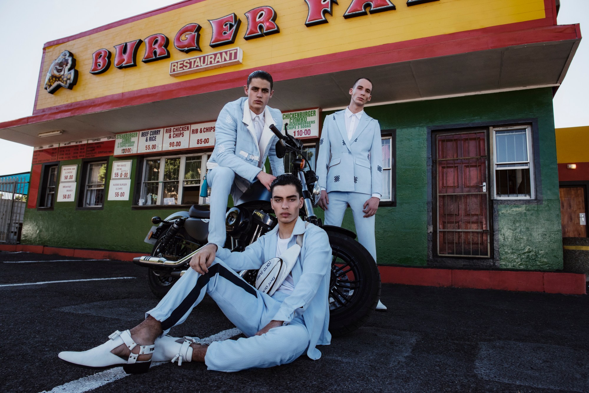 To create the collection’s lookbook, Tokyo teamed up with a longtime collaborator, the photographer Anika Molnar, for a shoot in Cape Town––where his career officially began. The collection was captured in a parking lot of a colorful fast-food restaurant; tall, handsome models with greased back hair sported a range of pastels that appeared in direct contrast to the shoot’s busy surroundings and large motorcycle prop. This visual contradiction was carefully curated to show the diverse range of spaces both suits and the Tokyo James man can live in. “It comes down to the very strong ethos of the brand––simplicity with edge,” said James about the lookbook. “The hard background of the surrounding stands for the edge. It’s to show the duality of the man; that he can both be soft, and at the same time, also hard and strong.”