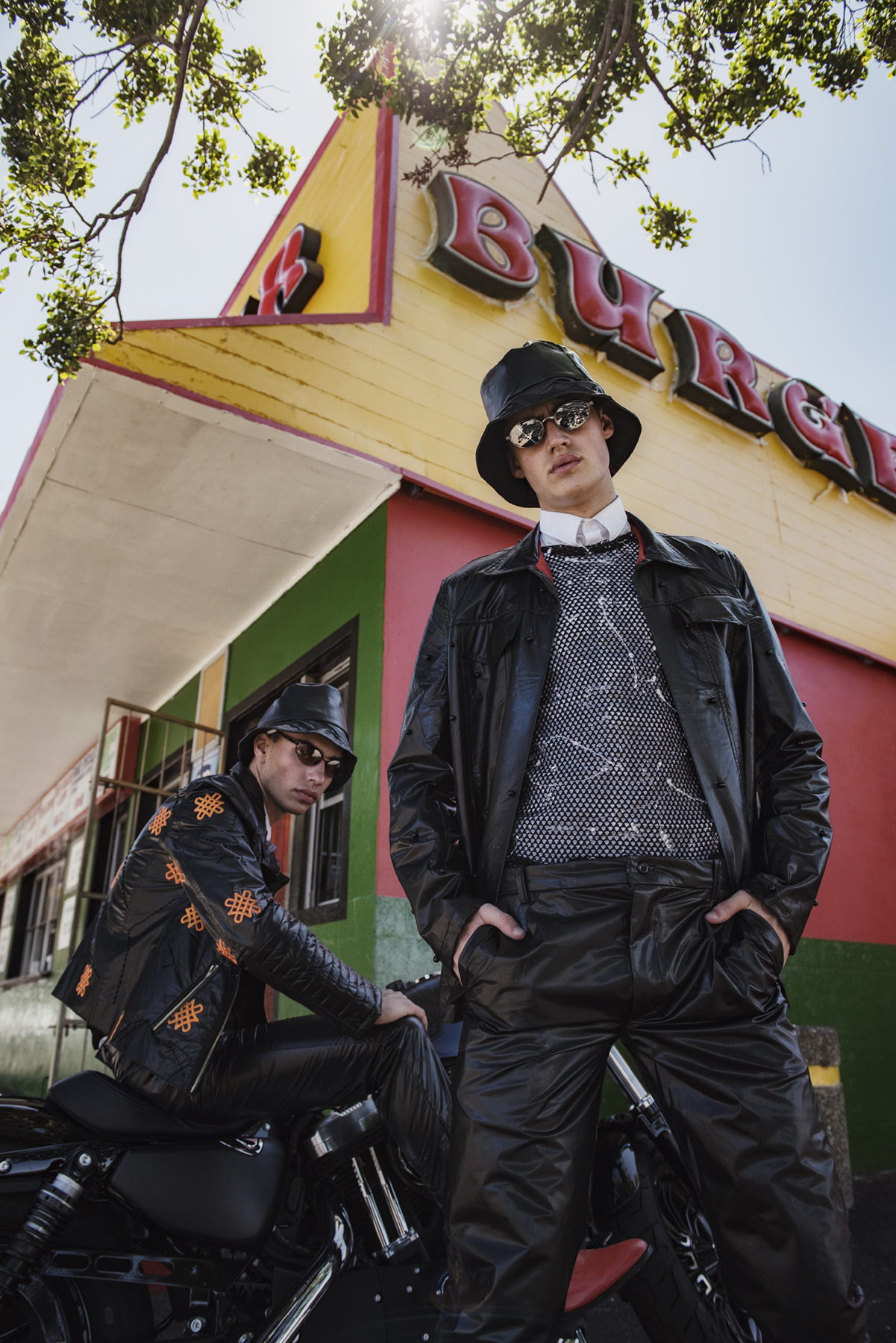 The styling of the lookbook also communicates the sartorial range of the Tokyo James man. All at once stylist Danielle Solomon, paired a netted, splatter paint shirt over a crisp white button up, and added a waxed bucket hat to match the two-piece waxed jacket and pant set. In another photograph a suit, a casual sportswear look, and biker ensemble all co-existed in a unifying pastel blue. In the end, the team behind the lookbook maintained the true Tokyo James aesthetic of piecing together drastically different design elements and making them work in drastically different spaces.