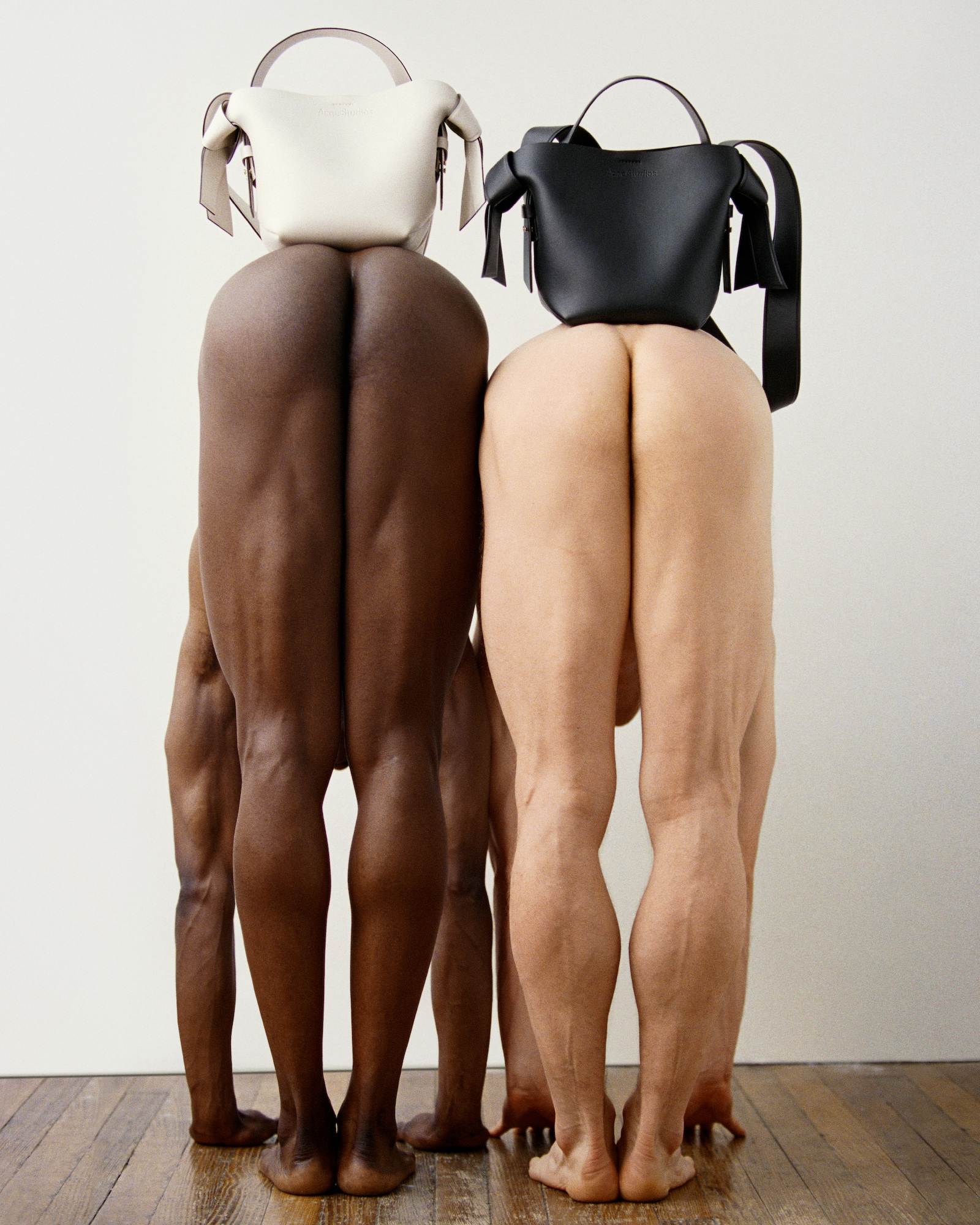 Sometimes you pick a bag to go with your outfit, and sometimes a bag is such a statement piece the only look that can be just as striking is your birthday suit. To showcase their iconic Musubi bag, Acne Studios sent over a bunch of the Italian leather bags – uniquely tied with twisted knots in a traditional Japanese Obi Sash style – to NYC artist Talia Chetrit to capture them as she wished. The result? An incredibly intimate shoot where two naked dancers pose with the cowhide pressed against their human skin, covering their modesty, balanced above their butt cheeks and pressed sensually against their face. The idea behind it was that the two dancers have the same qualities that the bag also holds: strong, supple, desirable. For SS22, the bag will also come in new tote and shoulder bag offerings and launched this week in artistic displays in New York, Los Angeles, Miami, London, Milan and Berlin, so you can see the beauty of Talia Chetrit’s campaign photography IRL. TG
