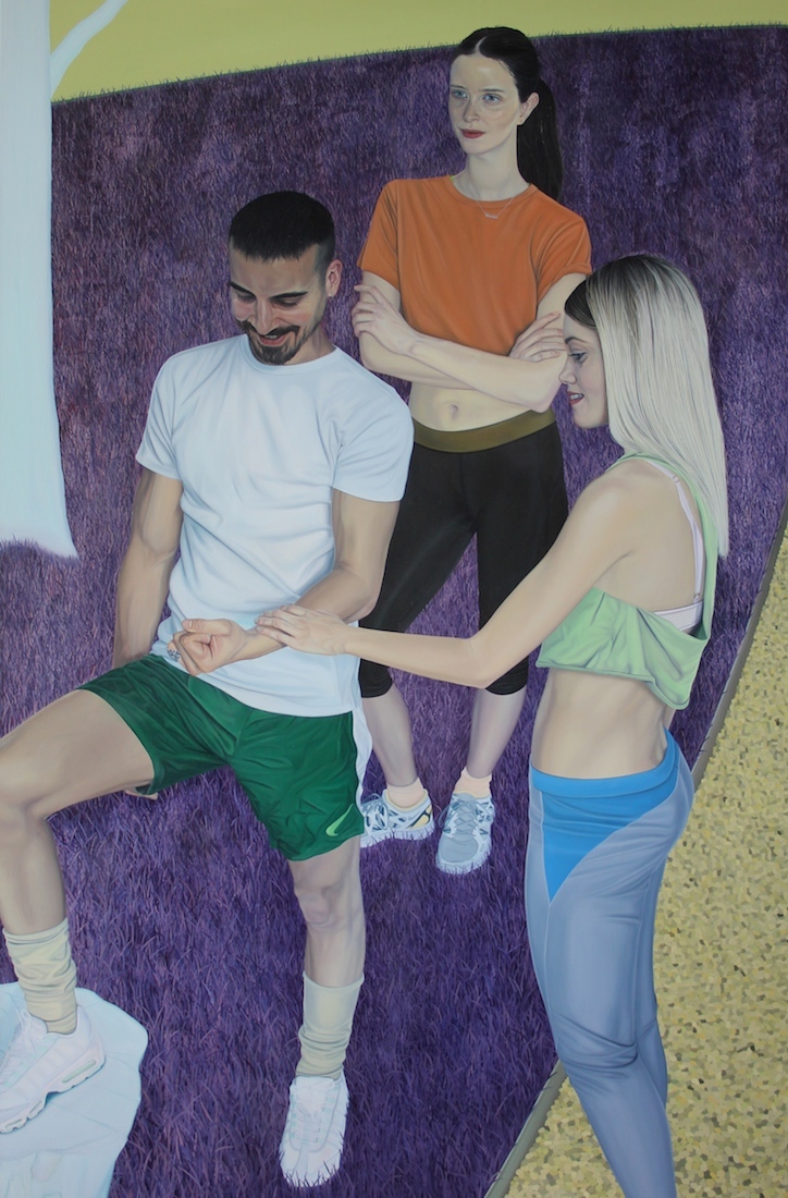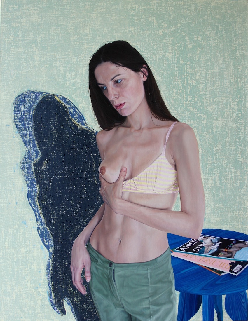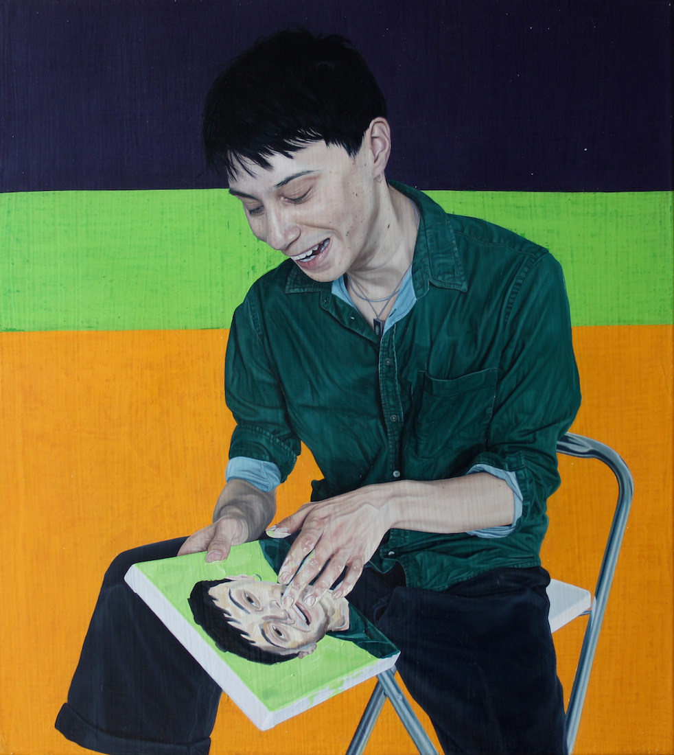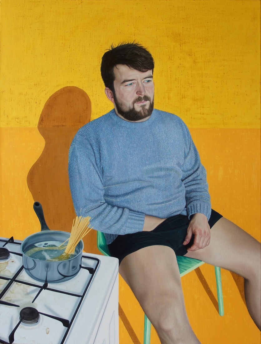 In Big Softie, one of the brand-new pieces he’s showing at a solo exhibition at London’s Cob Gallery this week, a guy sits waiting for his spaghetti to cook with his hand in his boxers. The painting’s one-dimensional ocher background seems to shift the sitter out of his kitchen and into a dreamworld. The image, like many of Tristan’s portraits, challenges our ideas about what constitutes a suitable subject for an oil painting. Tristan’s MO – honed at Camberwell College of Arts in London – is to playfully undermine the self-importance we assume in documenting ourselves and each other.