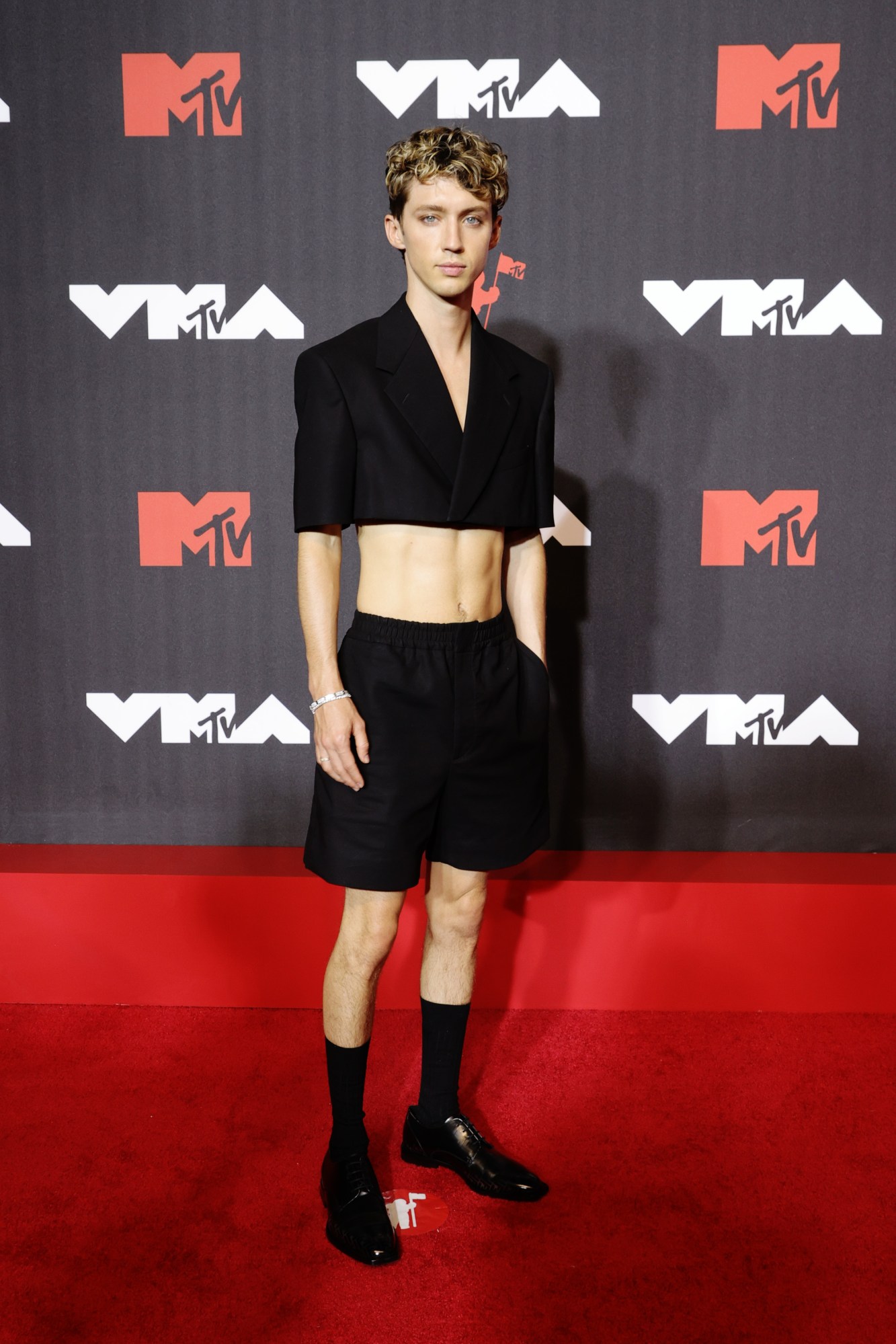 Days after dropping “Angel Baby”, his queer, mega-pop power ballad — “I thought we needed a few more of those,” he told Just Jared — Troye made his return to the limelight at the MTV VMAs wearing a fabulously head-turning look perfect for the awards ceremony. The cropped, ab-blaring blazer with matching shorts, socks and pointed shoes was from Fendi’s SS22 collection and marked Troye’s new era as one of the leading celebrity faces of queer fashion in the 2020s.