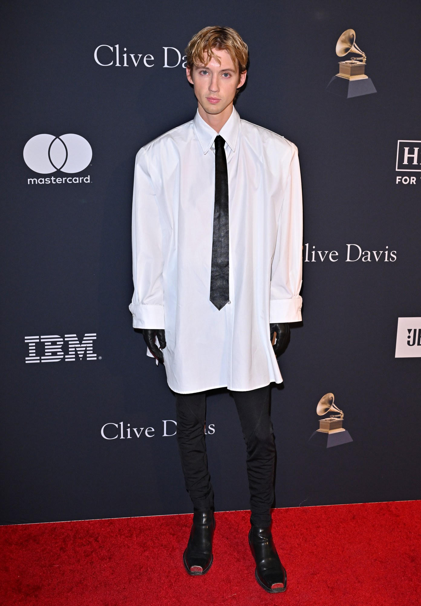 Supporting young queer designers, Troye rocked up to the Pre-Grammy Gala wearing a wide-shouldered, long-line white shirt, uber-tight skinny-fit trousers and a skinny tie, all from Louis Gabriel Nouchi’s newly showcased AW23 collection.