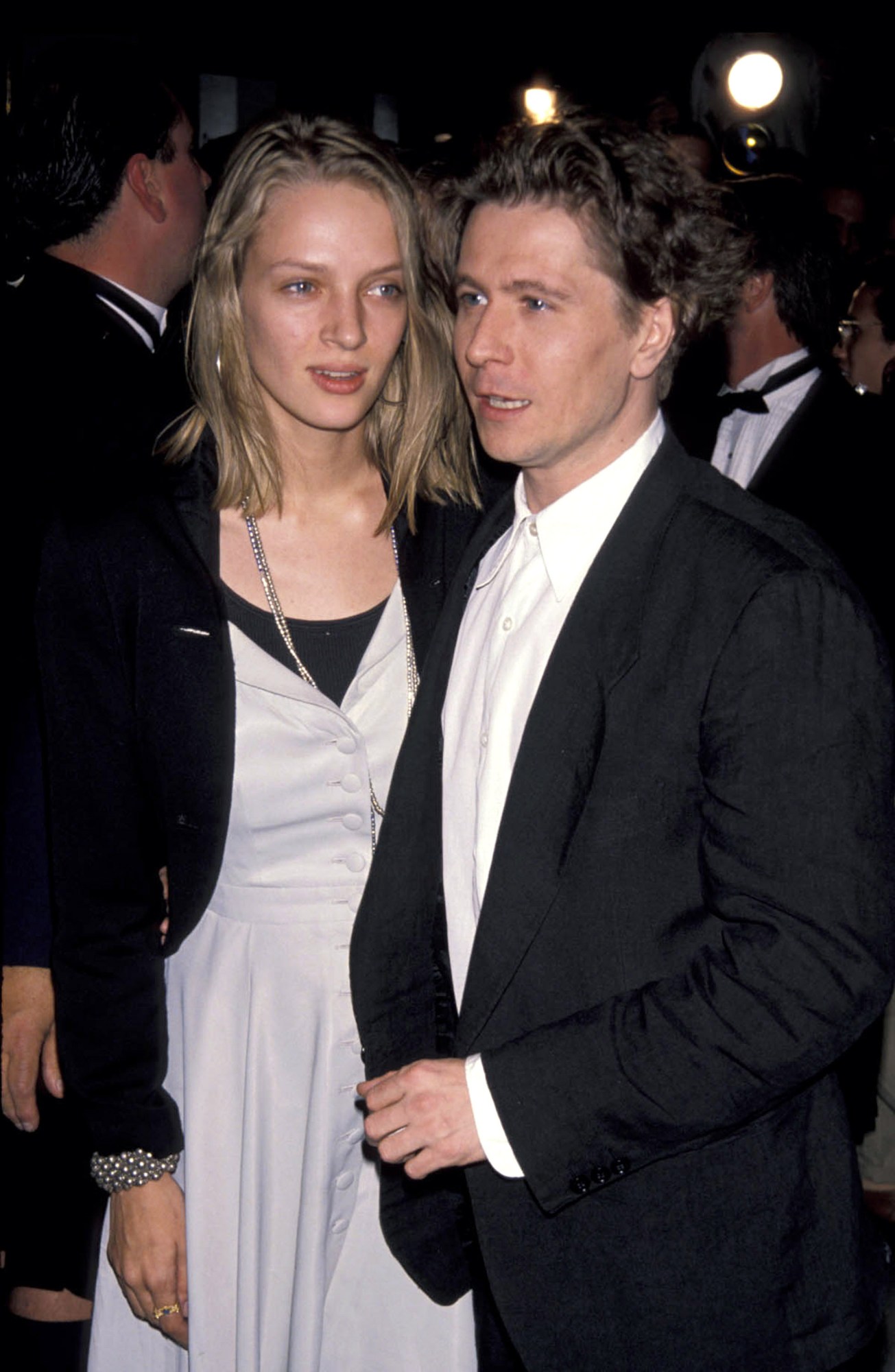 After deciding to pursue a career in acting, Uma landed her breakout role in the 90s period drama Dangerous Liaisons, starring opposite Hollywood heavyweights Glenn Close and John Malkovitch. Throughout the early 90s, at the beginning of her career, Uma kept things ultra low-key on the red carpet. Think coatigans, black-on-black looks and baggy pantsuits. Here, attending a film premiere with then-husband Gary Oldman, she wears a buttoned dress, layered over a black tee and under a black blazer to keep things looking casual.
