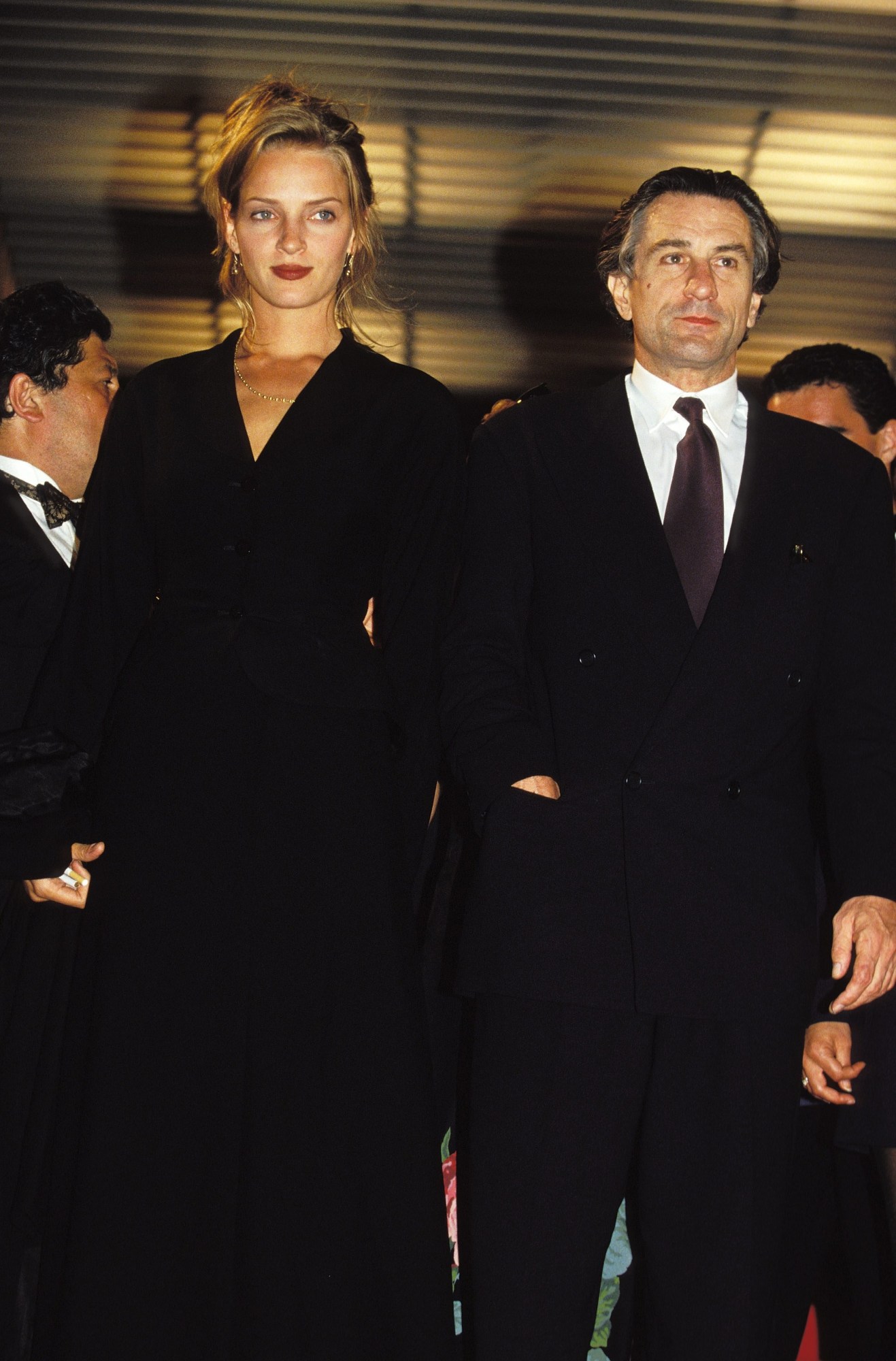 For her first time at Cannes, we see a more polished iteration of Uma’s low-key formal style. Attending the premiere of the movie Mad Dog and Glory with co-star Robert Di Niro, she wears her usual black-on-black tailoring. The look, however, is elevated with a belted hourglass waistline that nods to a Yohji Yamamoto-inflected elegance.