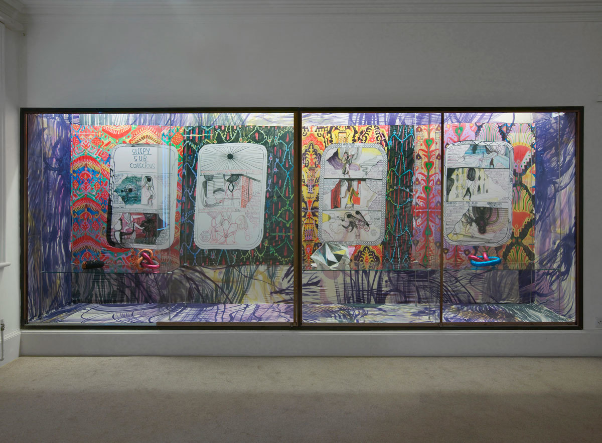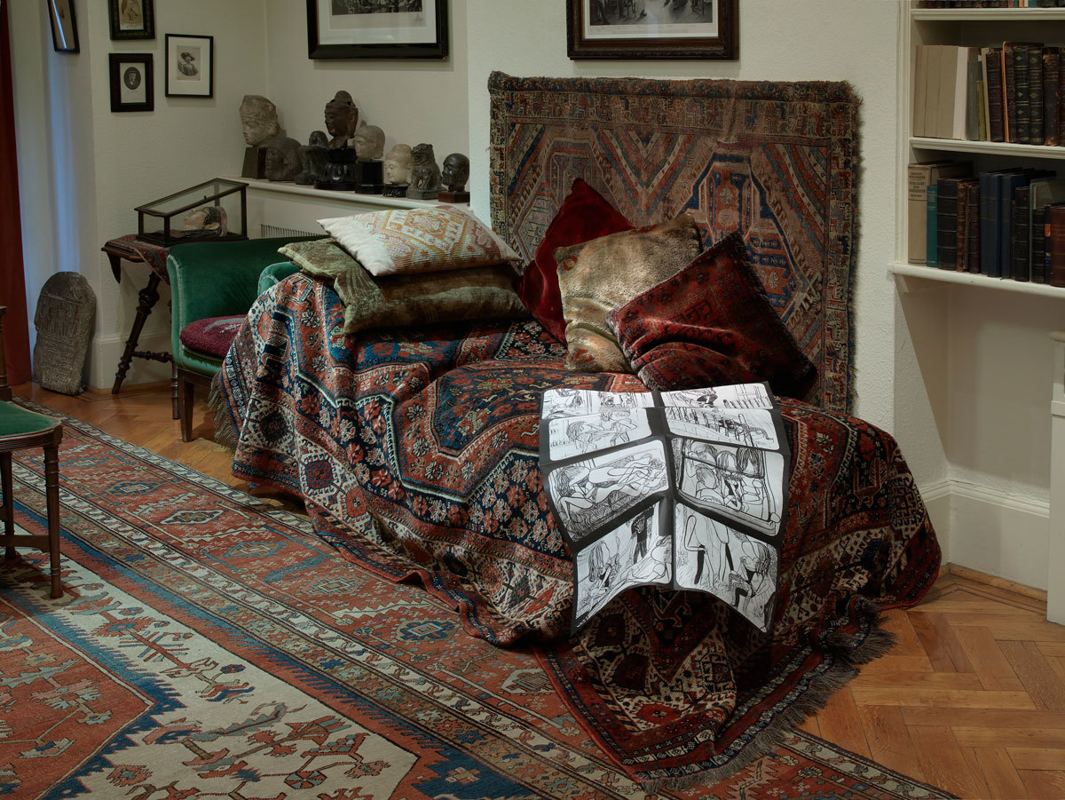British artist Emma Talbot is known primarily for her work as a painter who reformats biography and autobiography into memory and fantasy. She’s an artist who pushes the medium of painting in a variety of directions — taking on methods of storytelling that are perhaps more closely linked to the function of historical or even religious artworks, as well as print media, as orators; and treating the material onto which she paints as complicit in the execution of the work. Her current show at The Freud Museum, now entering its last week, demonstrates the variety of ways in which she has expanded the role of painting. An interesting space, not only because of the house’s former owner’s famous work, and the work of his daughter, Anna Freud, who is considered one of the founders of child psychology, but also because the museum functions as a space that challenges your usual act of viewing artwork.