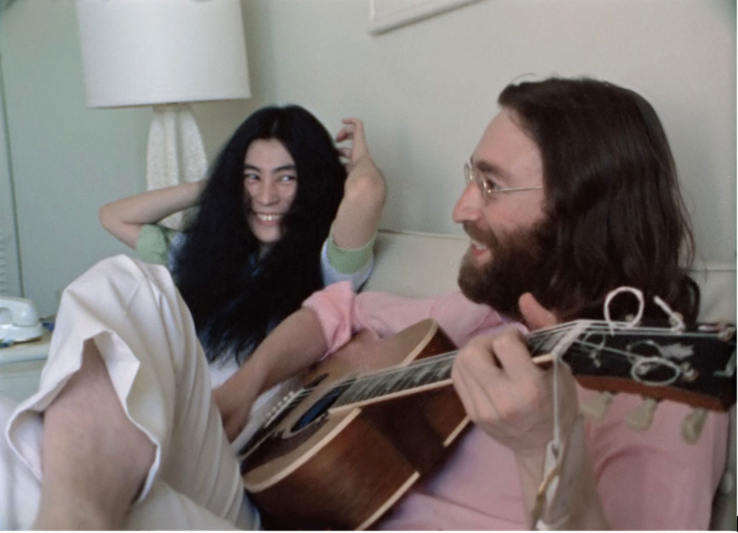 The video pans from a sunny balcony shot of the beach below to John and Yoko on their hotel bed; John playing guitar and rapidly ad-libbing verses before Yoko joins him for the famous chorus.
