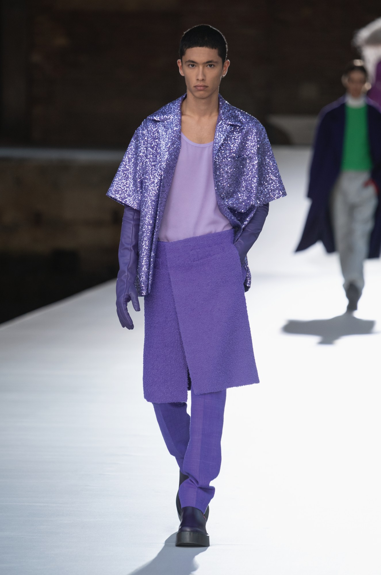 Where that made itself felt most intensely was in the incredible intensity of the palette. Slash-neck cashmere capes with swooning drapes came in lilac and ochre, coral and pine green, and there were ostrich plume hats and pencil skirts in lavender, ivory and maroon, flouncing like sea anemones on a gentle ocean current. Drifting past an all-white-wearing audience, they read like brushstrokes in motion. Elsewhere, Pierpaolo’s painterly inspiration translated more literally. Building on his reputation as one of the fashion world’s most enthusiastic patrons of the arts, he invited 16 artists — Jamie Nares, Wu Rui, and Patricia Treib among them — into the Maison’s ateliers. There, they worked alongside the petites mains — — all of whom were credited in this season’s collection notes — to transpose their celebrated tableaux onto the most sumptuous cloth. Five of Treib’s works, for example, found a new canvas in the form of a flouncy ballgown, while Nares’ vivid brush strokes coloured a cape and floor-trailing tunic, requiring 107 metres fabric and 700 hours of handwork to create.