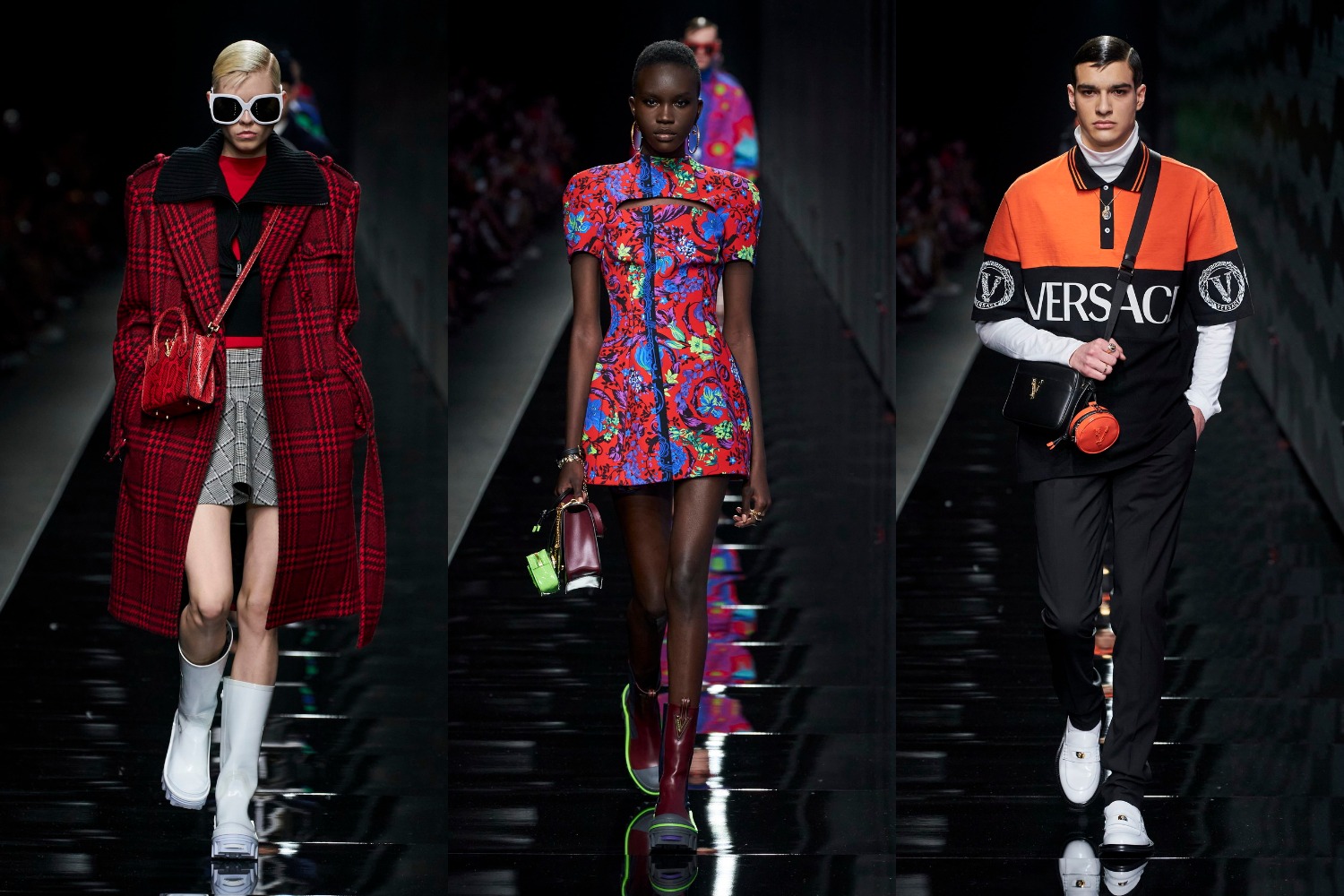 Versace AW20 But beyond that this season, the show felt rooted in the right now, the house’s timeless seen through a modern lens. The mirror-finish set reflected seated guests back, with cameras along the runway projected them on parallel screens — the closest most of us will ever get to being on a Versace catwalk. It was a touching gesture, democratising the veneer of exclusivity and glamour that Versace is built on, if only for a moment. The projections began to morph and twist and abstract themselves into those familiar Versace motifs: a giant gold V, the medusa head.