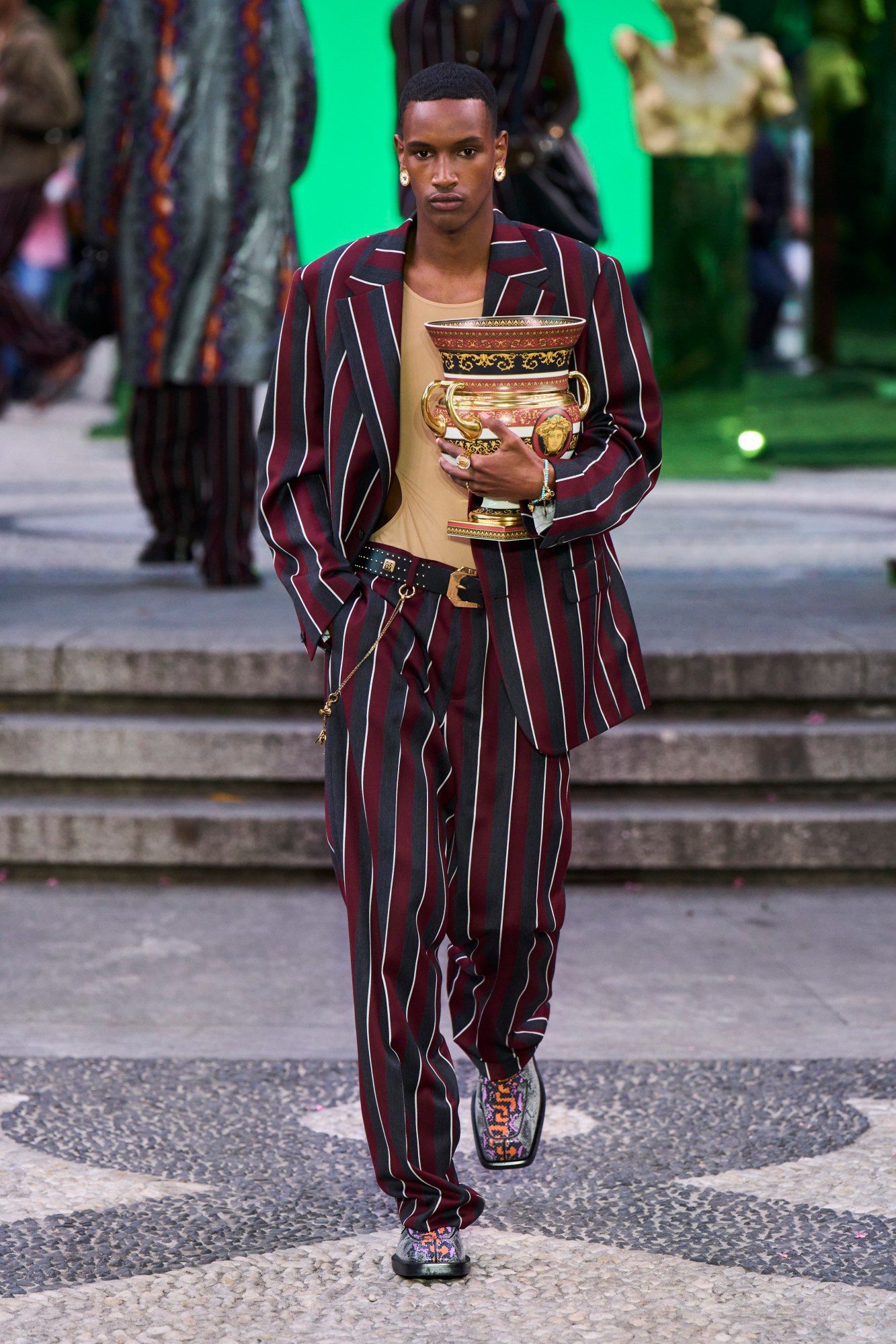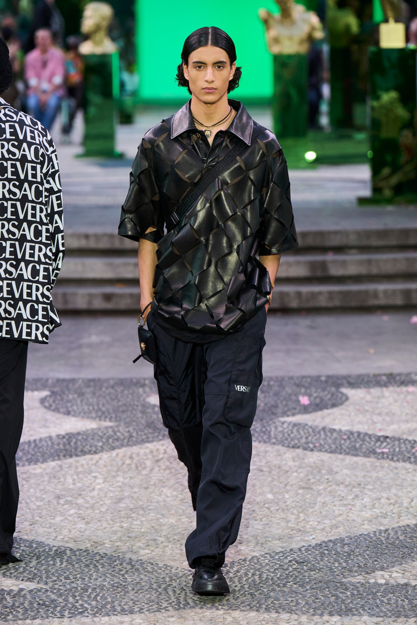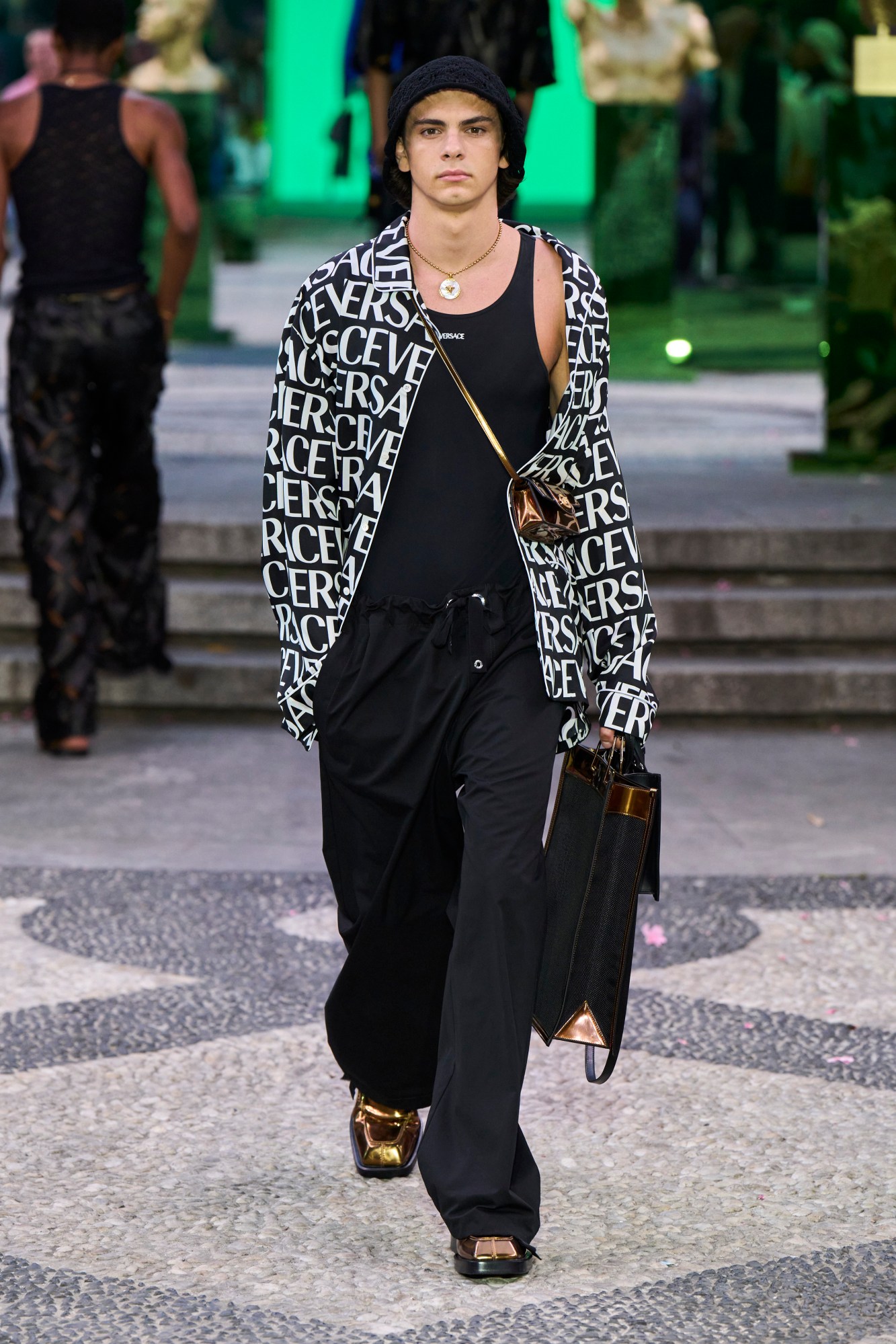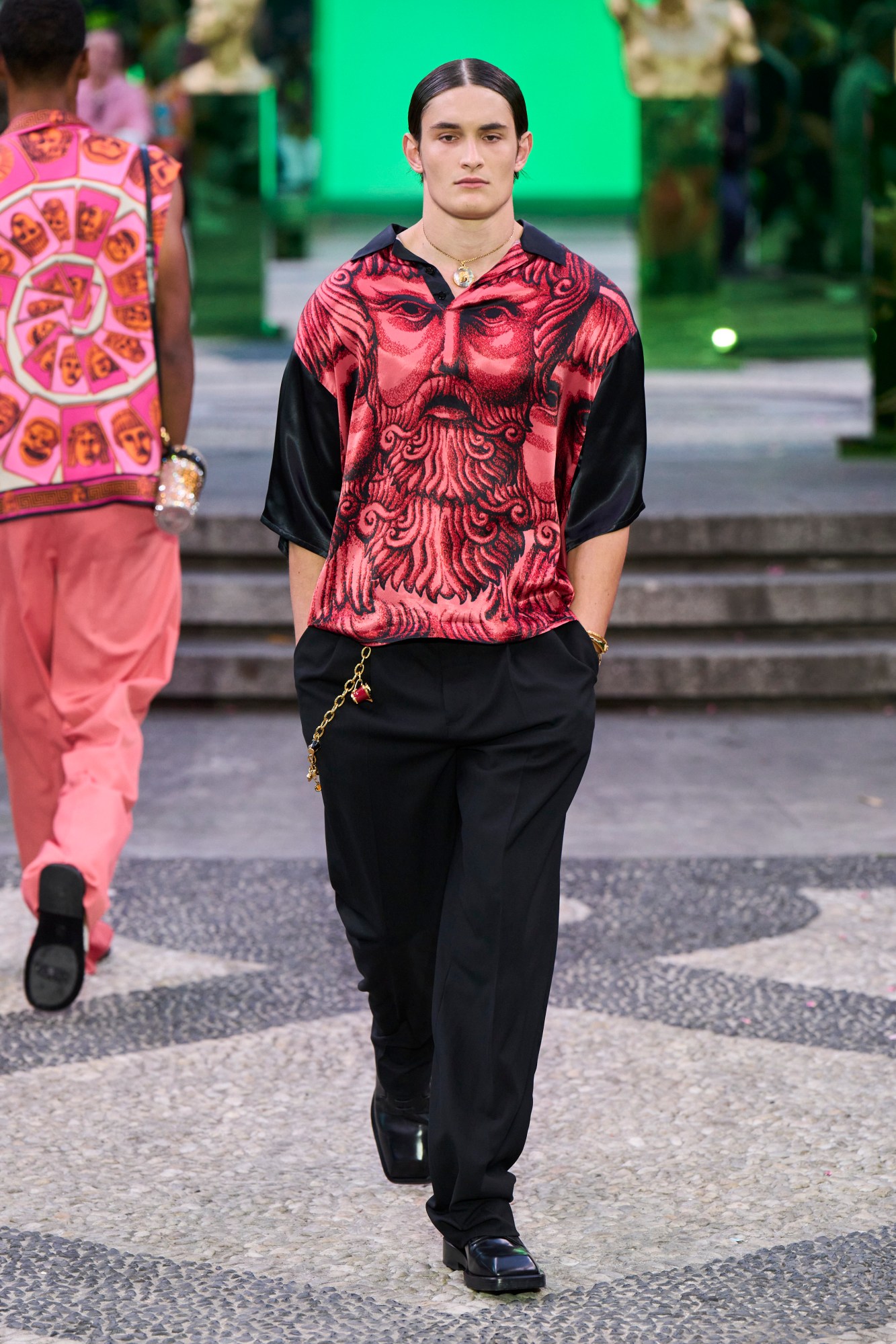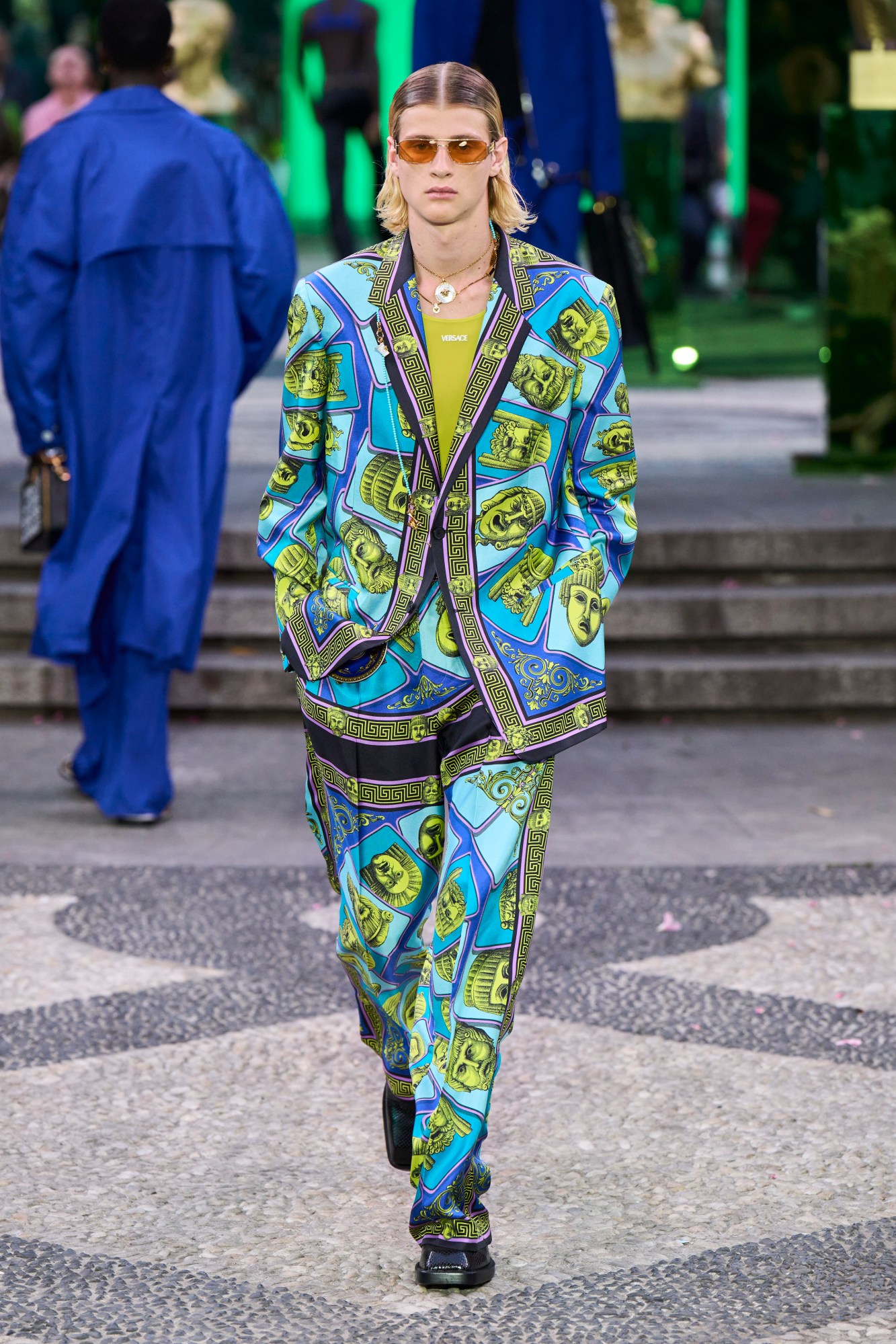 The clothes toed a similar line between familiarity and zany eccentricity, with easily palatable louche suiting in muted stripes and cerulean blue and cargo-pocketed coats offset by the zing of acid python-effet outerwear and highlighter-hued zippered hobo bags and Pompeiian death-mask prints on inky satin polos and trousers that billowed with every step. A flair for logomania proudly declared itself in allover ‘Versace’ prints on silky separates and roomy structured totes – if you’re a Versace boy, you’re gonna wanna let the world know it! – as well as the house’s instantly recognisable glinting gold leaf Medusa motifs.