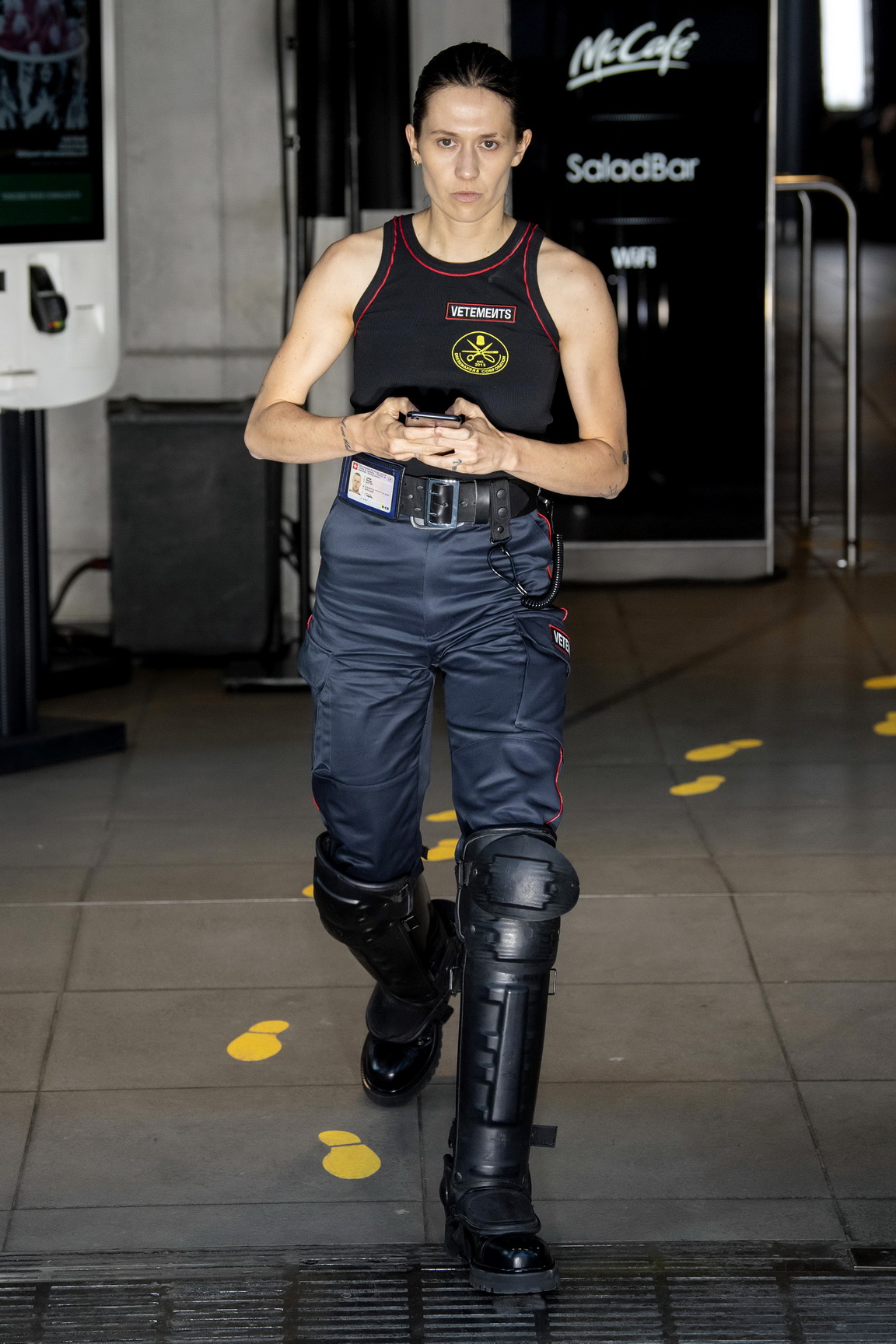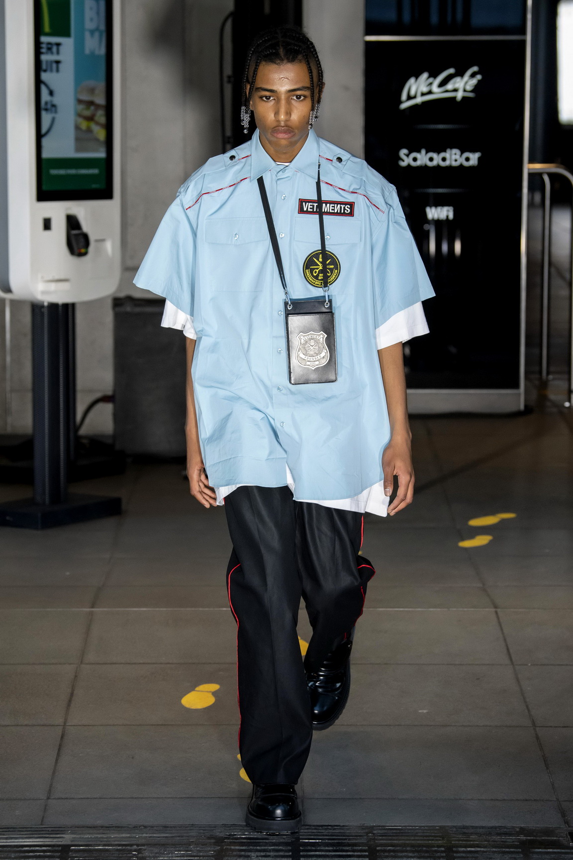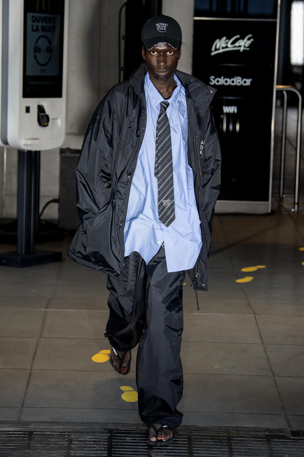 The Vetements spring/summer 20 show might just have been the most Vetements thing we’ve ever seen. From the branded condom invitation, through to the show notes which were stamped onto a napkin, to showing in a branch of McDonald’s on the Champs-Elysées, Demna Gvasalia turned the dial up to 11. Even the napkins hinted at what was to come: ‘Kapitalism’, ‘Global Mind Fuck’, and ‘Böse’, which translates from German as ‘angry’.