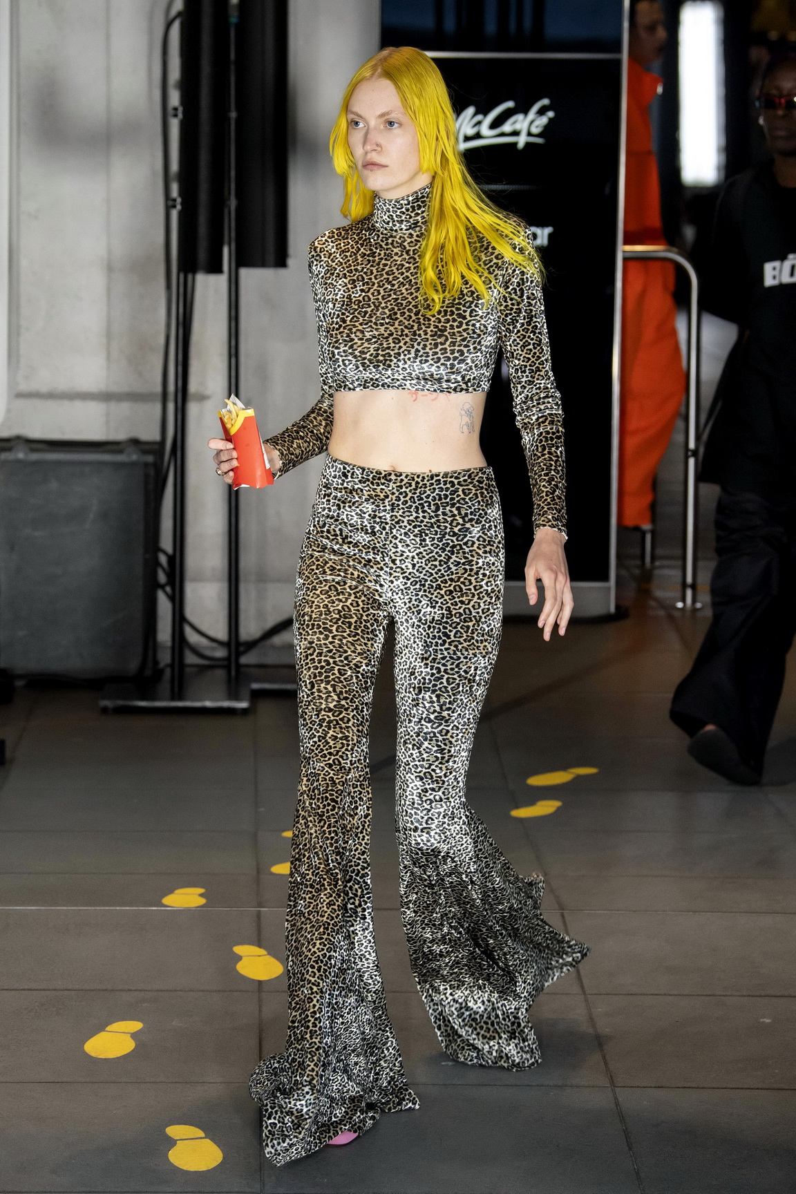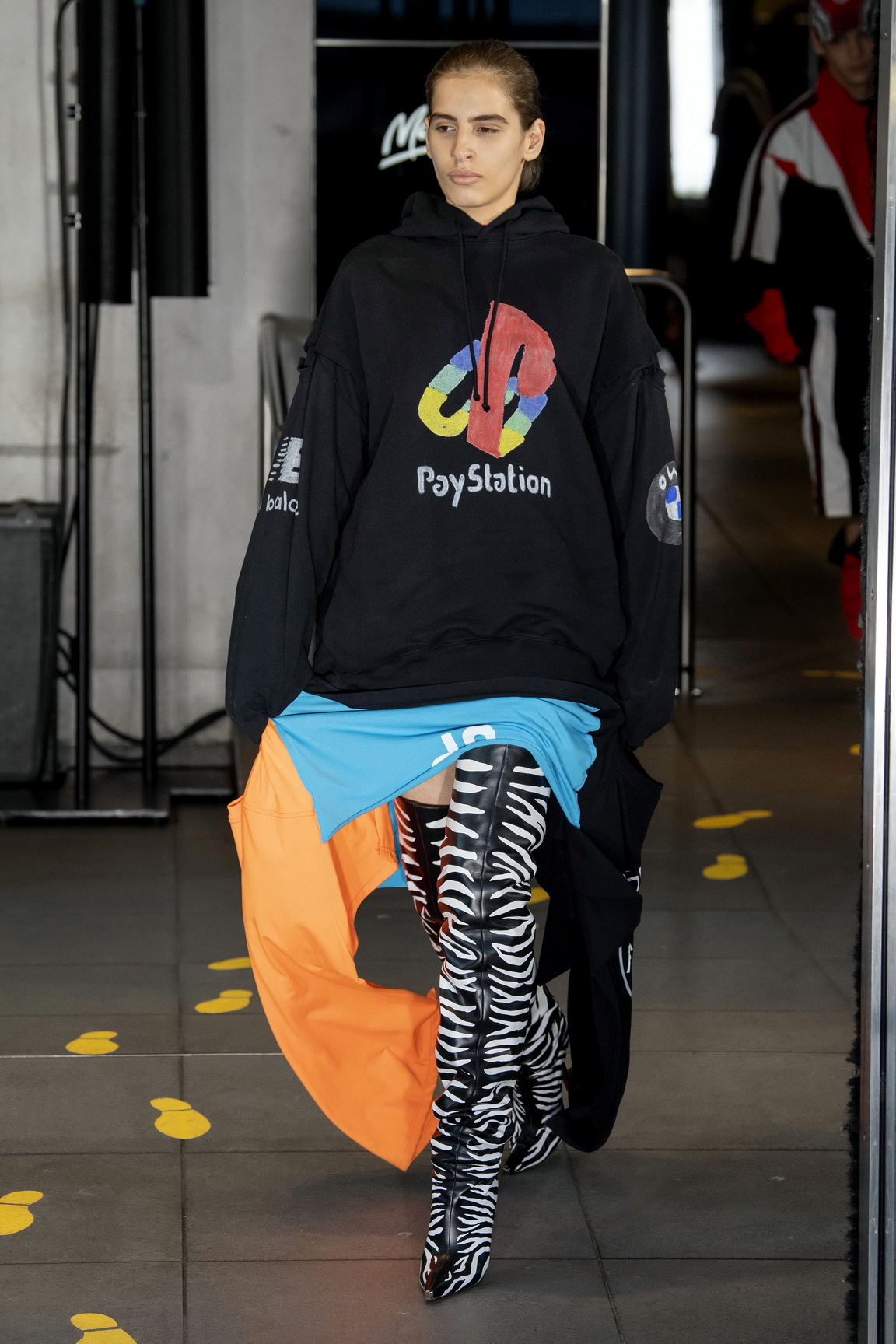 The clothes, meanwhile, consisted largely of manipulated workwear in the most literal sense — think security guard jackets to McDonald’s manager uniforms — followed by fun-poking takes on familiar company logos, where PlayStation became PayStation, and the Internet Explorer ‘E’ became ecstasy. There were also a number of tongue-in-cheek takes on tourist tat, which included ‘I love Paris… Hilton’, to provide the LOLs. In typical Demna style, the everyday was memed as models picked at fries and the fashion set slurped on Coke or milkshakes.