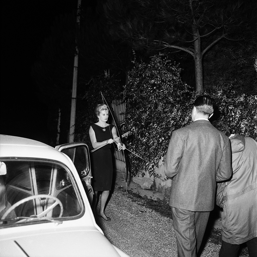 The exhibition catalogues similar memorable moments, including a case of life imitating art as Anita Ekberg defends herself against the intrusive paparazzi with a bow and arrow. Fabian describes the circumstances of the exhibition’s most iconic image: “A group of three or four men had been hounding [Anita] all evening and eventually followed her to her house and were waiting outside her door. She reemerged from the building fully fitted with a prop bow and arrow and shoots it straight at them. In one pap shot taken by Marcello Geppetti, the actress appears as a small figure in the dark distance pointing the arrow directly at the camera. She is quite literally shooting back at them. I think it’s such a powerful image of reclamation.”