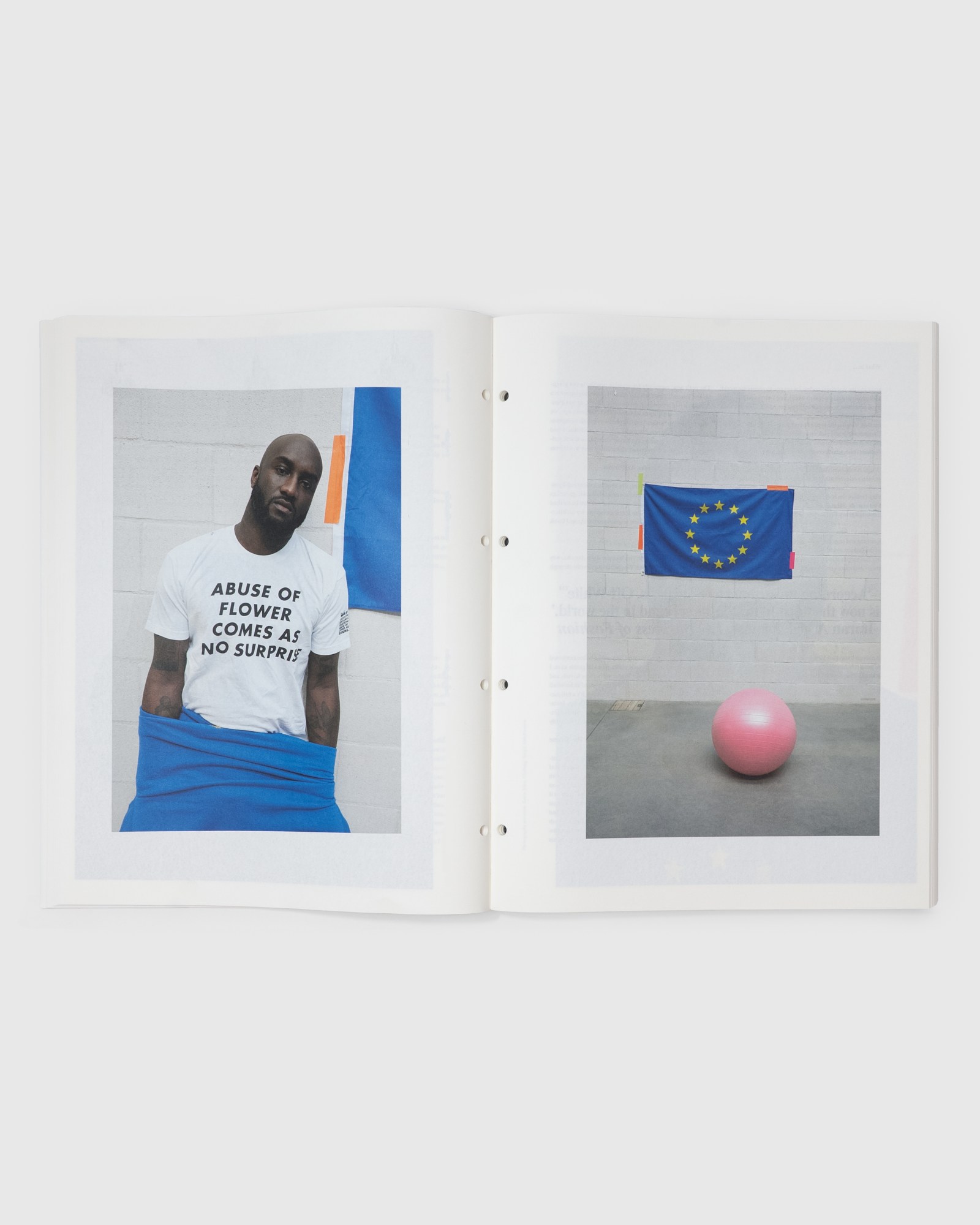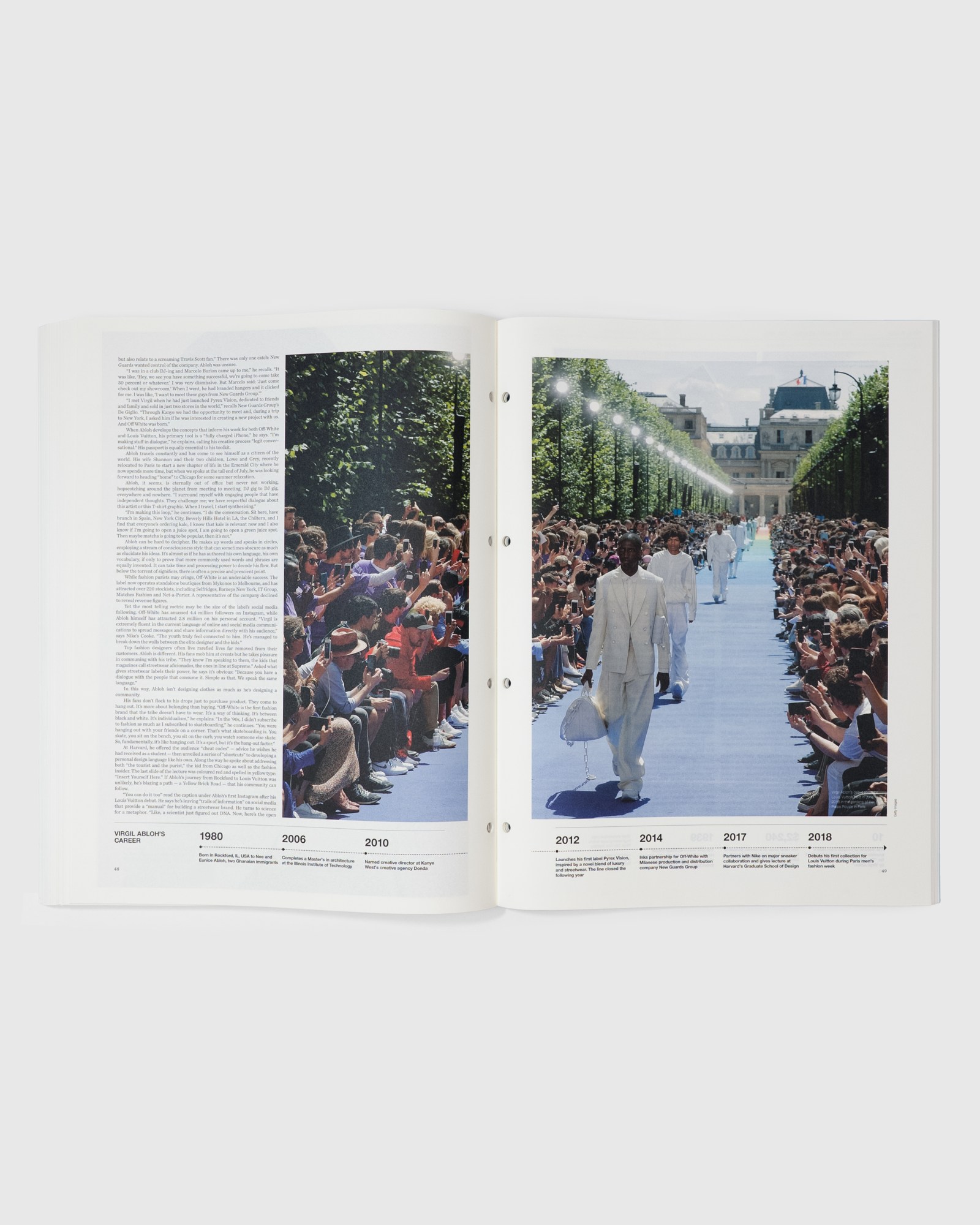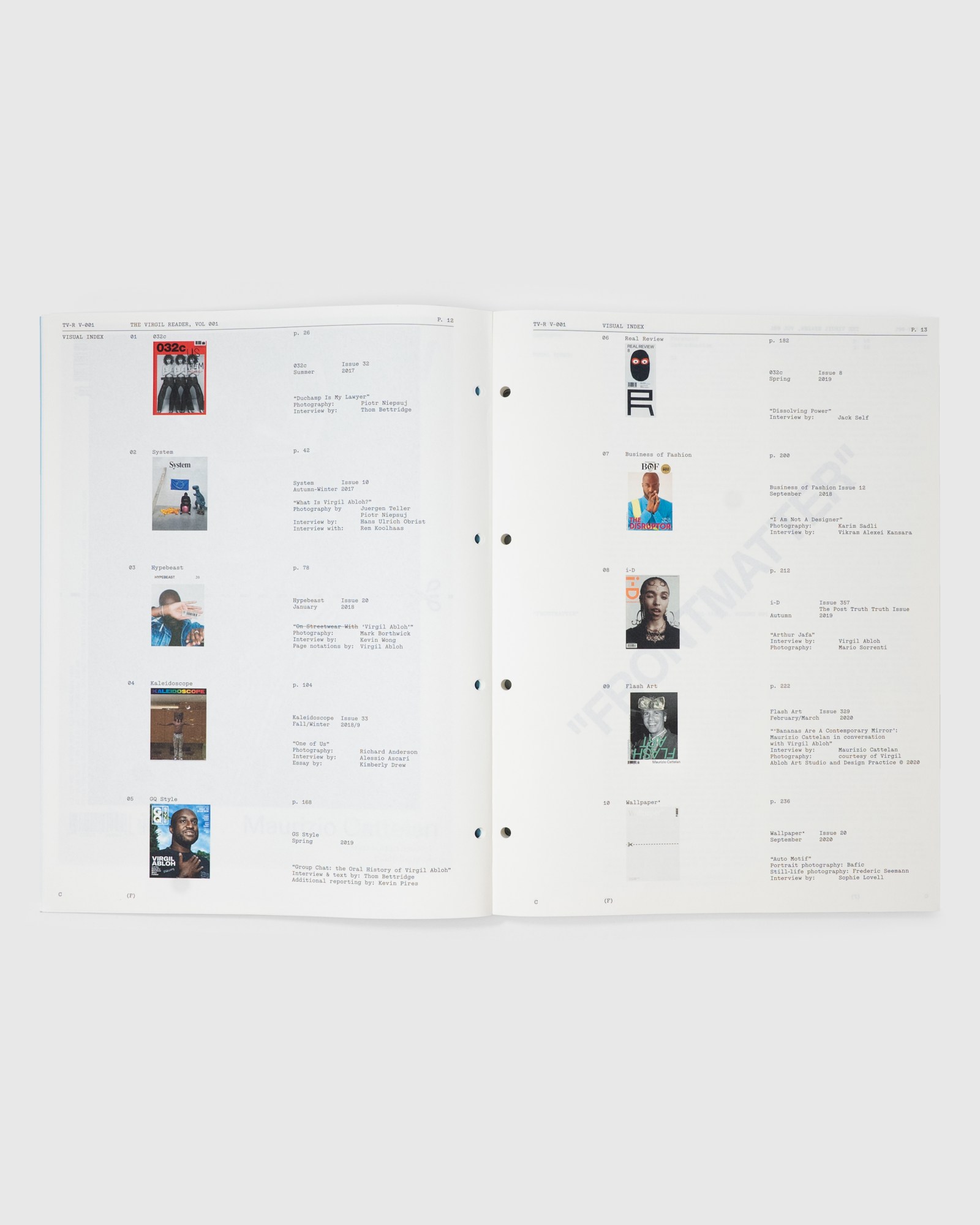 MS: That’s a part of the design of the reader, right? The reader is a compendium of articles that were published in various magazines — System, 032C, Hypebeast, Kaleidoscope, GQ, etc. They’re reprinted with their original layouts and their original typefaces. There’s metadata in the book too: there’s captions, additional information about the articles themselves. Anyway, the first reader is kind of a physical example of what we were just talking about. In a certain sense, it’s as true as any museum monograph. I think Virgil’s work as a conversationalist, as someone that initiated dialogue with people from a wide range of disciplines, was an integral part of his practice. In a lot of these magazine articles, it’s Juergen Teller taking photos, it’s Rem Koolhaas, it’s Arthur Jafa, it’s Richard Anderson. In a certain sense it’s creating intergenerational links.
