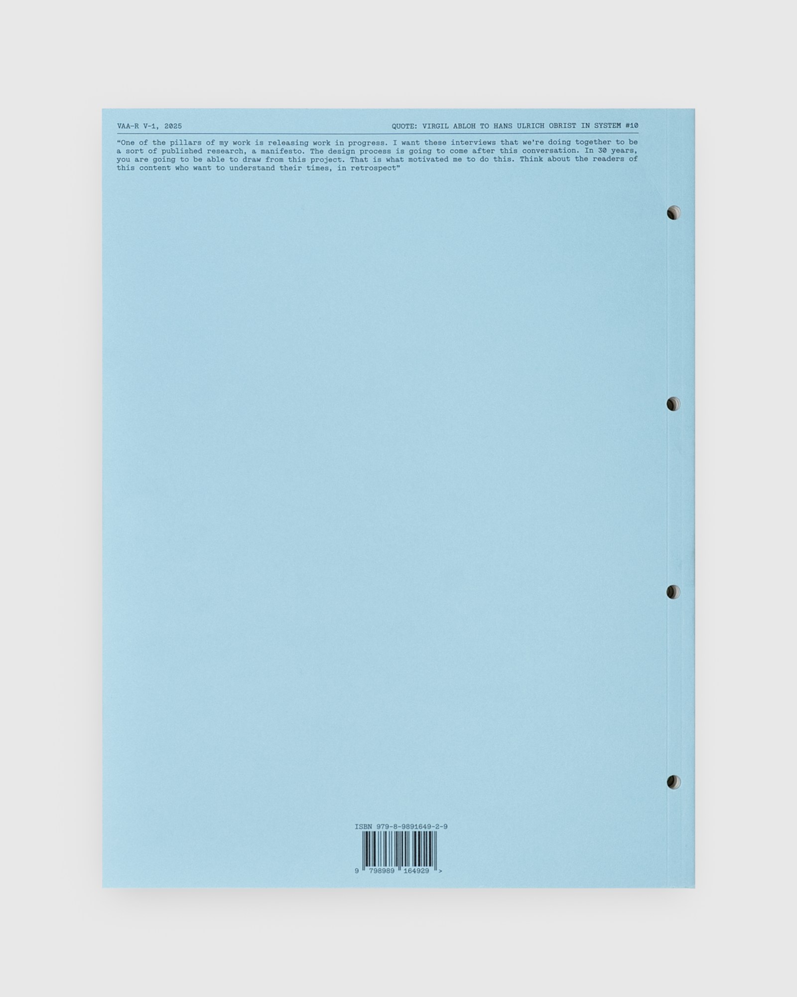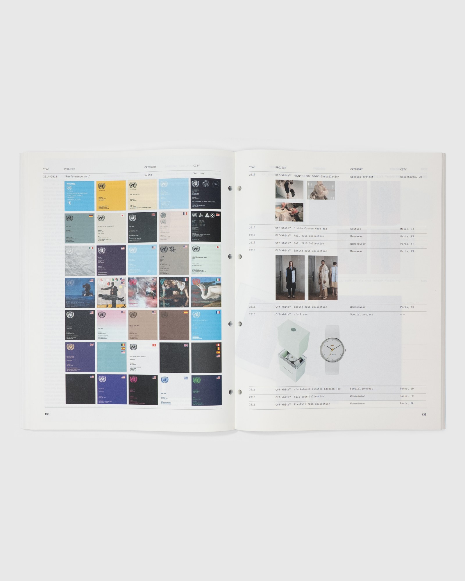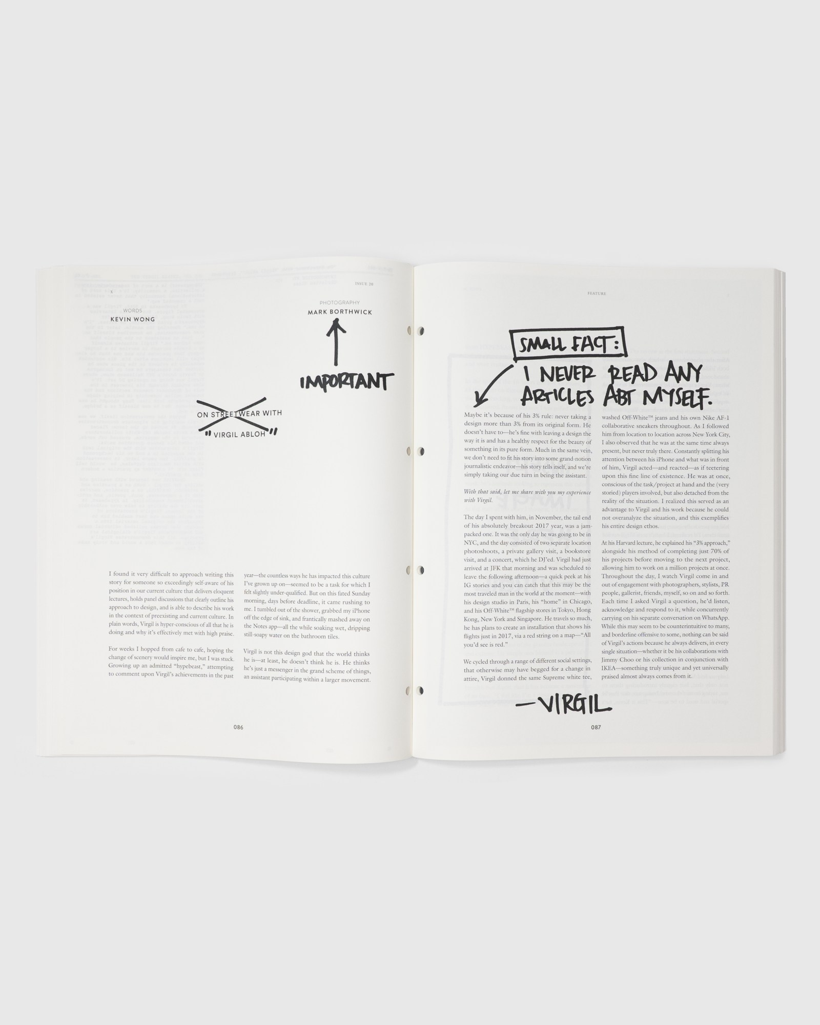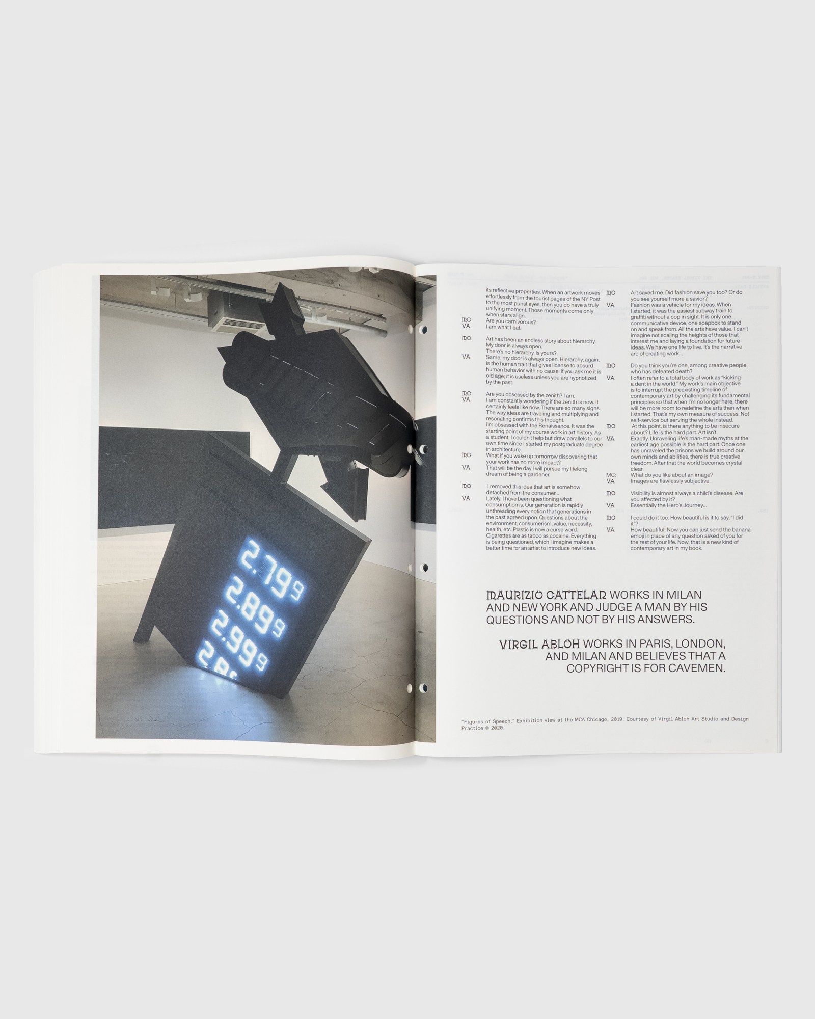 MS: That’s a part of the design of the reader, right? The reader is a compendium of articles that were published in various magazines — System, 032C, Hypebeast, Kaleidoscope, GQ, etc. They’re reprinted with their original layouts and their original typefaces. There’s metadata in the book too: there’s captions, additional information about the articles themselves. Anyway, the first reader is kind of a physical example of what we were just talking about. In a certain sense, it’s as true as any museum monograph. I think Virgil’s work as a conversationalist, as someone that initiated dialogue with people from a wide range of disciplines, was an integral part of his practice. In a lot of these magazine articles, it’s Juergen Teller taking photos, it’s Rem Koolhaas, it’s Arthur Jafa, it’s Richard Anderson. In a certain sense it’s creating intergenerational links.