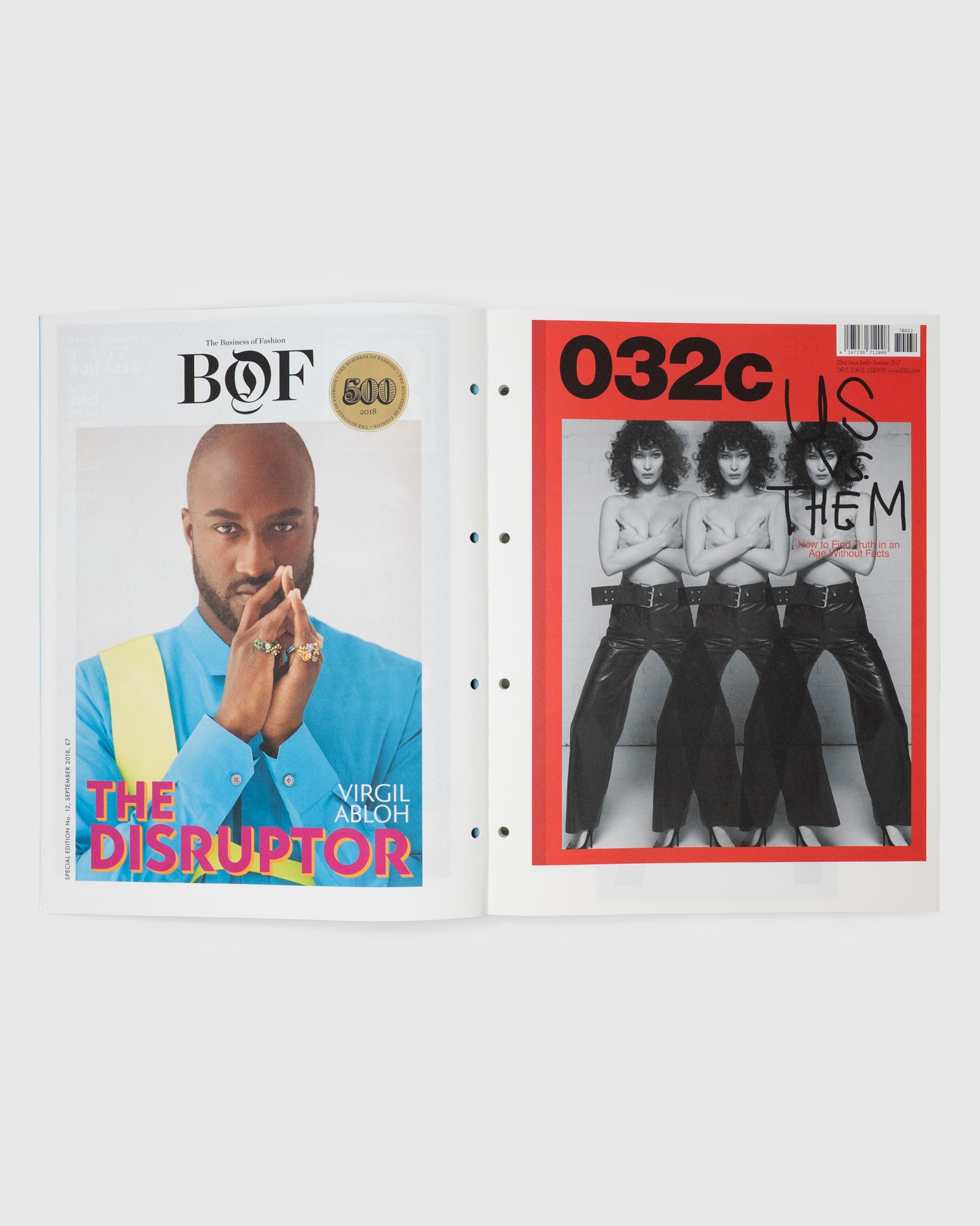 MS: With books there’s just so much out there that’s not on the internet. Virgil was very much attuned to that, as prolific as he was in storying, posting, and using Instagram. There are so many funny examples of that. For the 20th anniversary of 032c, Joerg [Koch] asked Virgil to do a commemorative issue. So Virgil asked for one of every single issue of 032c.