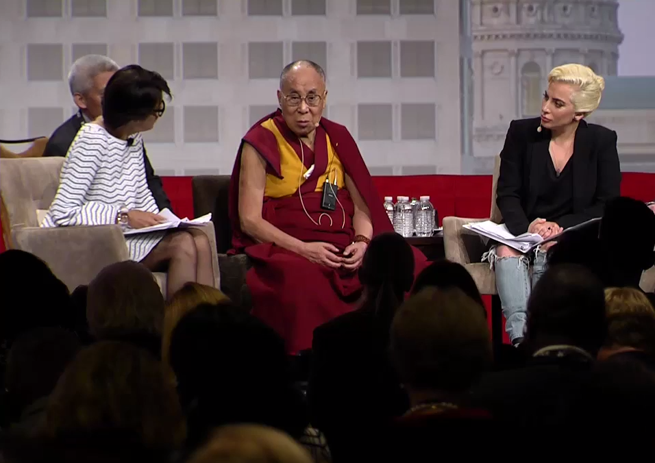 Gaga relayed questions about how to help young people with low self esteem, eating disorders, addictions and self harm, as well as how to feel at peace in the face of so much horror in the world. The Dalai Lama spoke about hope, compassion and community. “We’re social animals,” he explains, “So an individual’s future entirely depends on the rest of the community. No matter how intelligent or rich, [a person can] remain lonely,” he says, adding, “I think even one week is very difficult!”.
