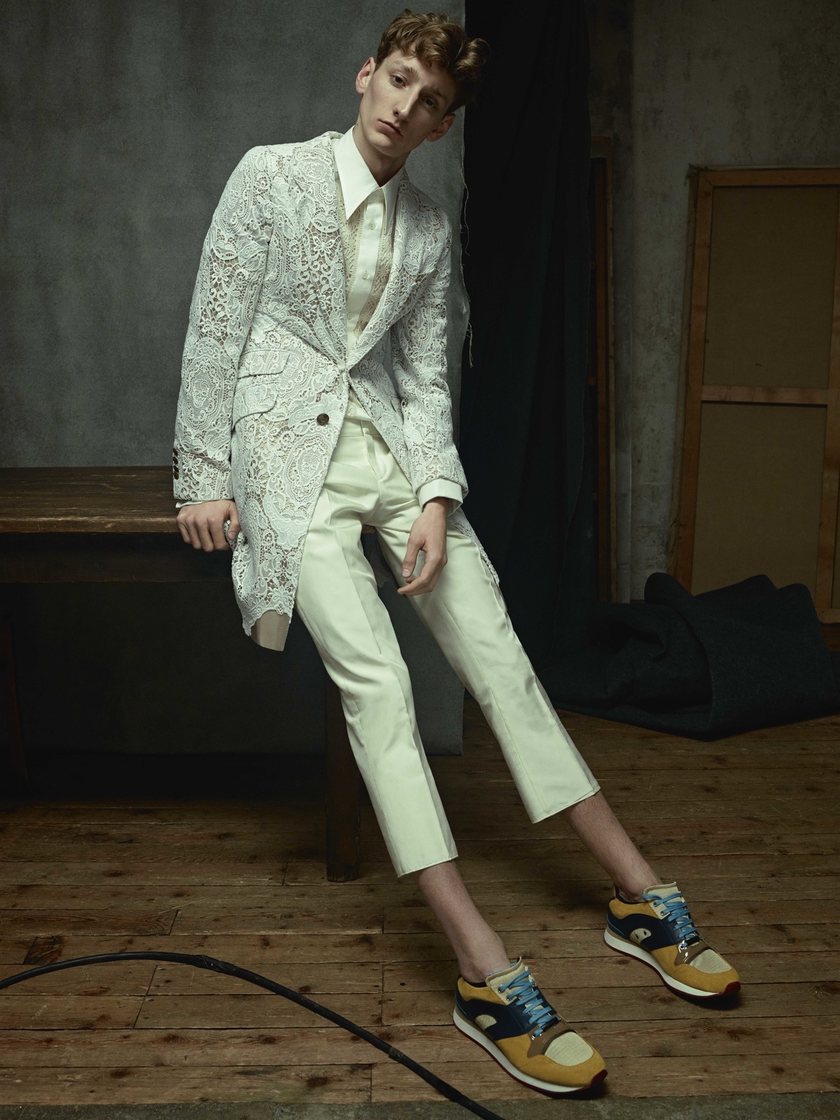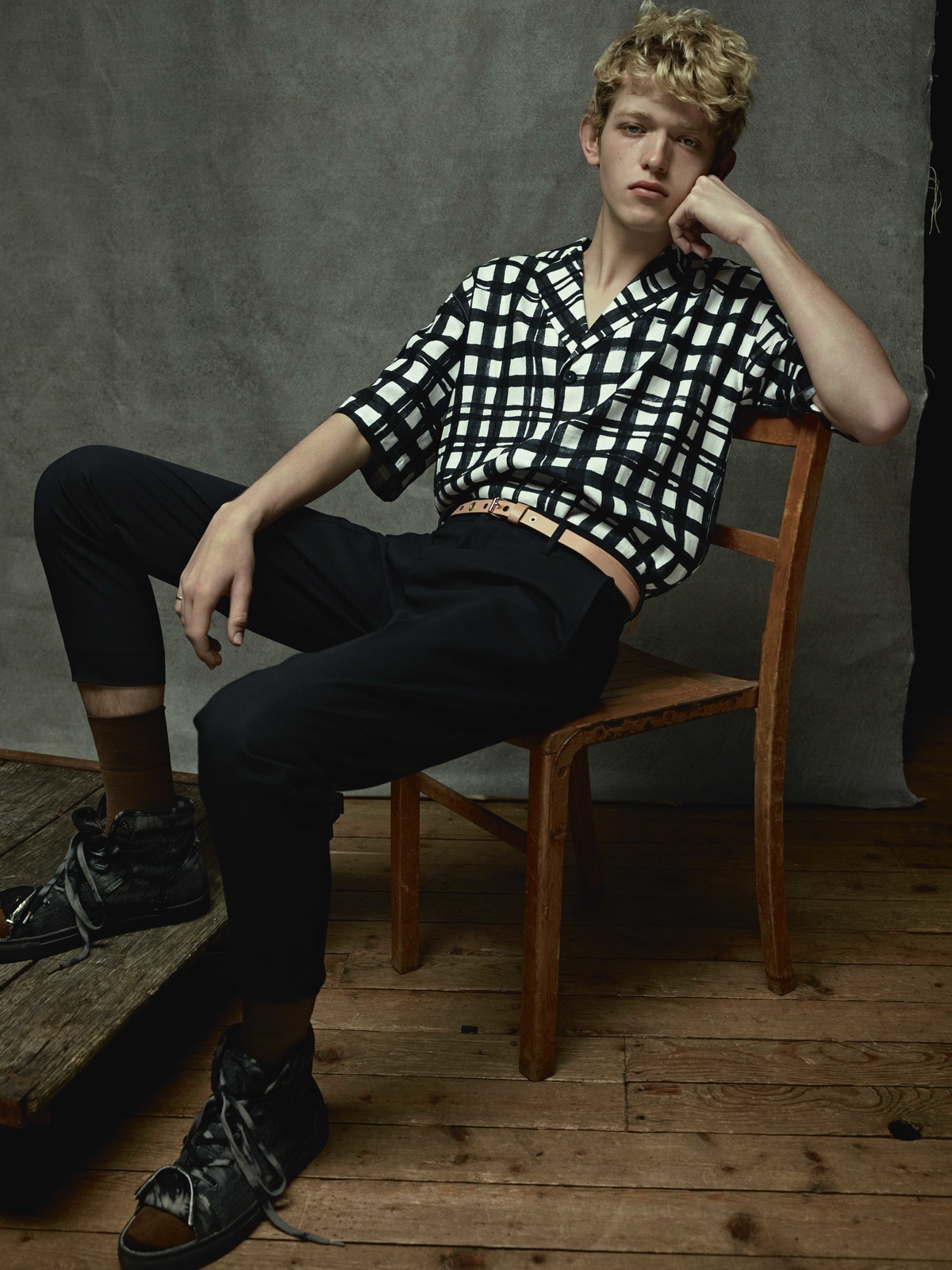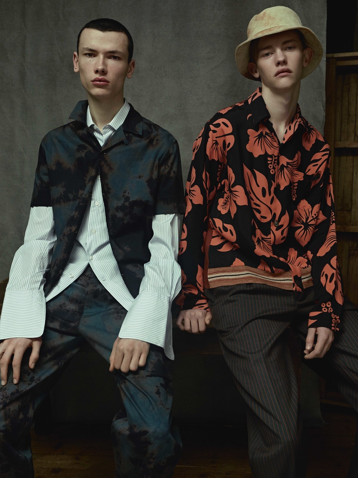 Francois draagt shirt en broek Louis Vuitton. Shirt (onder kleding gedragen) Lanvin. Robbie draagt shirt en broek Prada. Hoed Pigalle.
