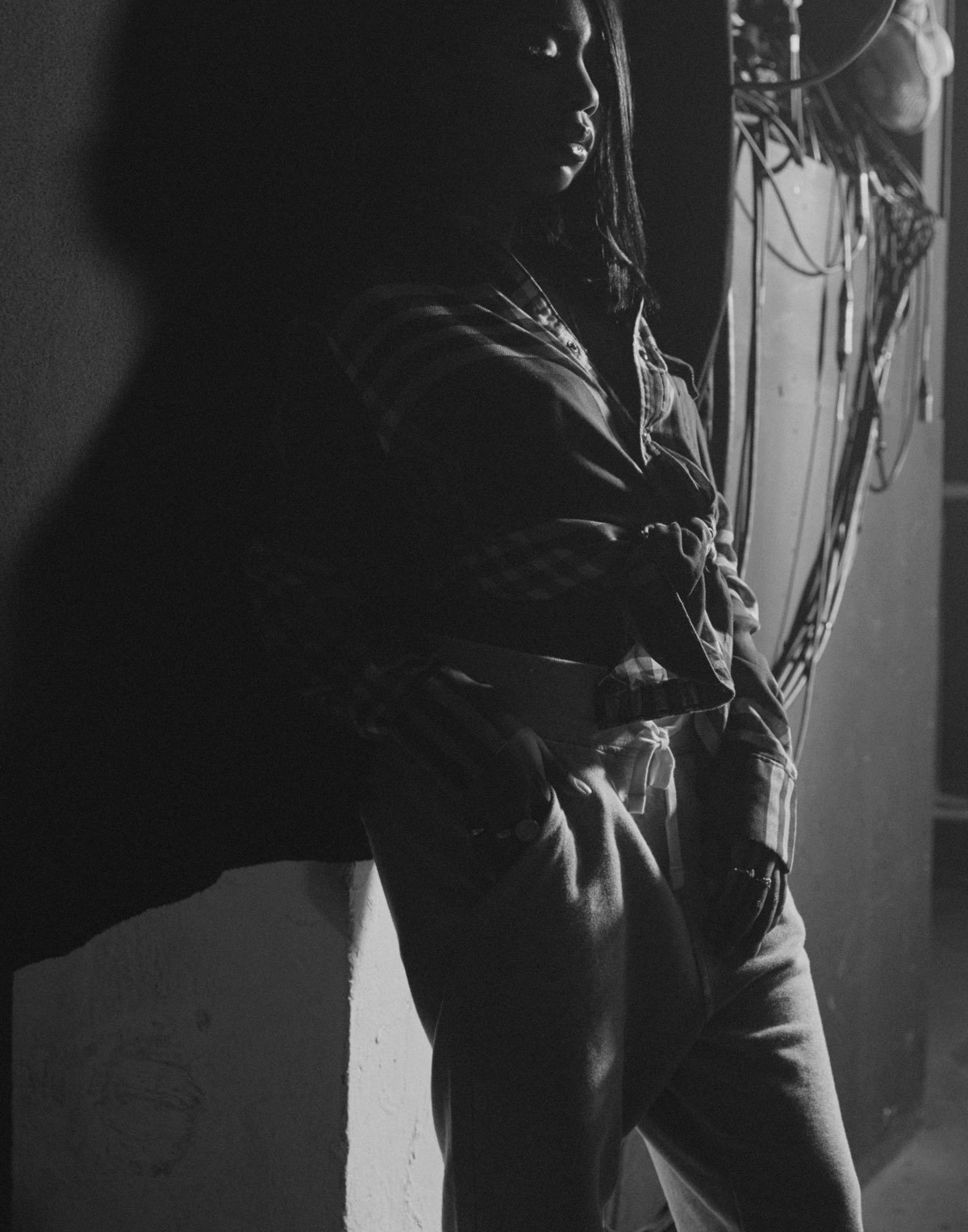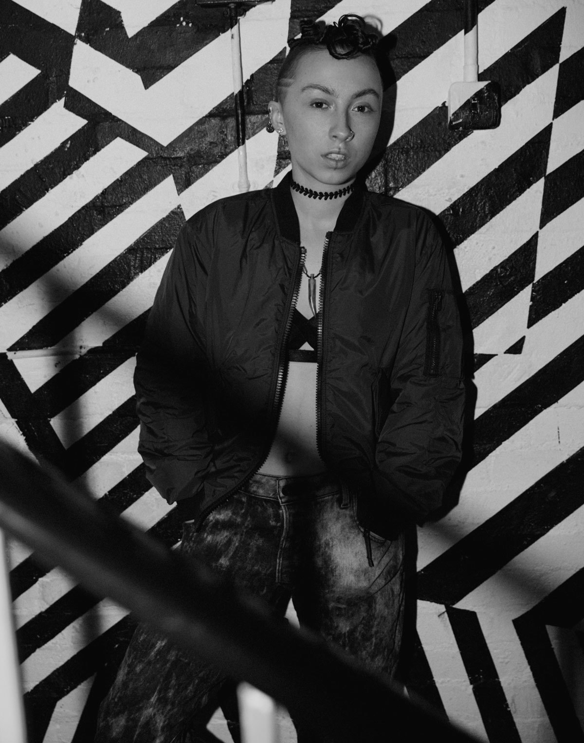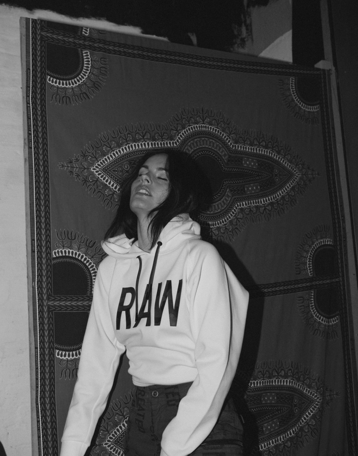 Gabi’el wears jacket, jeans and boots G-Star Raw. Bra, jewellery and socks Gabi’el’s own. Lola wears jacket, hoodie, trousers and boots G-Star Raw. Jewellery Lola’s own. Siobhan wears shirt and tracksuit bottoms G-Star Raw. Jewellery, socks and shoes Siobhan’s own.
