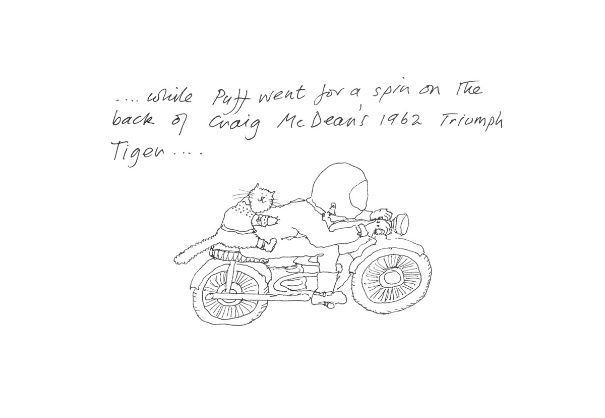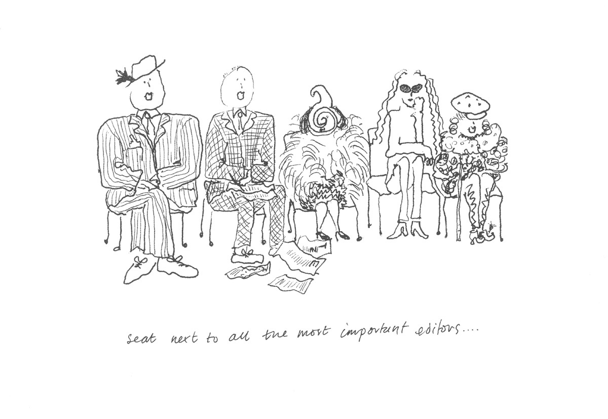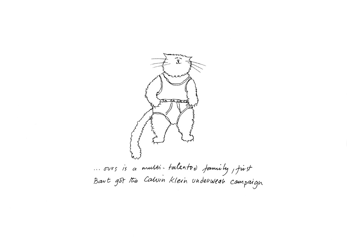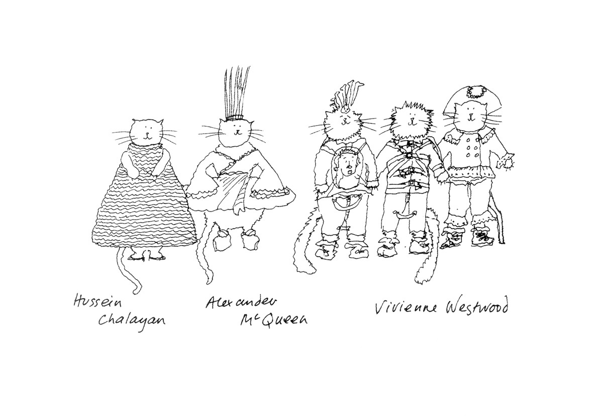 My fashion thing was when I was a kid living in Wales. I used to rush to the newsagent once a month to get British Vogue. I guess I loved fashion and I used to make my own clothes from Vogue patterns, however in those days they were mostly based on couture looks, so I would try and make couture looks on my mother’s hand-sewing machine that you had to kick to operate. I can’t really say that fashion went hand-in-glove with cats because I never really saw the two of them together until about 20 years ago when I started sending faxes to Didier, my boyfriend, telling him what I was doing when I was away and instead of writing (because I can’t really spell), I used to draw what I was doing and it was fashion. I would draw the “cats” on the shoot or the “cats” in the collections; so that’s when they kind of got together, cats and fashion. I always loved cats, there were a lot of cats around in Wales and then I had my own cat as soon as I got my own apartment in London. I was modeling so that must have been around 1959. I never had much luck with my cats, they kept dying or I had to give them away because my life was a bit all over the place! I got more serious when I stopped modeling and became a fashion editor with a more regular lifestyle in 1968.