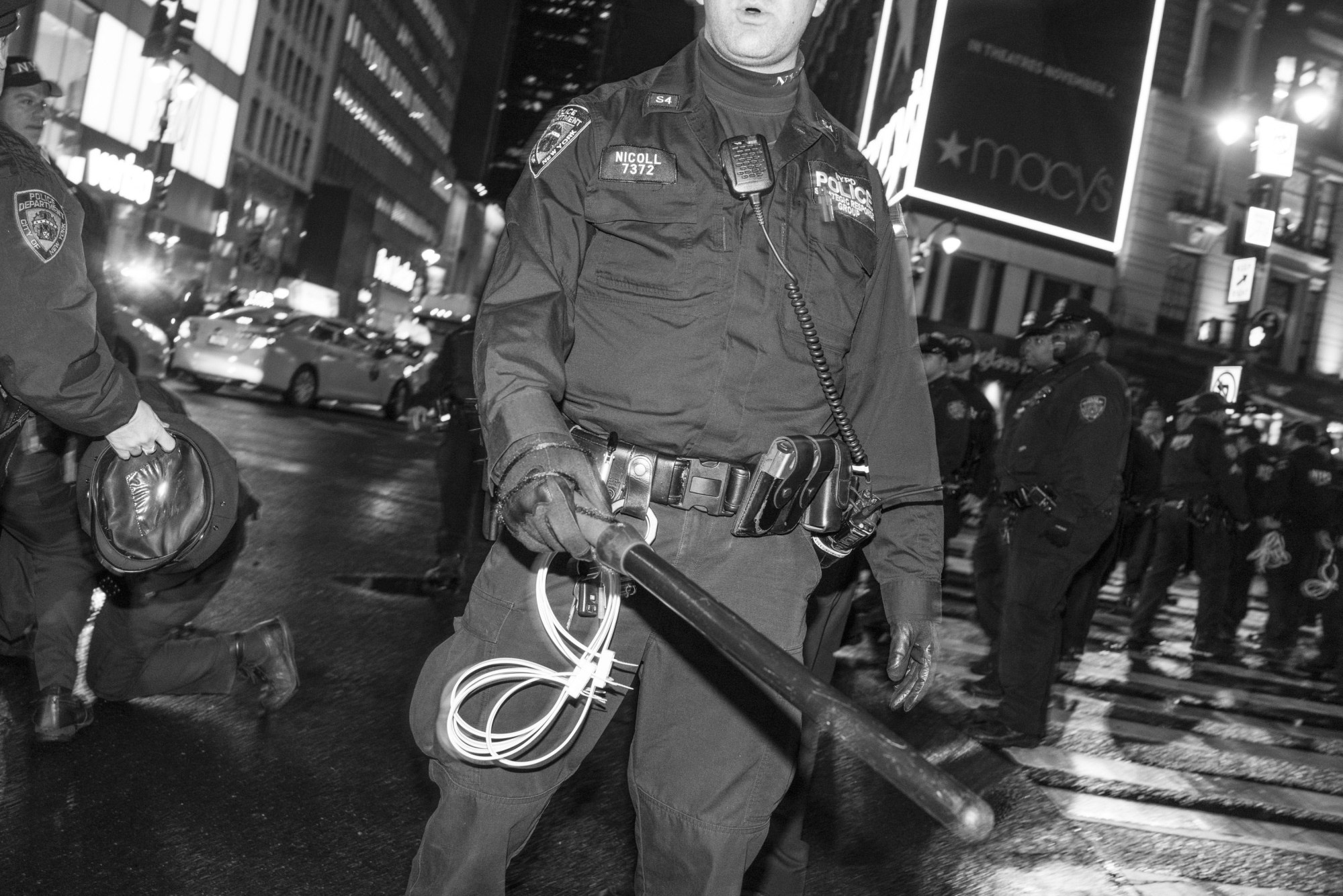 At Herald Square, I watched a young man in a beanie and scuffed-up Stan Smith sneakers get pinned to the ground by policemen. “Nothing to see here!” they yelled to a wall of watching protesters and their recording iPhones. Meanwhile, a silver-haired lady with a blowout and a leopard-print raincoat was trying to ask an officer for directions to the nearest bus stop. An elderly couple in fur-collared coats pushed through the crowd muttering about “young people” like cartoon villains.