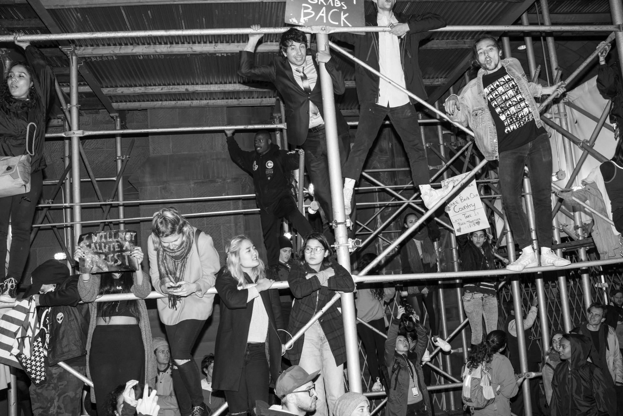 “The UK had their Brexit, and this was our Brexit,” he told a group of onlookers huddled around him with their cell phones held out. “But Britain chose to leave the European Union; America decided to leave America.” Then he raised his own phone to broadcast a Facebook Live stream of the tide of demonstrators rolling up Broadway. People punched the air with signs that read “Dump Trump” and “Black Lives Matter,” or walked arm in arm or hand in hand. They chanted, “Pussy grabs back!” and “Not our president!”
