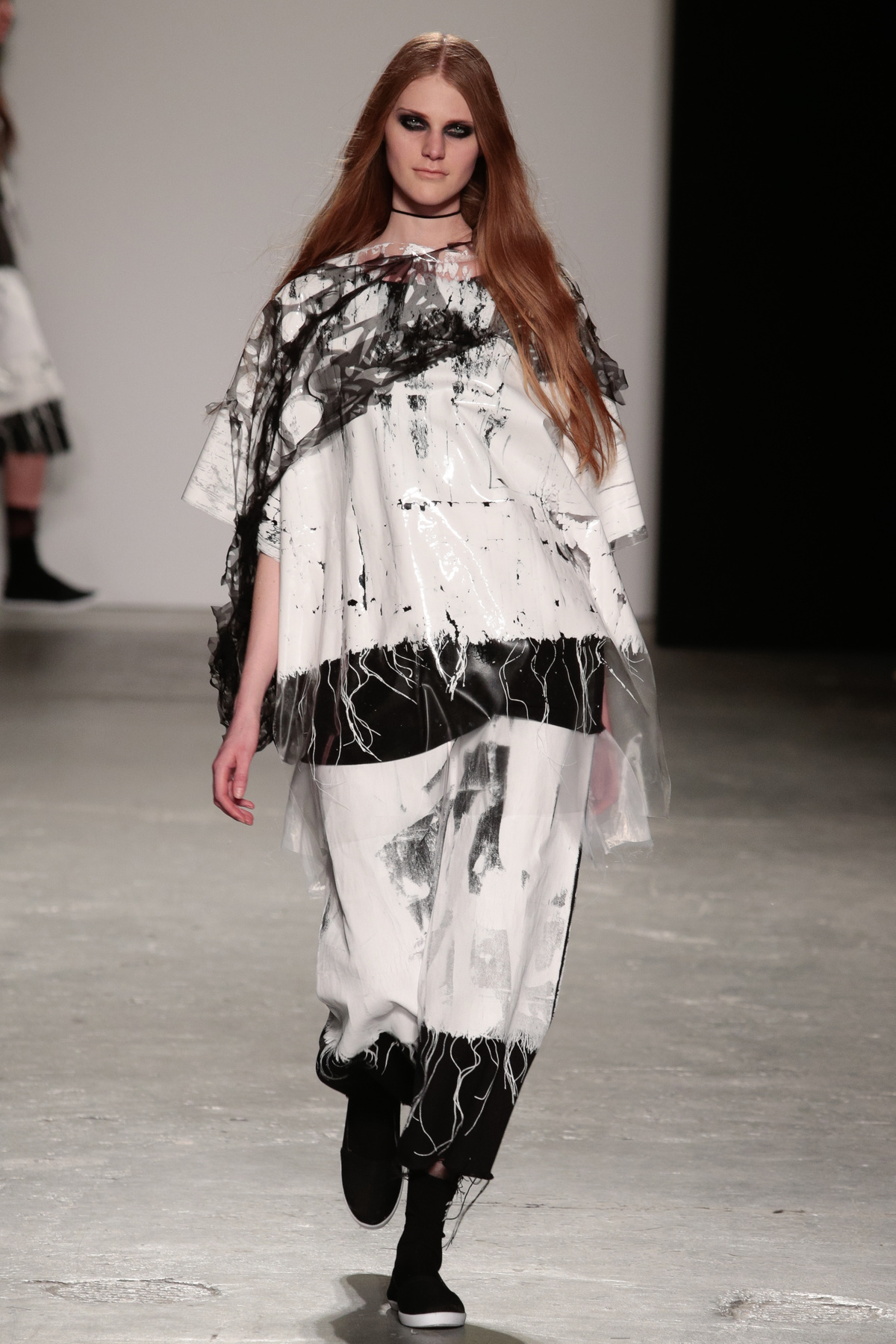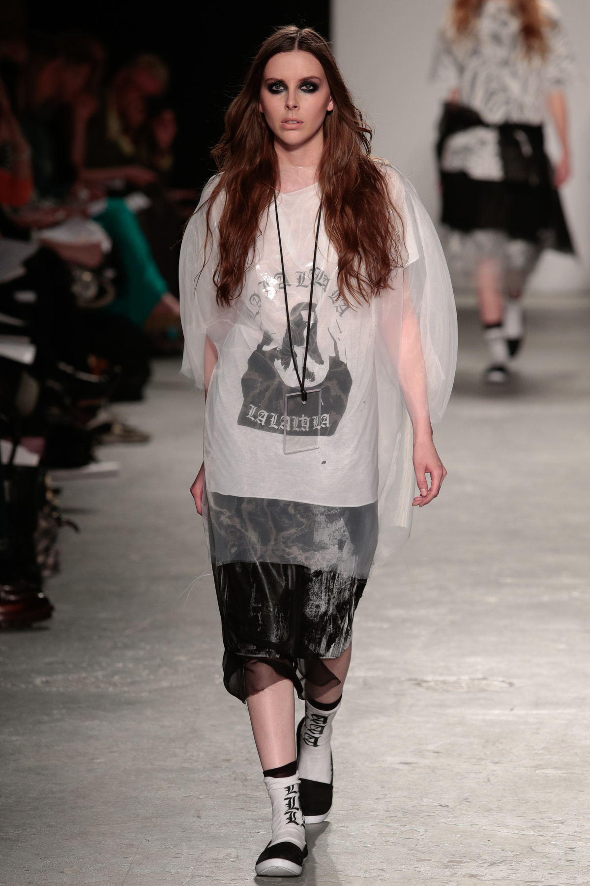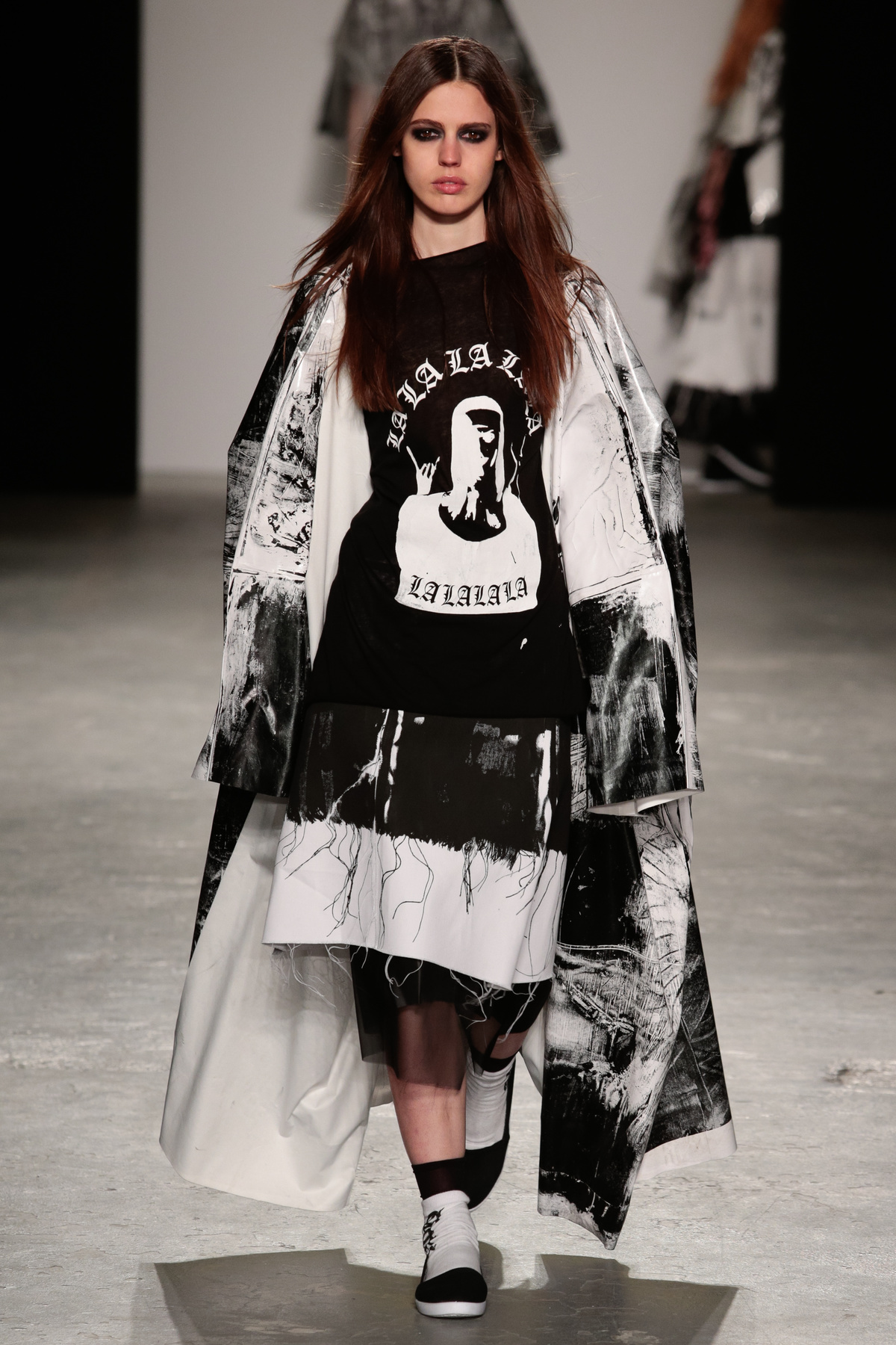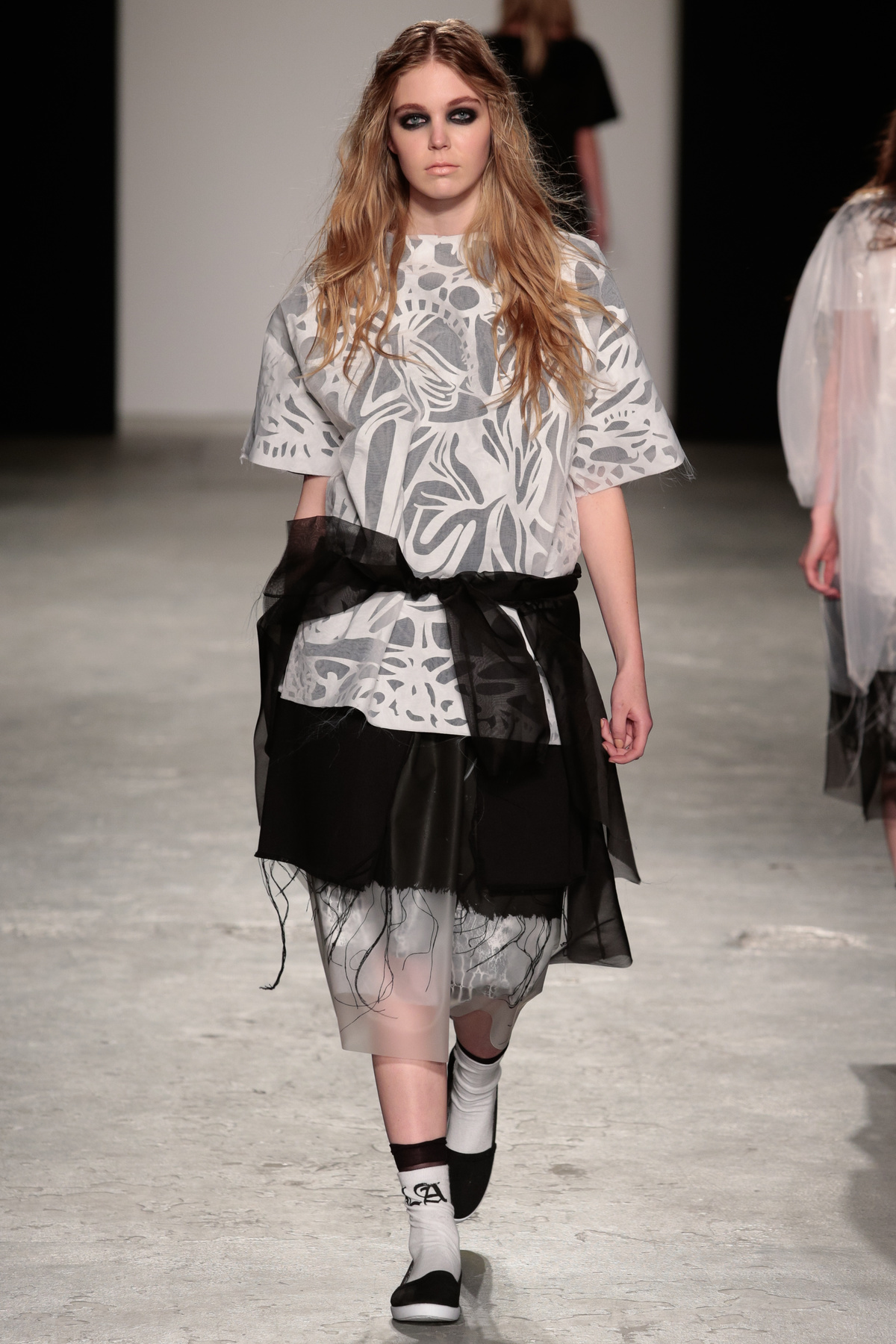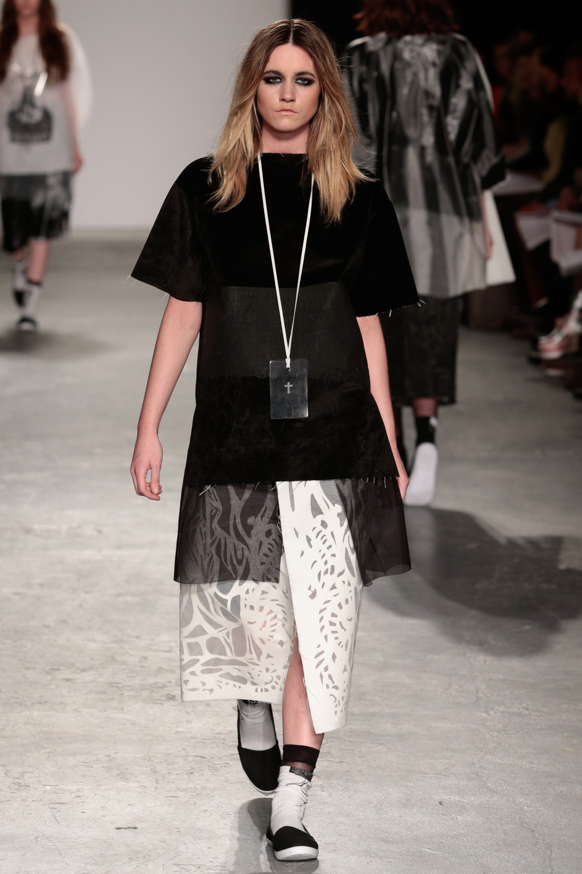 The models in Louise Alsop’s graduate show stomped down the runway with long, loose, unkept hair framing their faces, thin black chokers or long cross pendants swinging from their necks and thick kohl-rimmed eyes like emotional, fashionable, teenage grungers who’d made all their clothes at home using scissors that definitely weren’t made for cutting fabric. Subscribing completely to the Helmut Newton train of thought, “fashion is about attitude, not hemlines,” Louise leaves her edges raw and piles on the angst. The newest member to join the Fashion East line-up alongside old favourite Ashley Williams, and fellow newbie Helen Lawrence, Louise has got everything going for her.