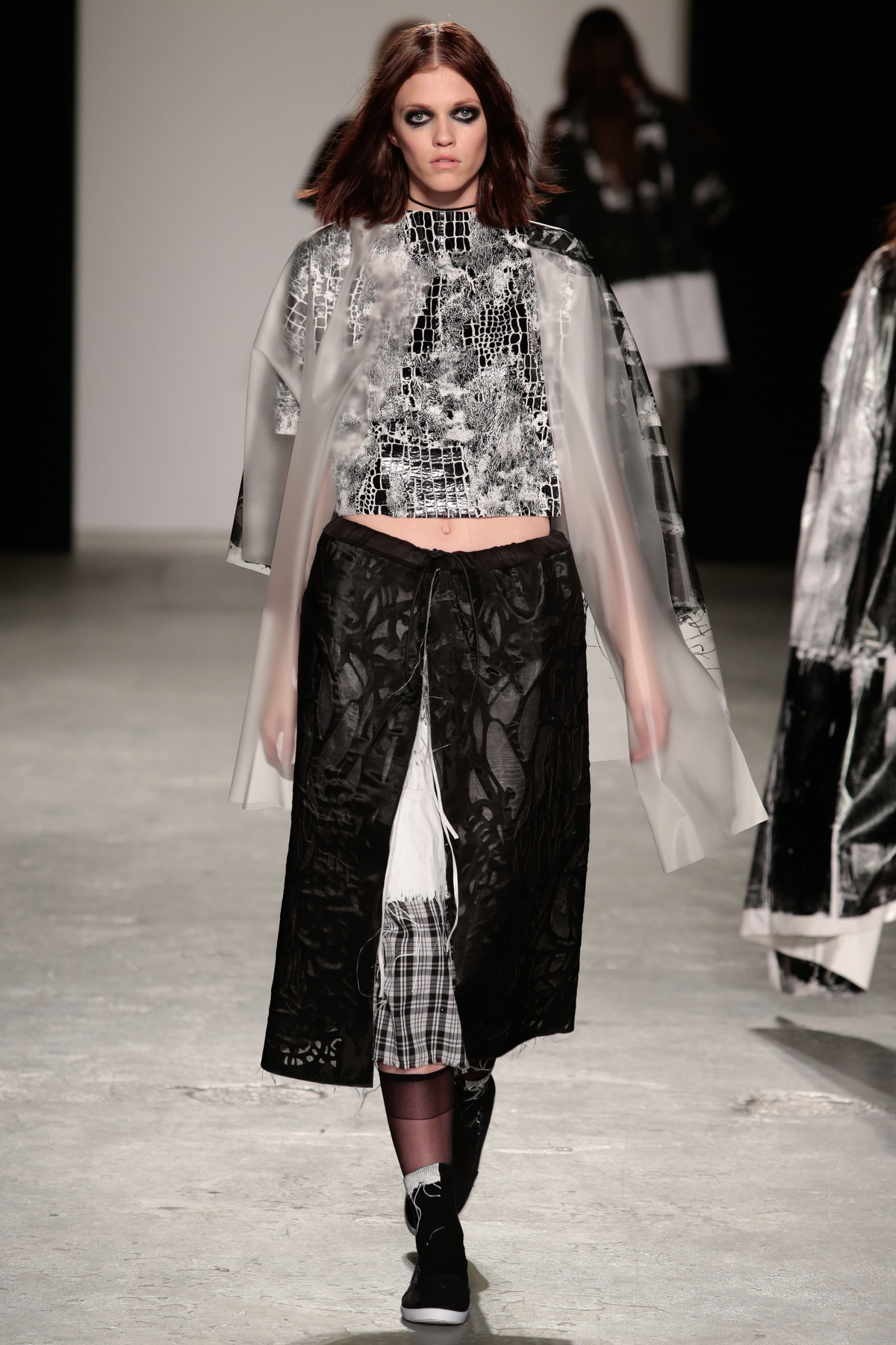 The silhouette probably came from my own wardrobe, I think I design for the woman I want to be. The main print in the collection came from a photocopy of one my fabrics, which I blew up and applied to various other fabrics, some transparent, so I could layer prints on top of one another, and add more texture.