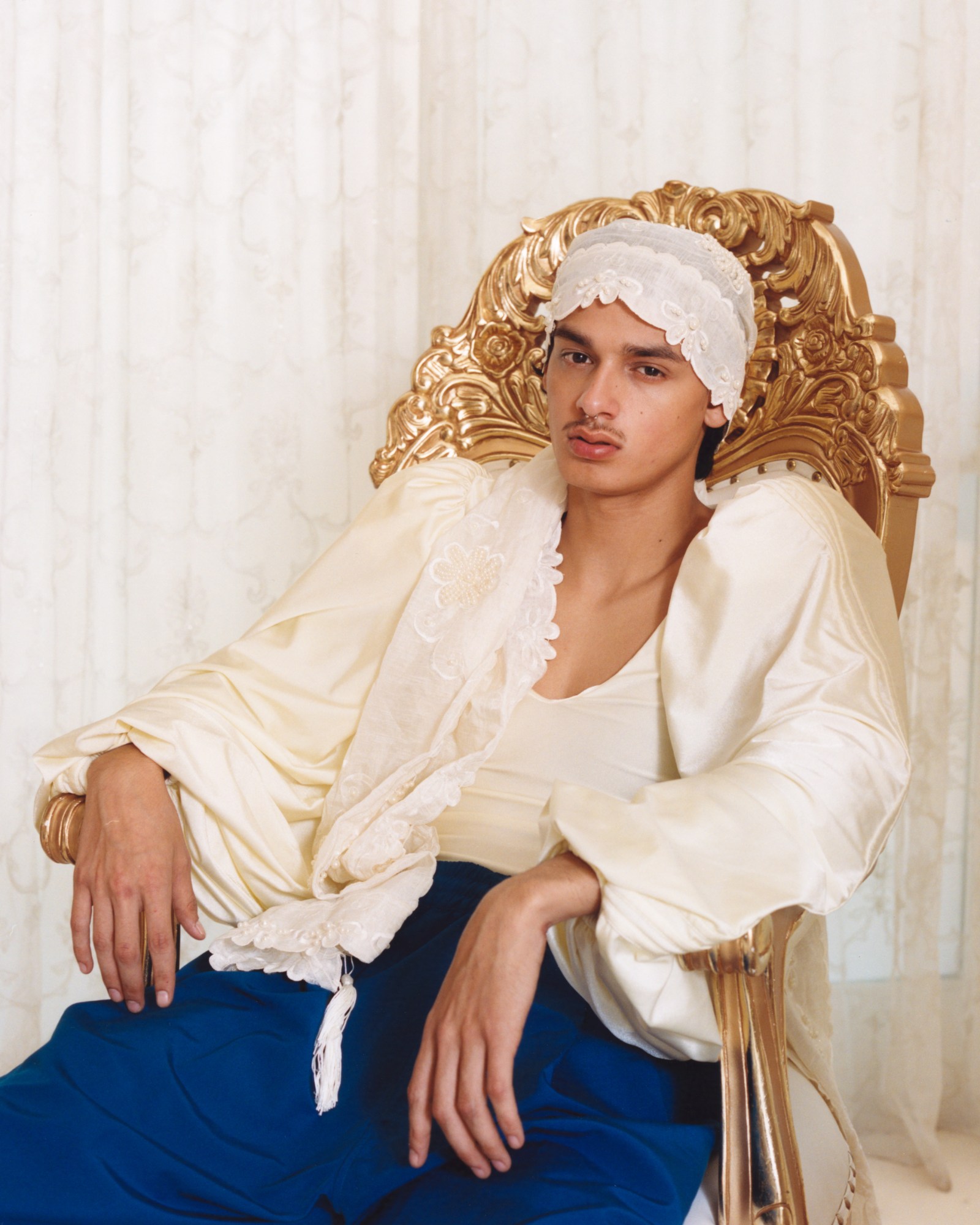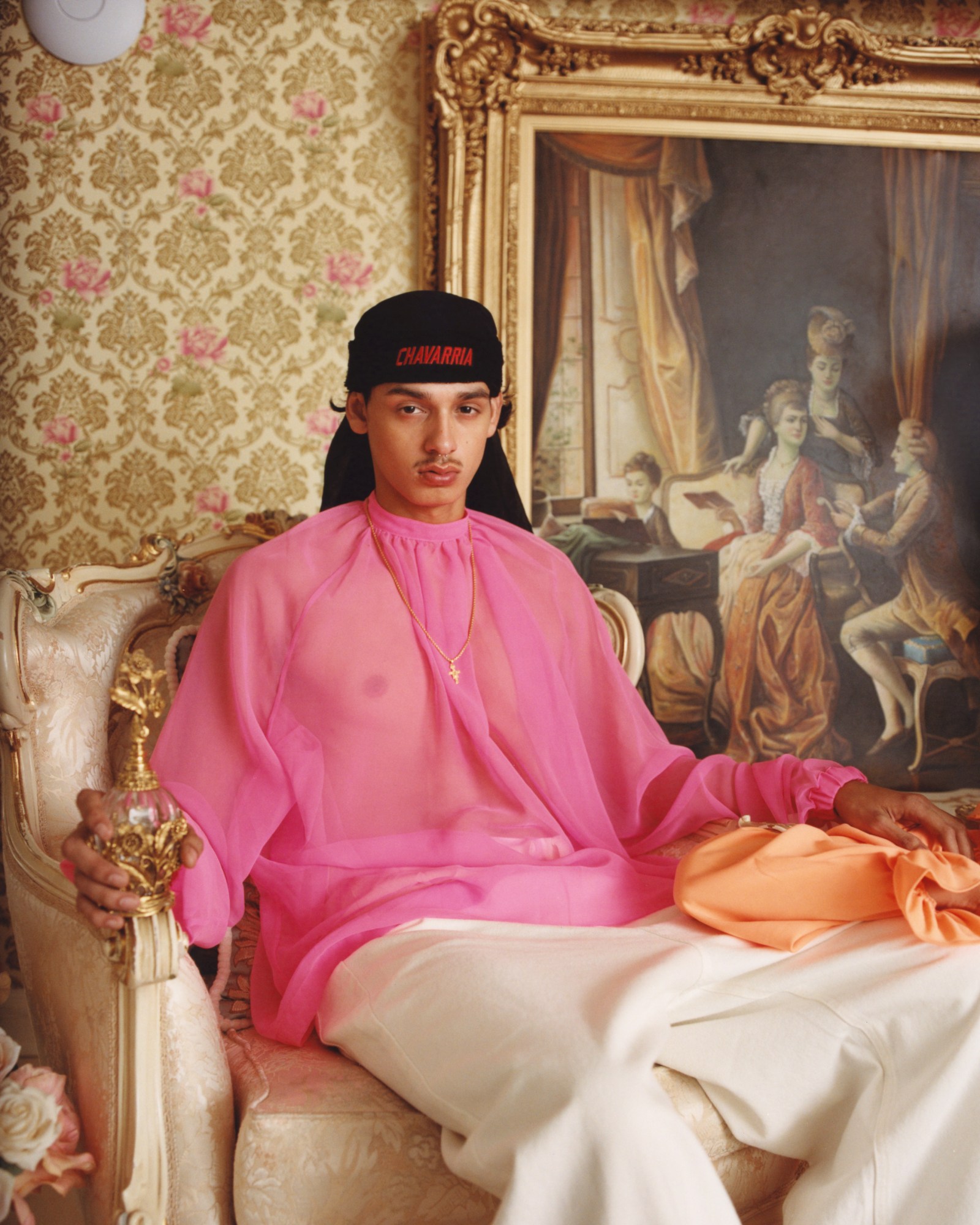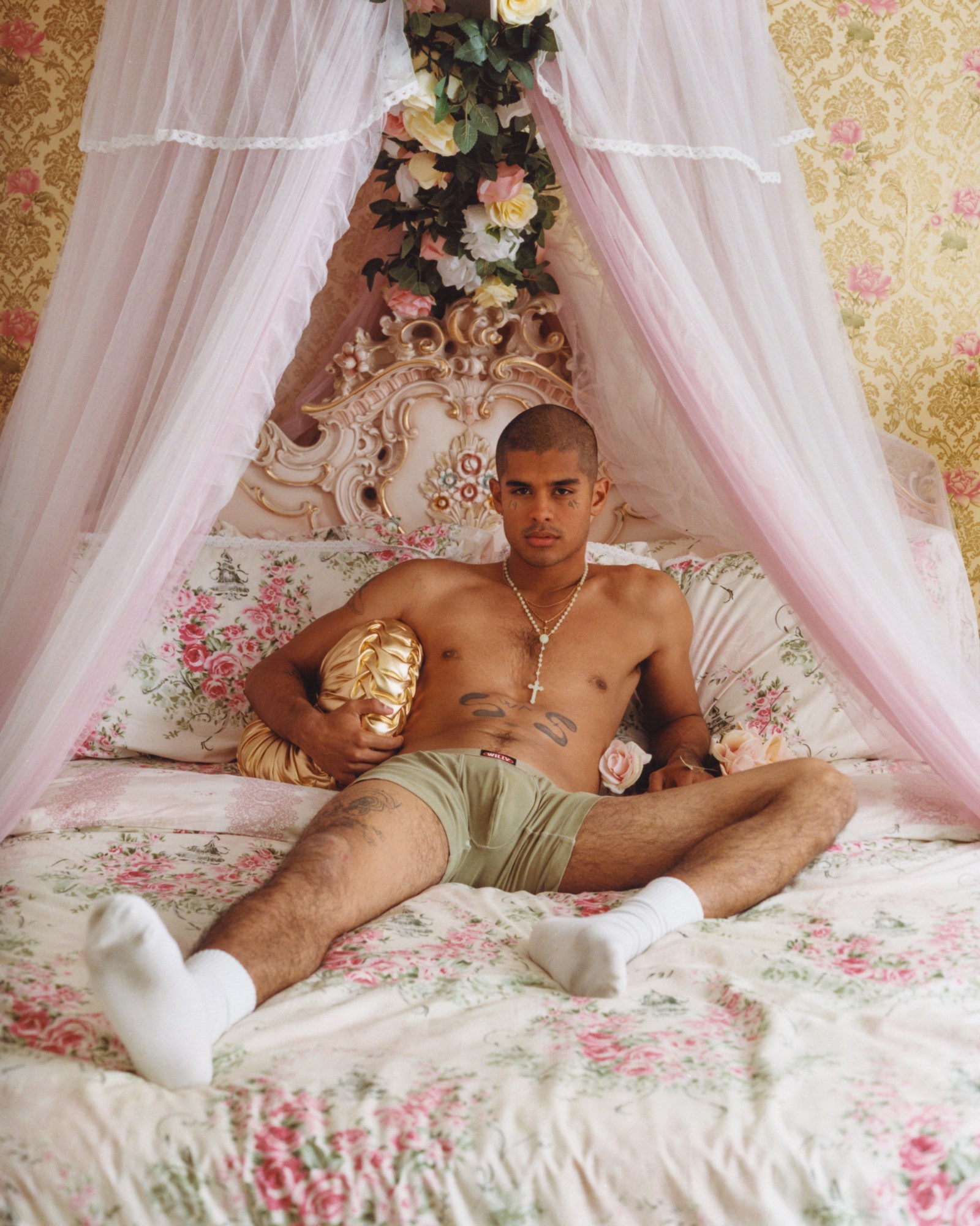 The guys in this shoot were . . . past that day from the street. They were kids that were looking in the windows to see what was going on, and we were just like, “Hey, come in here. Do you want to be in a shoot?” We wanted to show guys in a really glamourous way.