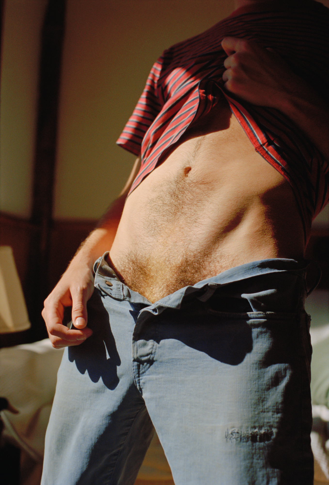 That isn’t so unusual — “I guess it’s indicative of the world we live in today,” he adds — but the vehicle is. Have you skimmed that place where the abdomen meets the hips and dips, like a valley, into your pelvis? It’s always soft. With Mine Dyed Blue is a rainbow of pubes: bursting from button-flies and cummerbunds, russet brumes on white skin, ash-white clouds on brown, growing from bodies taut or creased. Some hair is pretend — a bundle of fake fur tucked into transparent underwear and legs bent to stretch them both. One body, femme and curved like a cat, is a wash of peacock-green, blurred to appear double: two stomachs, four breasts, two heart lines on a palm. Another body appears to rest, vertically, on navy carpeting. I rotated the picture; maybe it’s a navy wall? Aronson is a Pisces, and Piscean in his approach: sentimental and fascinated by illusion. “I’m interested in allowing those transparencies to surface, to make you question what’s real. Is that fire real?”