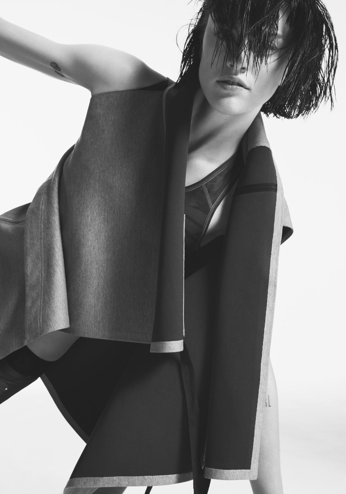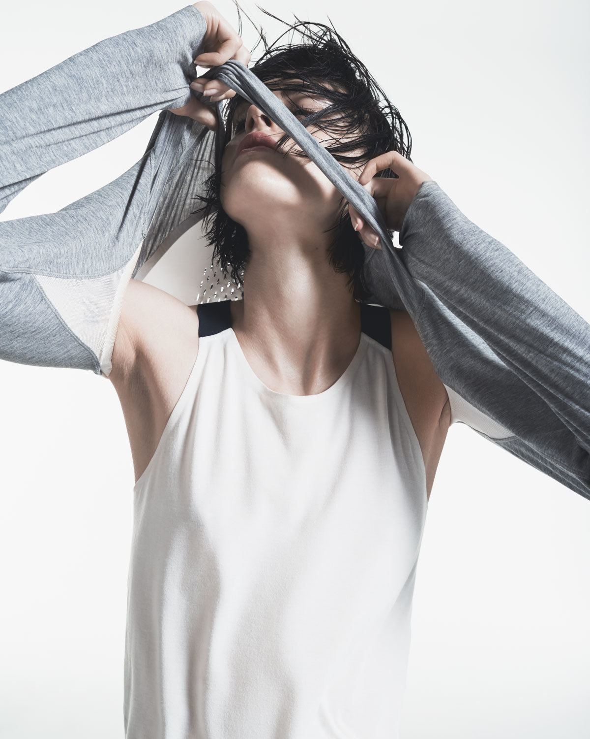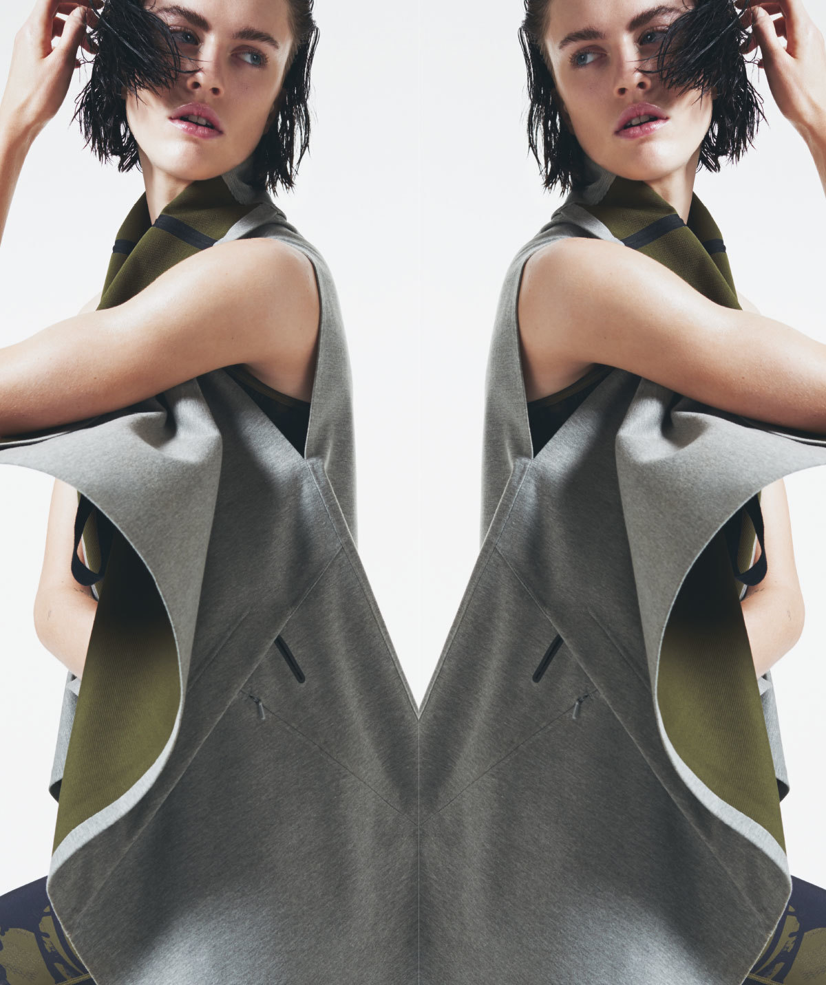 A deep love of fitness training and running combined with a covetable knowledge of clothing construction makes her Nike’s dream accomplice. “Over the past few years the idea of creating a performance collection for women had been increasingly on my mind, and to download my visions into such a project with Nike was ideal,” Johanna explains. Inspired by the architecture of the human body, Johanna’s designs are rooted in the idea that clothes should allow for movement and expression. “Clothing, to me, is the smallest scale of human habitation,” Johanna says. “It is the most intimate environment; it gives you protection, support and comfort while communicating your personality.” A firm believer in the importance of customization, outfits are built up via a layering system, allowing wearers to adjust, evolve and maintain optimum comfort throughout their workout. “When I think of designing a garment, I think of creating environments,” says Johanna. “My ideal environment has to be modular and able to adapt to every situation. For some occasions, I might feel I need support and want to be covered up, but on other occasions I want to open up my clothing and be more free; I want my clothing to breathe.” Every detail in the collection is created with purpose and performance in mind, changing volume and position on the body according to demand. As well as versatility, individual items integrate Nike’s signature Dri-FIT technology, laser cutting and lightweight bonded finishes. All garments are built to move and interact with the female physique; the slit sides in a tank top open gently with movement, while a thoughtfully placed zip opens the collar of a crop top both increasing breathability and revealing the collarbone.