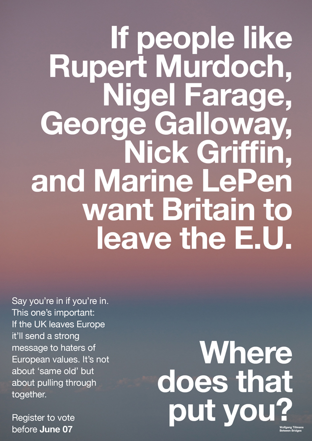 Luckily, we now have celebrated German photographer Wolfgang Tillmans on the case. Worried about the number of young voters who haven’t registered, he’s created a series of posters, which pretty clearly outline why you should register to vote, and that your vote should be to remain in the EU.