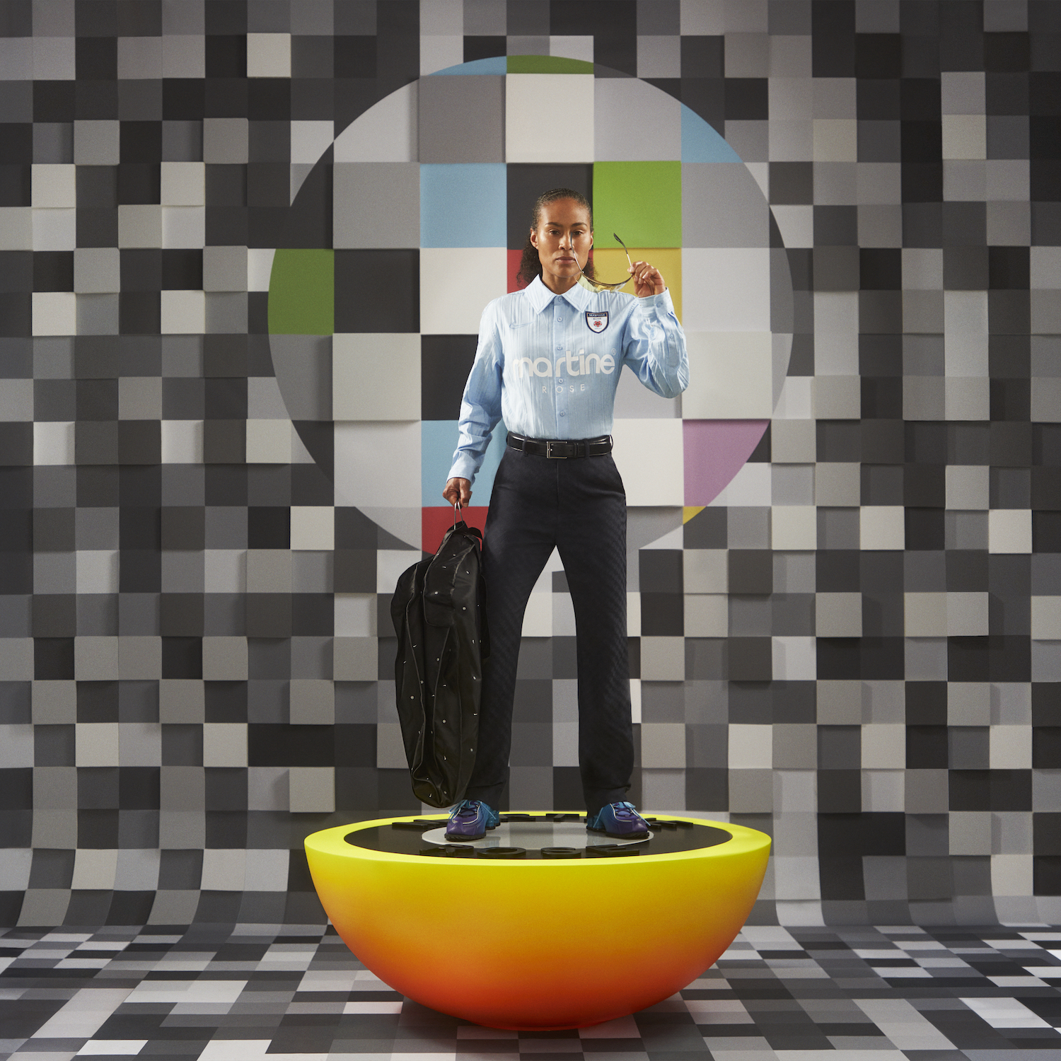 Similarly, Martine Rose, who dressed the US women’s team pre-match in gender-free suiting designed in collaboration with Nike (which was then released as a sell-out capsule), has long co-opted football culture to make gentle nods to something more political, something more fringe in her designs. Her iconic reversible design for England’s 2021 Euros kit, entitled The Lost Lionesses, drew upon the tradition of football jerseys as a symbol of protest to focus present attention on continuing issues of gender inequality in the sport.