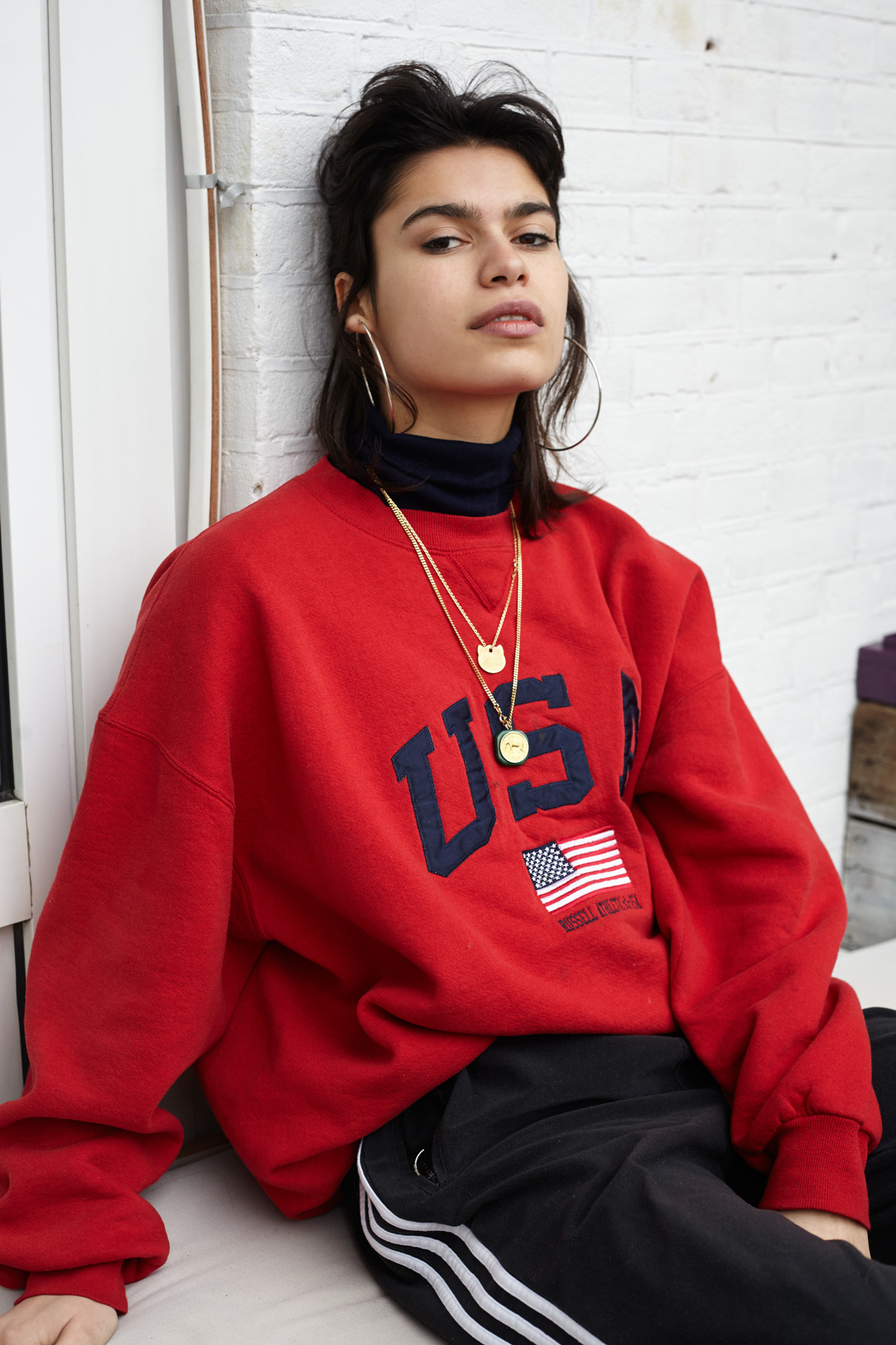 I’m wearing Adidas track pants, a gift from my boyfriend – I wear them a lot. My turtleneck is vintage from Teens and the USA sweater is vintage as well. That one was a gift from a friend. My grandmother gave me the jewellery, they are from Congo, where she came from.