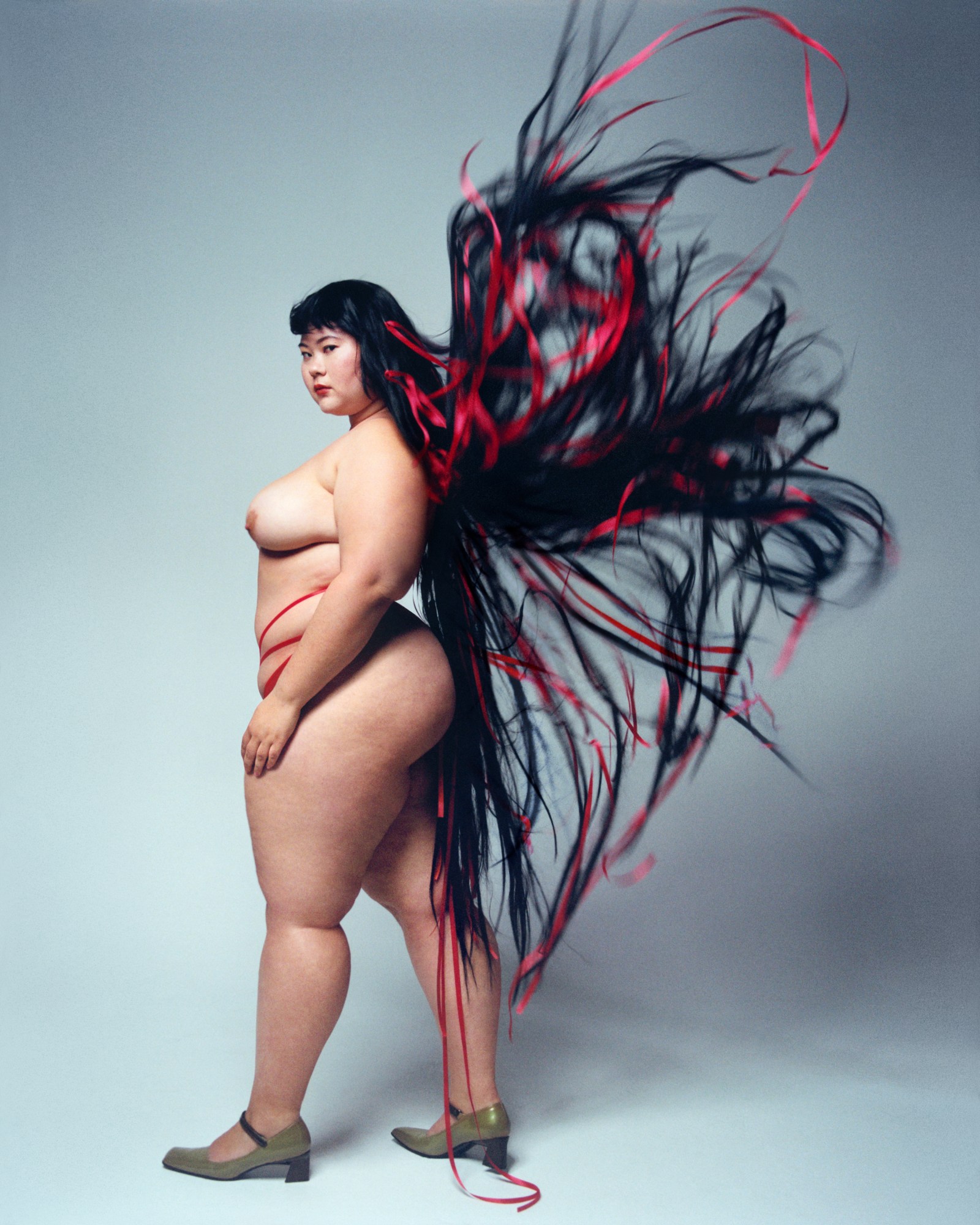 The result is Year of the Dragon, a celebration of Asian culture, beauty and sexuality. The motif of the dragon weaves through every detail of the object; in its design, the models’ styling, their makeup and body language. In China, the dragon is commonly associated with the male yang energy, but as journalist Zing Tseng writes in her introduction: “Let’s not torture mystical creatures with our binary notions of masculinity. For our purposes, this dragon is a she/her.” We see spiky pubic hair, snakebite piercings and full-body irezumi tattoos. Dragons emerge as giant sand sculptures, and their fiery breath as red ribbons erupting out of jet black hair. Embodying the celestial, enigmatic and captivating spirit of the creature, we see how female eroticism can manifest in images that are both confident and tender; proud and delicate; yin and yang. “When I think specifically about Asian women, we’re often locked in this binary of hypersexual or submissive,” Alex says. “Every woman has a different idea of how they want to celebrate their sexuality and their body.”