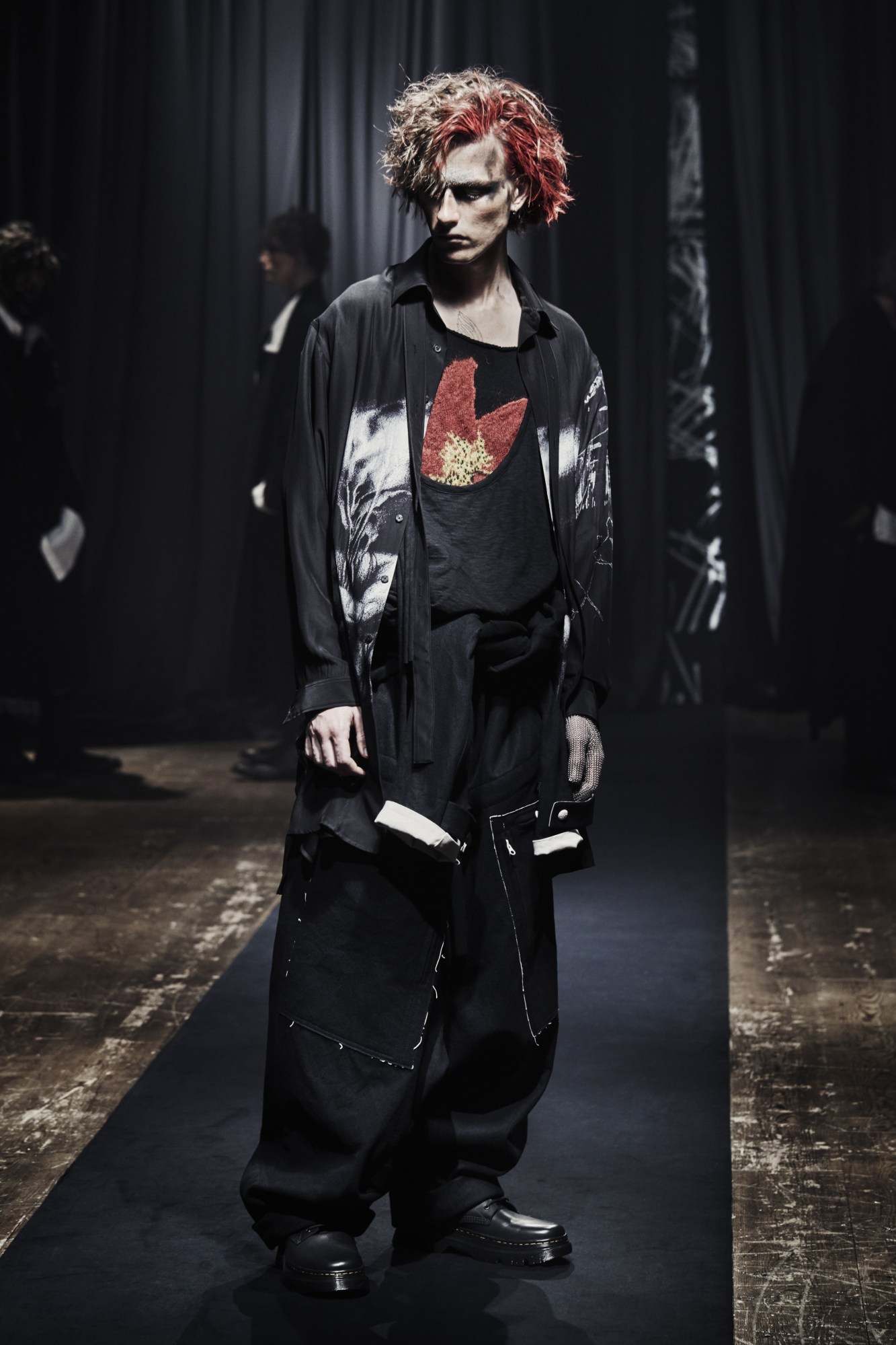 Counterposing these visual metaphors for entrapment were loose, breezy silk shirt-and-half-trouser combos, printed with expressive painterly blotches and guitar headstocks — a foil to the presentation’s steely, twanging soundtrack, carried along by the gravelly timbre of Yohji-san’s own voice — not to mention the designer’s impeccable baggy tailoring in reassuringly weighty cotton velvet. The liberty these pieces implied took a turn for the explicitly punkish spirit he’s well known for in the pithy slogans printed throughout: phrases including “I am proletariat”, “You have to take me to hell” and “Born to be terrorist”.