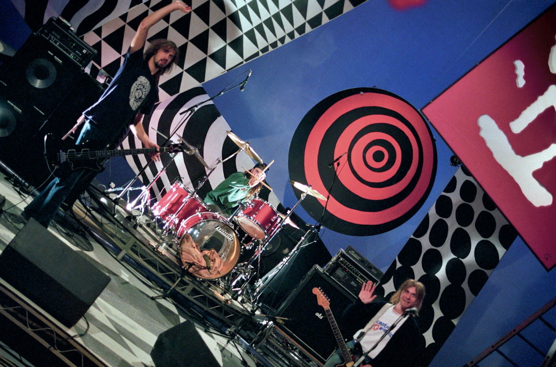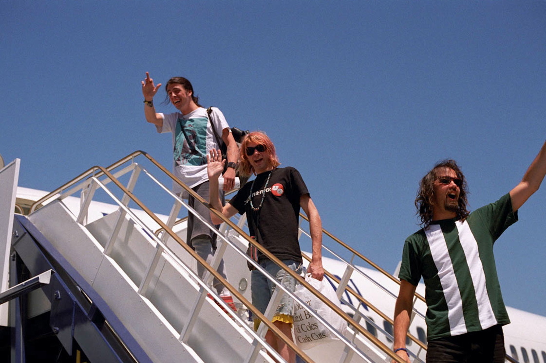 ArtNet reported this morning that Glenn Green Galleries will open On the Road and in the Studio with Nirvana, an exhibition of personal photographs shot by by Nirvana bassist Krist Novoselic’s former wife, photographer Shelli Hyrkas. Hyrkas’ photos span from a shot of Kurt, Krist, and Chad Channing (the band’s pre-Dave Grohl drummer) on tour in London back in 89; all the way through Halloween 93, when Kurt dressed up as Barney the Purple Dinosaur. There are snaps of the band boarding an airplane Beatles-style, behind the scenes of a Rolling Stone shoot in Australia, even a few of the band setting up to record Nevermind.
