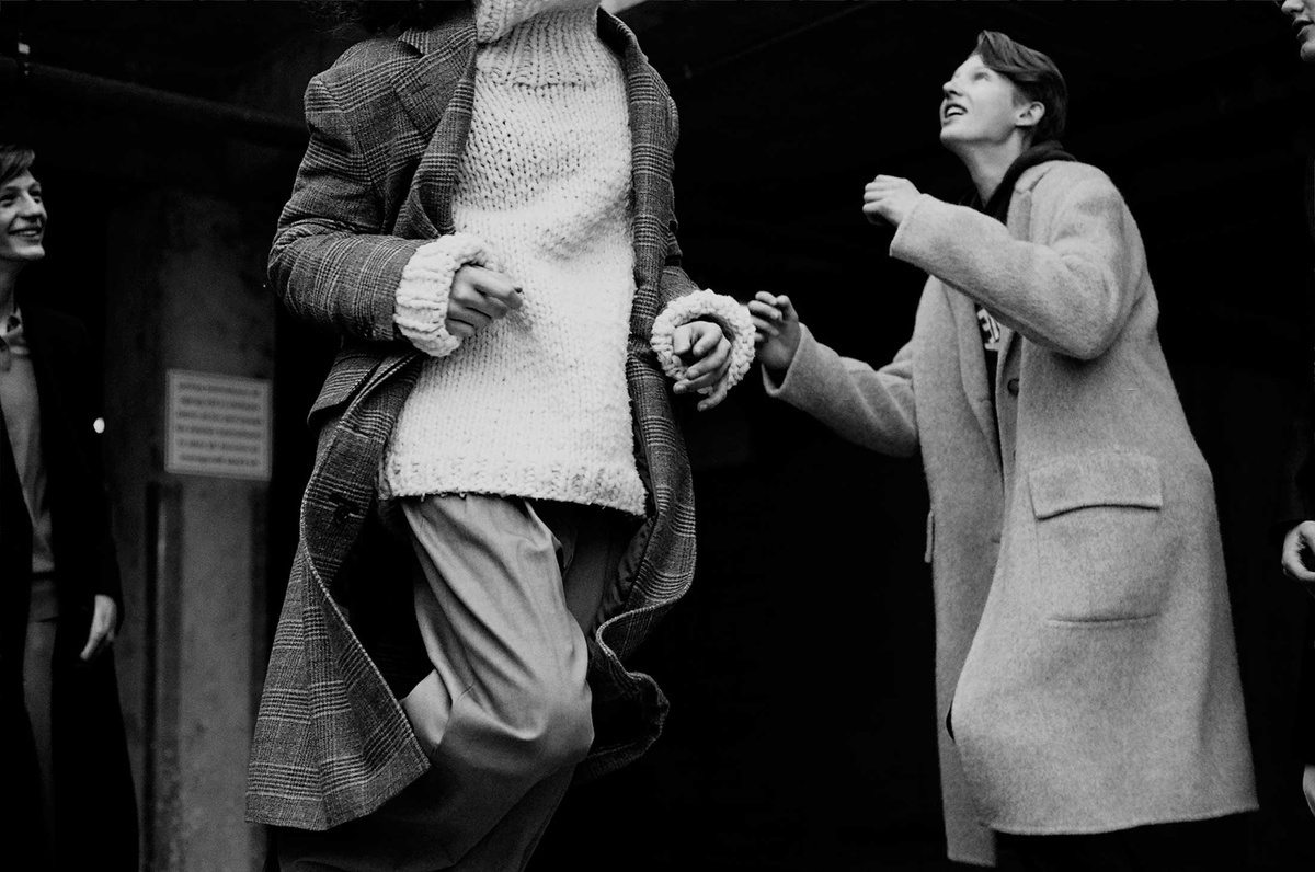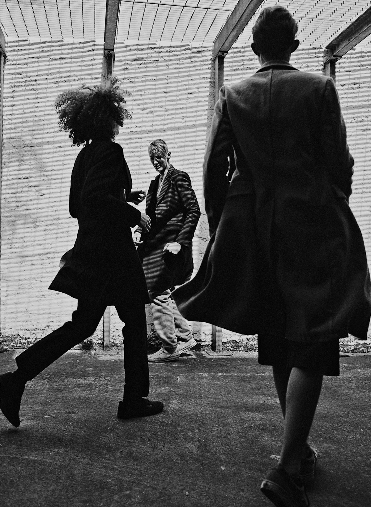 George lleva abrigo y jersey Maison Martin Margiela. Pantaln Calvin Klein Collection. Zapatos del modelo.Felix lleva abrigo Prada. Trousers Uniqlo. Zapatos del modelo. Finnlay lleva abrigo Damir Doma. Camisa Lyle & Scott. Pantaln Louis Vuitton, Zapatos del modelo.