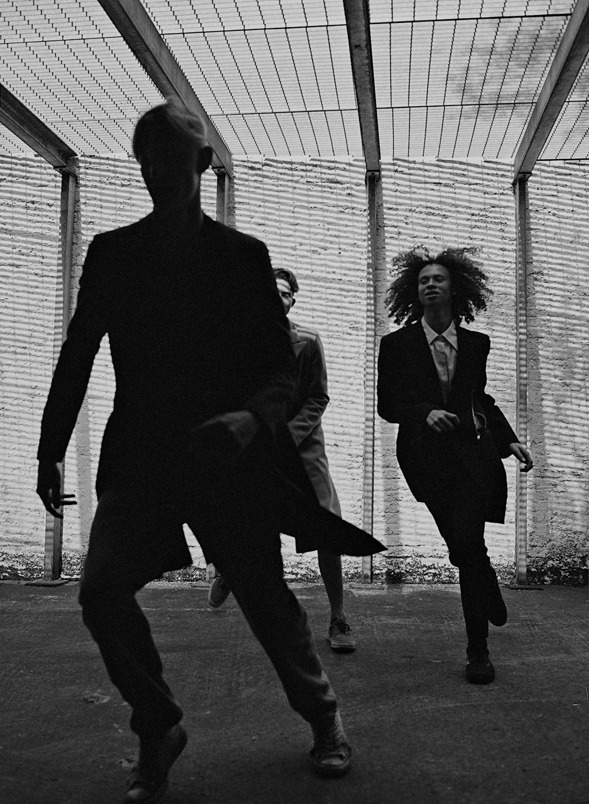 Felix lleva abrigo Prada. Jersey Beyond Retro. Pantaln Uniqlo. Zapatos del modelo. Max lleva ropa Dries Van Noten, Zapatos del modelo. George lleva ropa Comme Des Garcons.