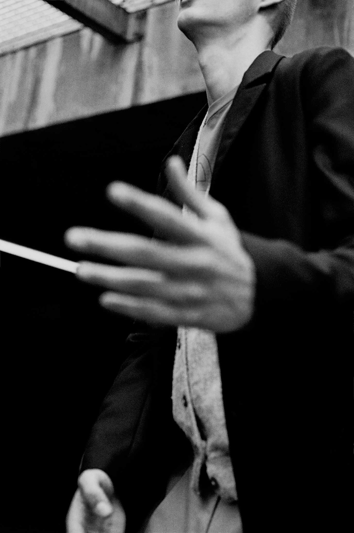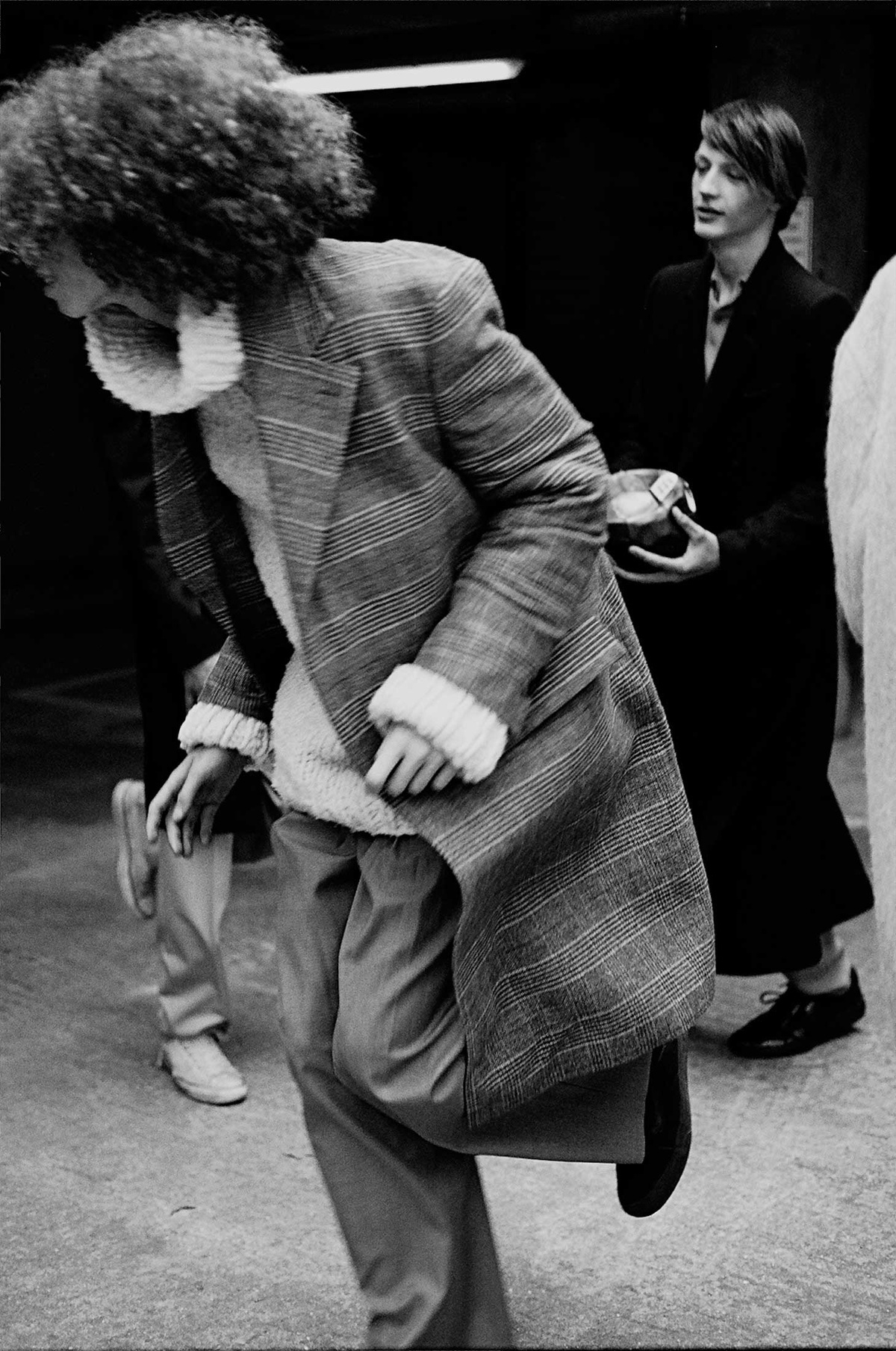 George lleva abrigo y jersey Maison Martin Margiela. Pantaln Calvin Klein Collection. Zapatos del modelo.