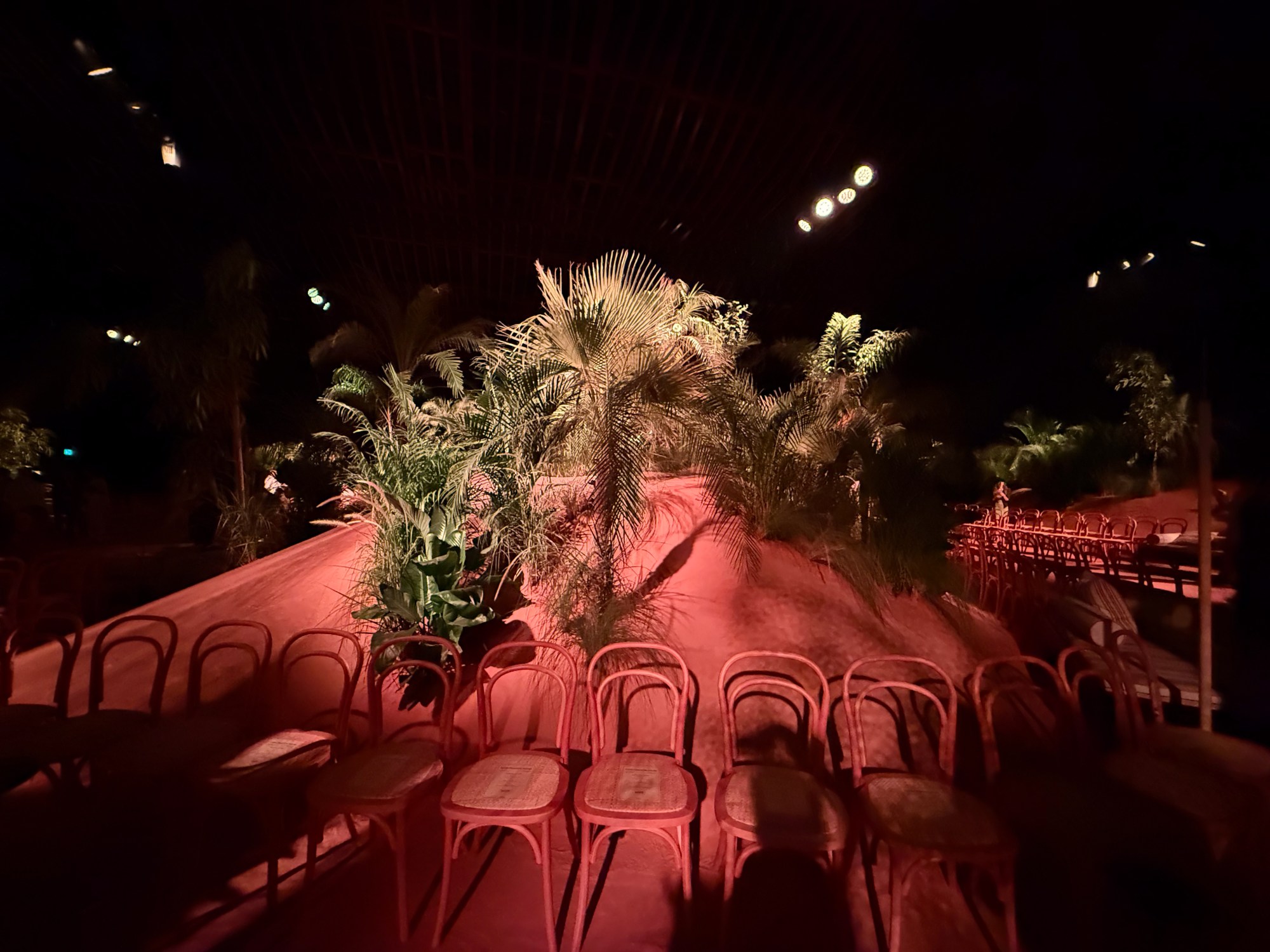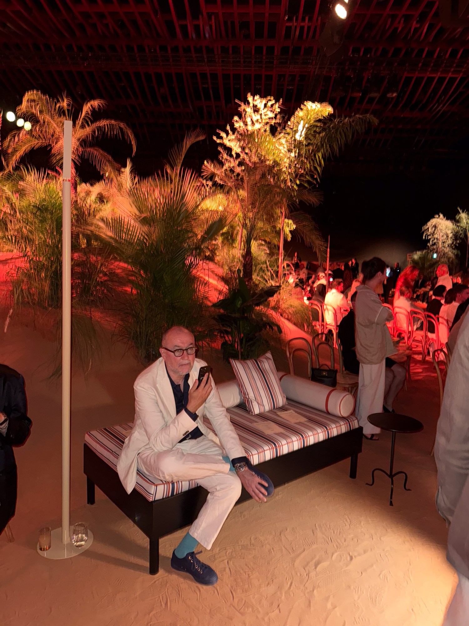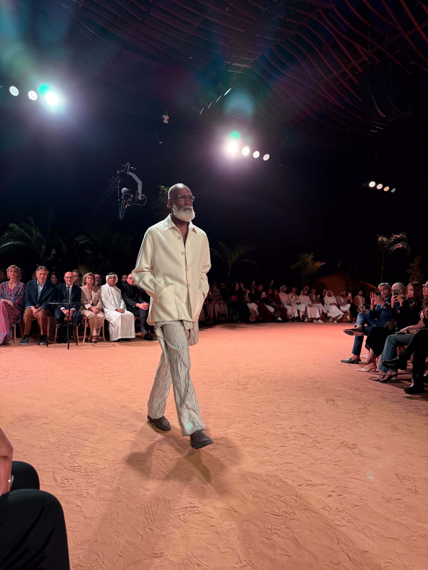 The Dubai Opera was fully transformed into Villa Zegna. The space was filled with sand, stone, and desert flora. Staff wore khaki short-suits that looked like luxury boy scout uniforms. I wanted one. Badly. The show itself felt like a mirage you could wear. Alessandro Sartori delivered a collection rooted in texture, movement, and memory—pajama-striped suits, washed poplin layers, and action-shouldered outerwear in featherlight wools and technical silks. Some models walked barefoot, moccasins in hand—a detail I flagged early as key to the shot. “Feet are, like, so back.” It grounded the whole collection, both literally and emotionally.