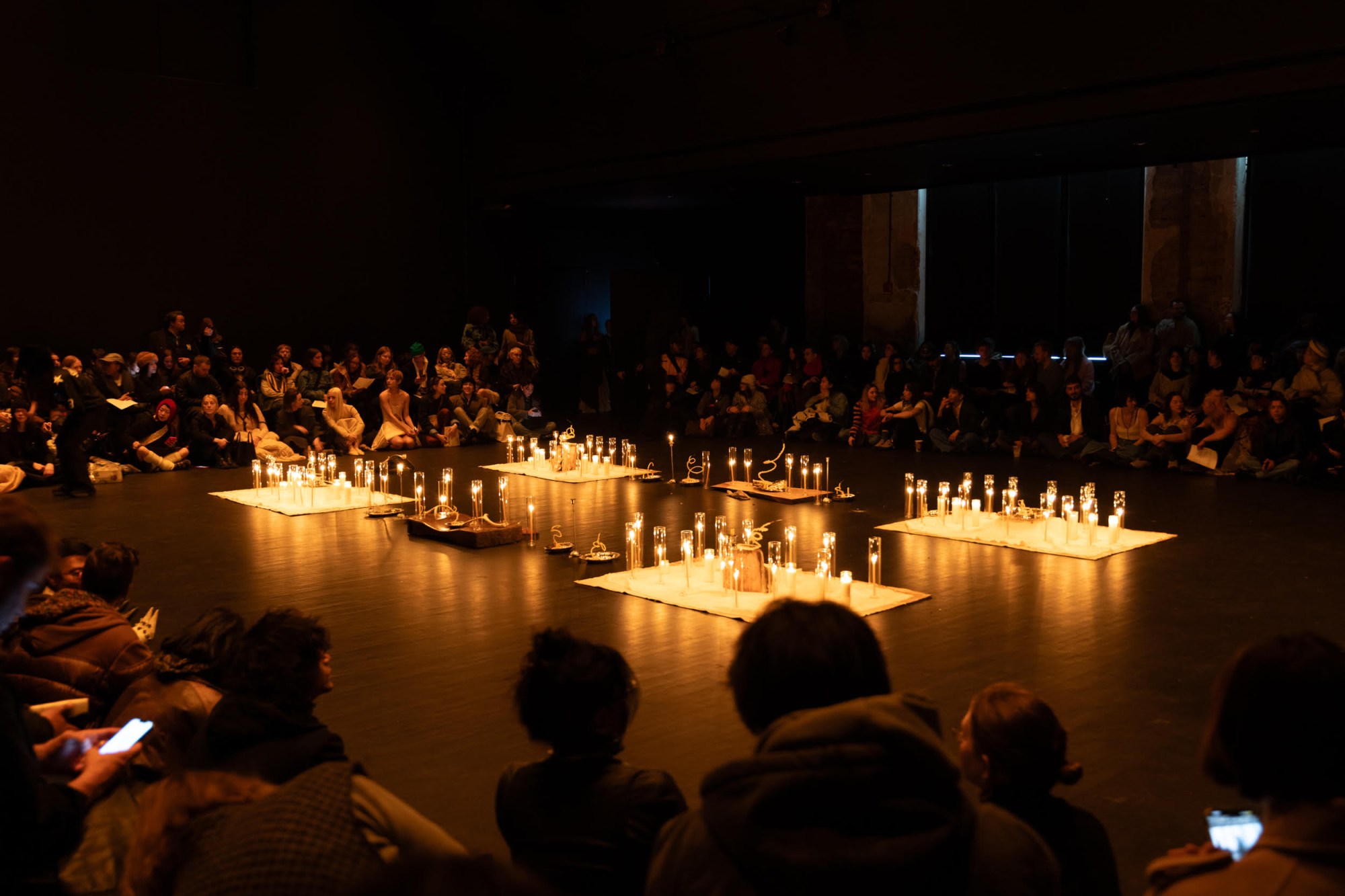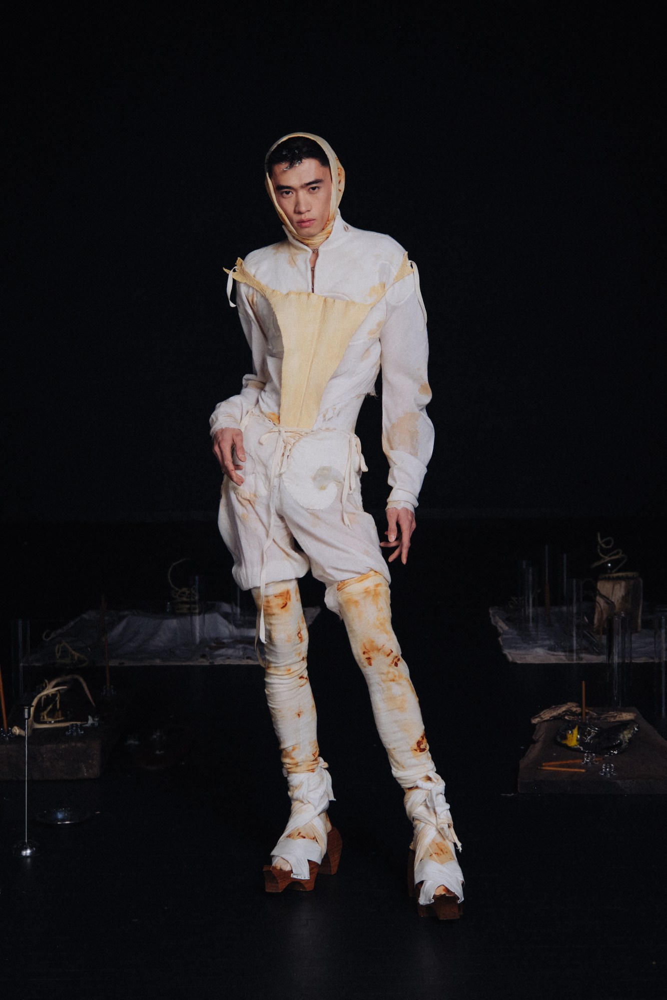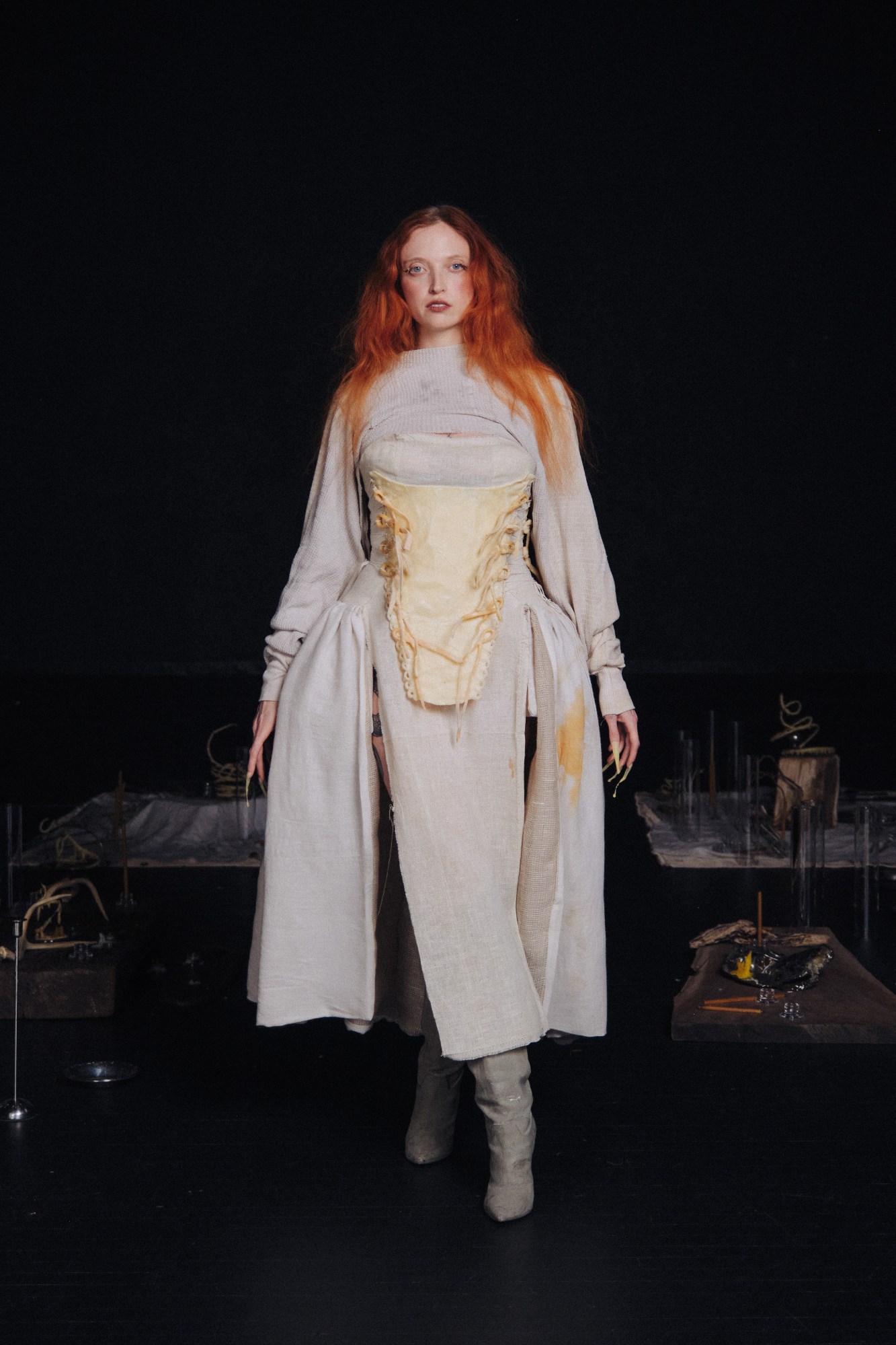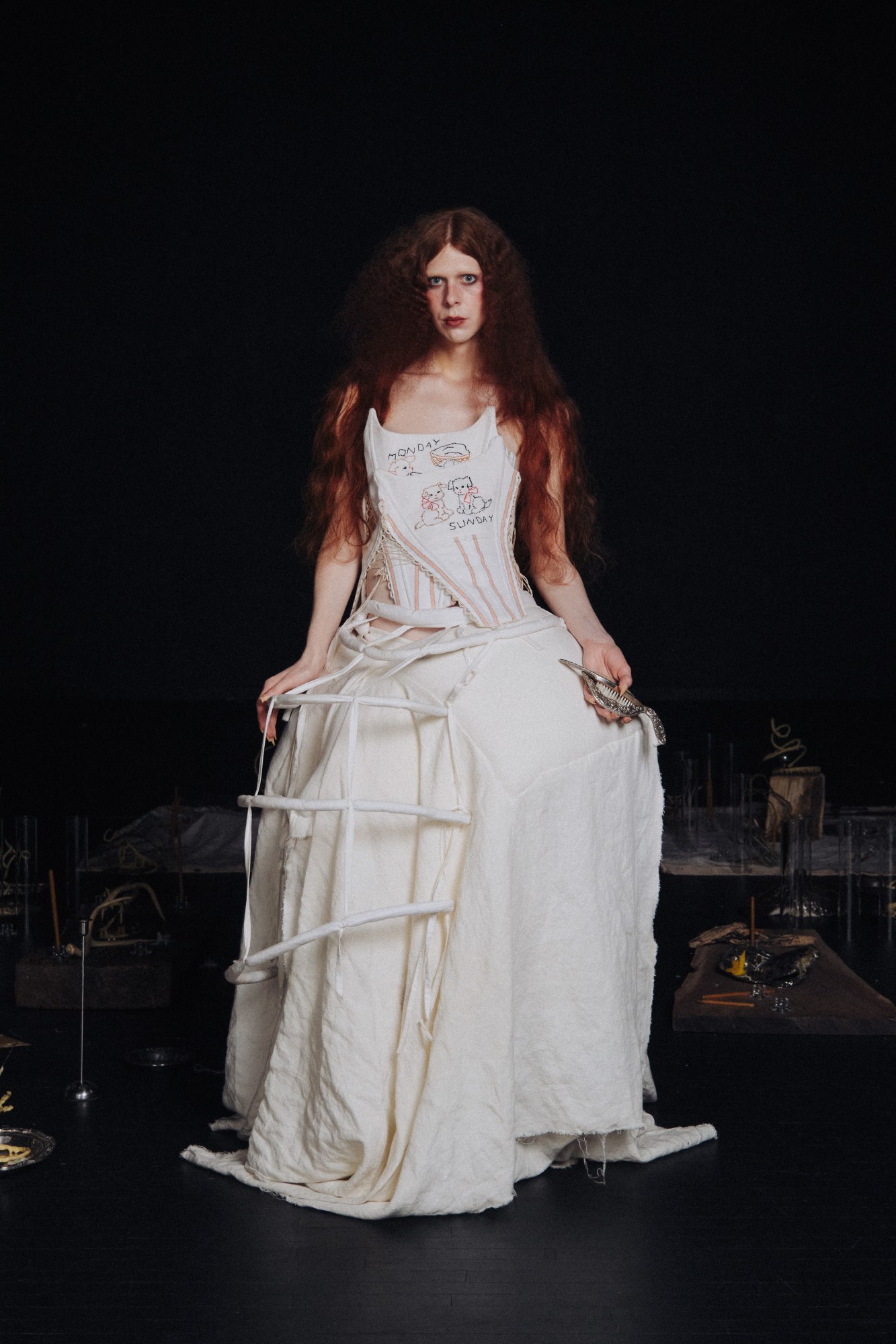 Honoring this collective spirit, Whalen forgoes the post-show bow in favor of partaking in her own shows—at her SS25 event she papier-mâché’d a dress onto a model’s body. “It feels correct to participate if I’m asking that of others, especially since what I’m trying to communicate is so personal,” the soft-spoken designer says. For the conclusion of her AW25 presentation, Whalen took it upon herself to extinguish all 100 largely handmade candles, a slow and arduous process. Once she blew out the last one with an audible huff, the room sat together in a moment of darkness. “I like inserting something unglamorous into this space of fantasy,” Whalen says. “I’m very much just a person making stuff in a room so introducing that energy allows people to bear witness to how real it is.”